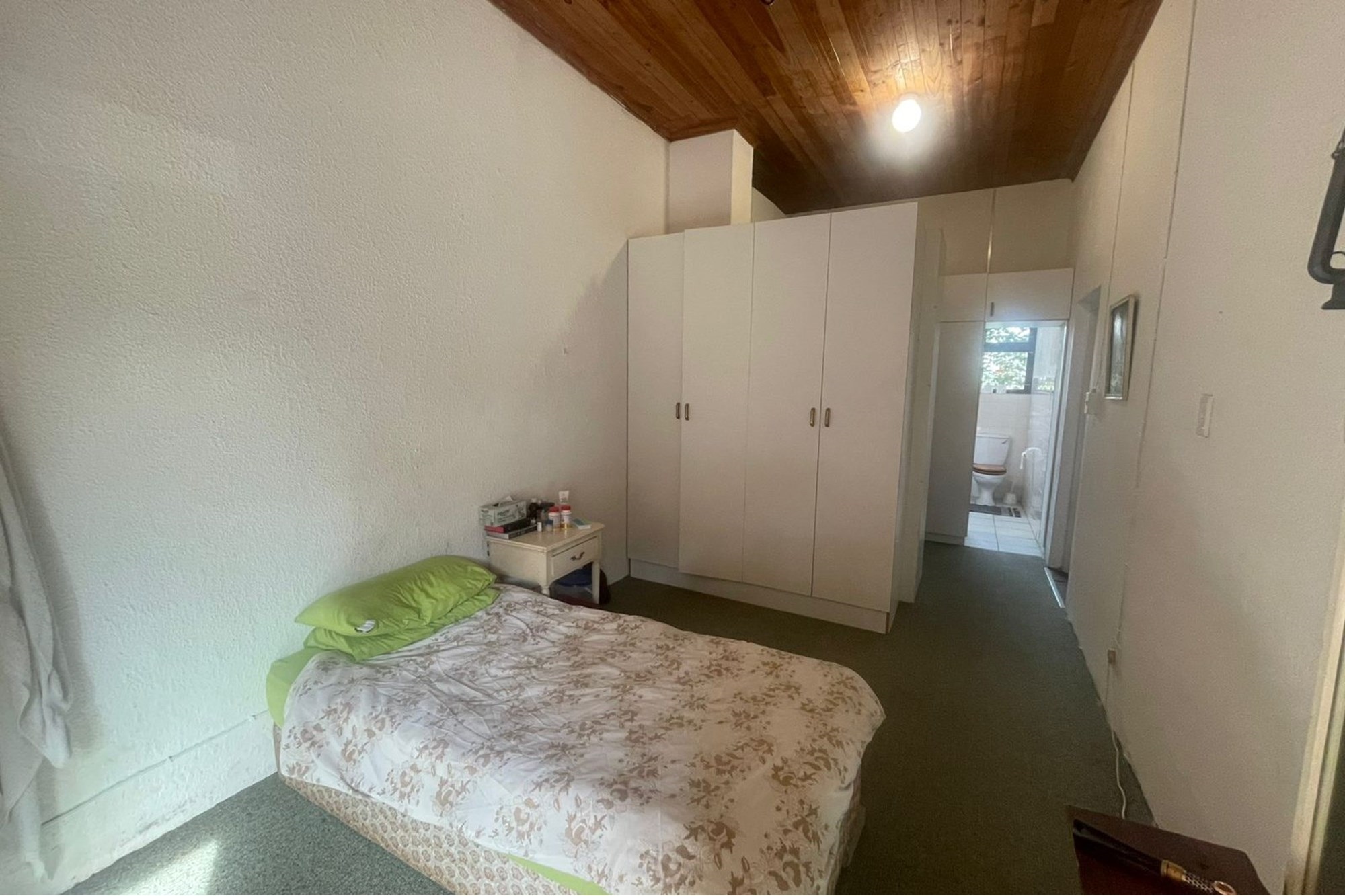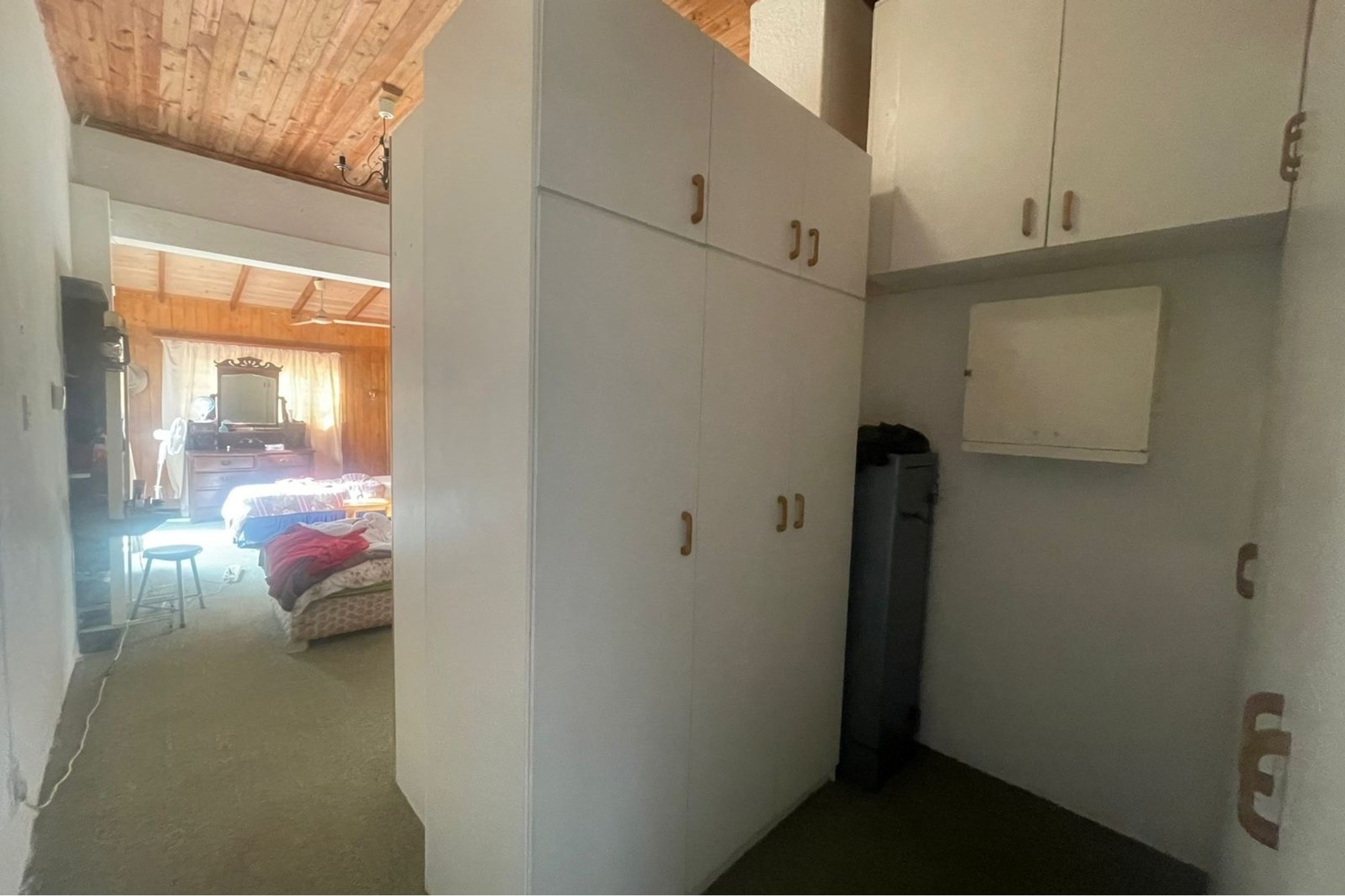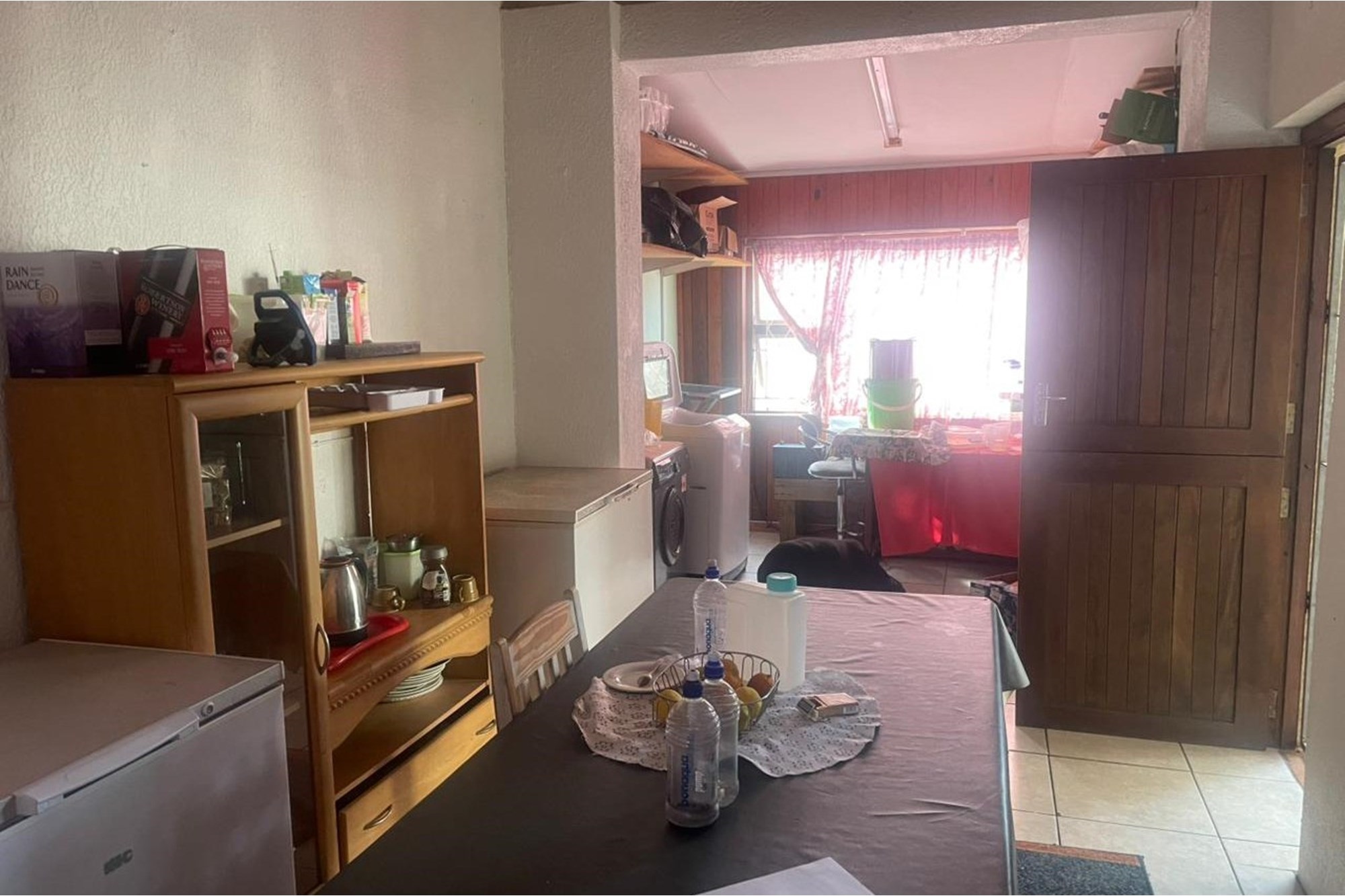 Enter through a welcoming patio into an inviting entrance hall, leading to a versatile space that can serve as a second kitchen or laundry area. A passageway connects to four generously sized bedrooms; each fitted with built-in cupboards and doors that open onto a sheltered outdoor area. The master bedroom boasts an abundance of cupboard space and a private en-suite bathroom with a shower, basin, and toilet. A full family bathroom conveniently services the remaining bedrooms.