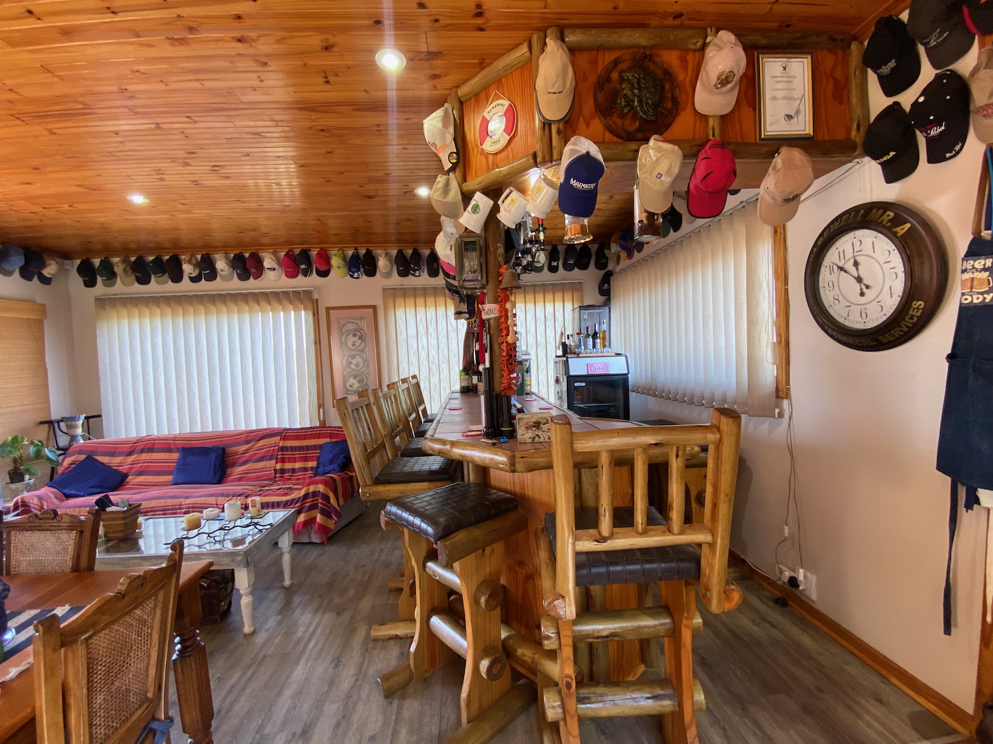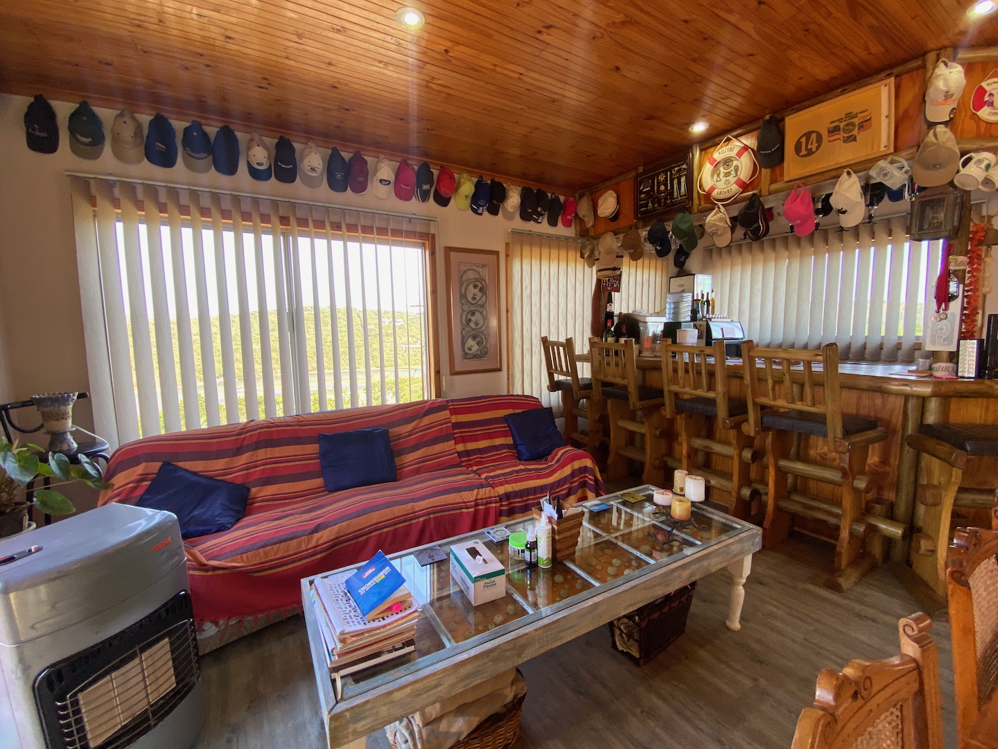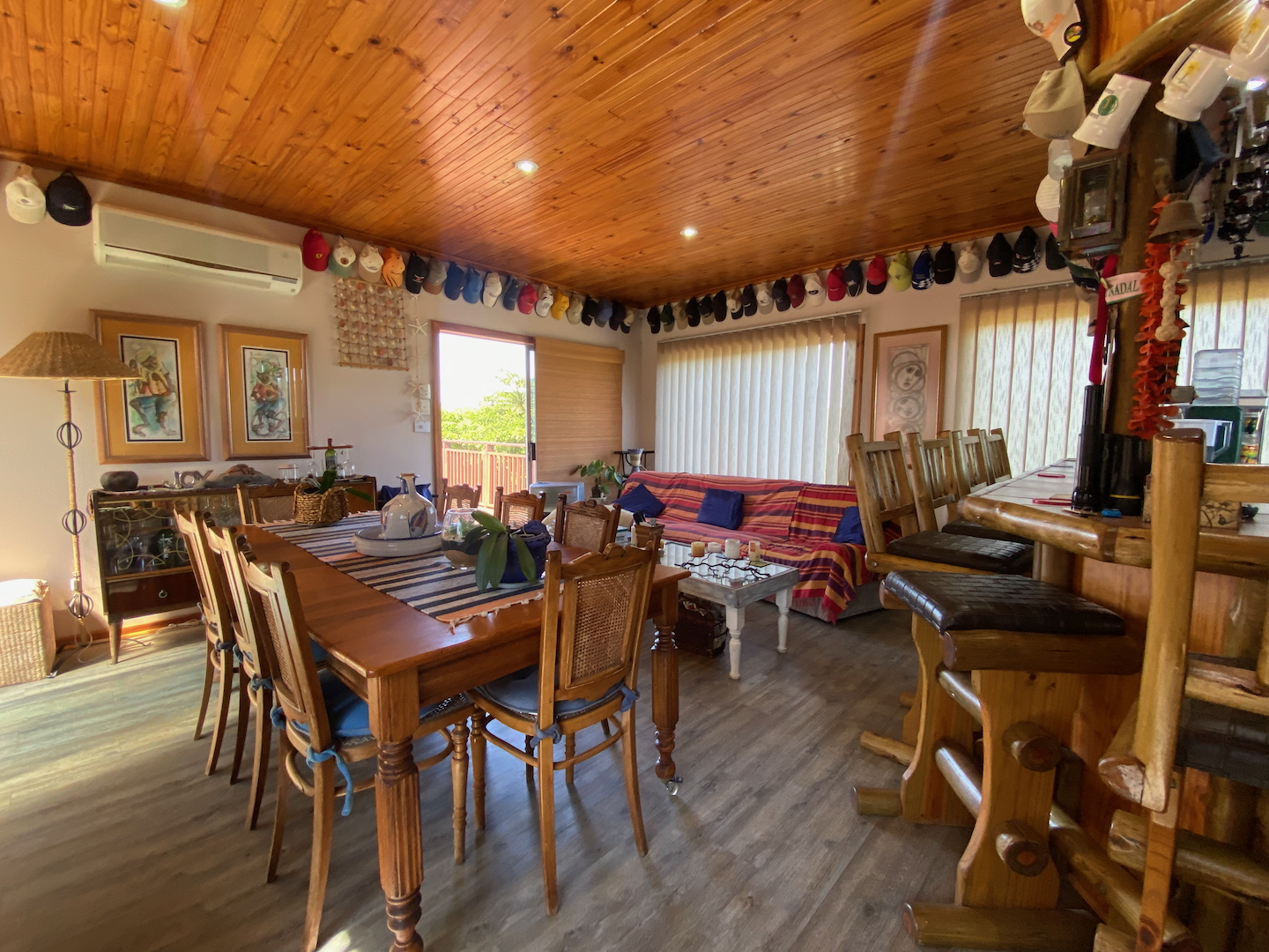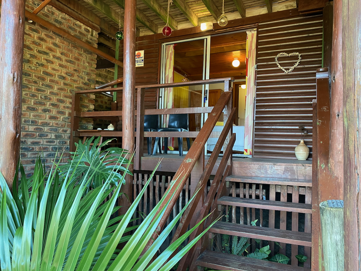 Upstairs, you'll find the owner's residence, featuring a lovely open-plan living area that flows into a compact kitchen. The main bathroom is complete with an instant heat shower. Three bedrooms, all with built-in cupboards, provide adequate space for your family. The main bedroom boasts an en-suite bathroom and a sliding door that opens onto a deck which stretches across the front of the house, connecting to a delightful entertainment room equipped with a built-in braai, bar, and prep bowl—ideal for entertaining friends or enjoying sporting events.