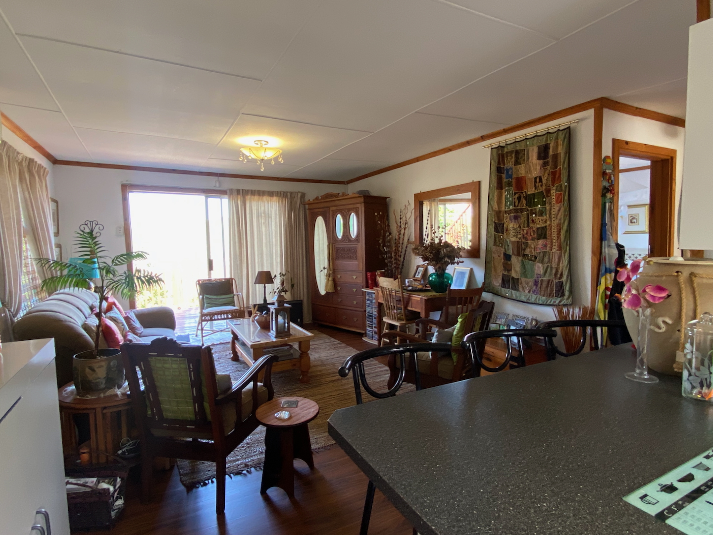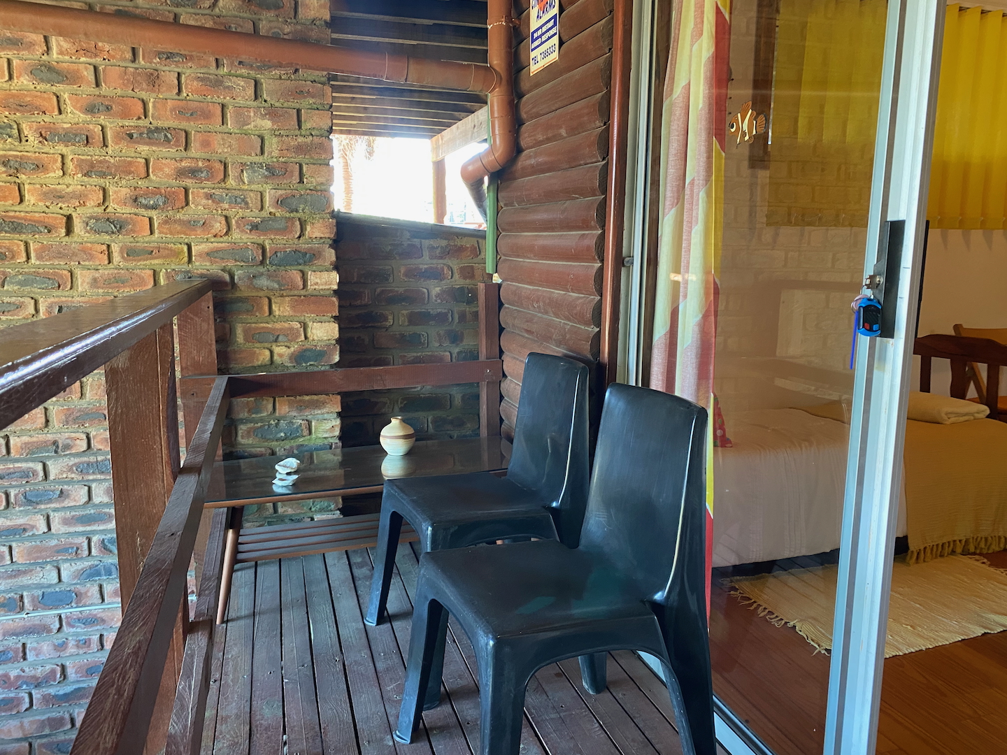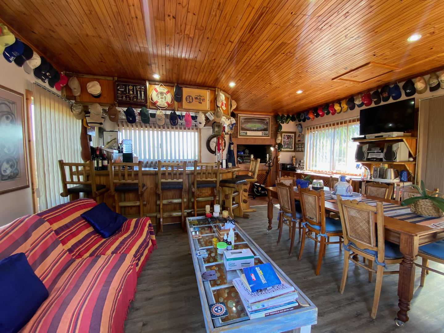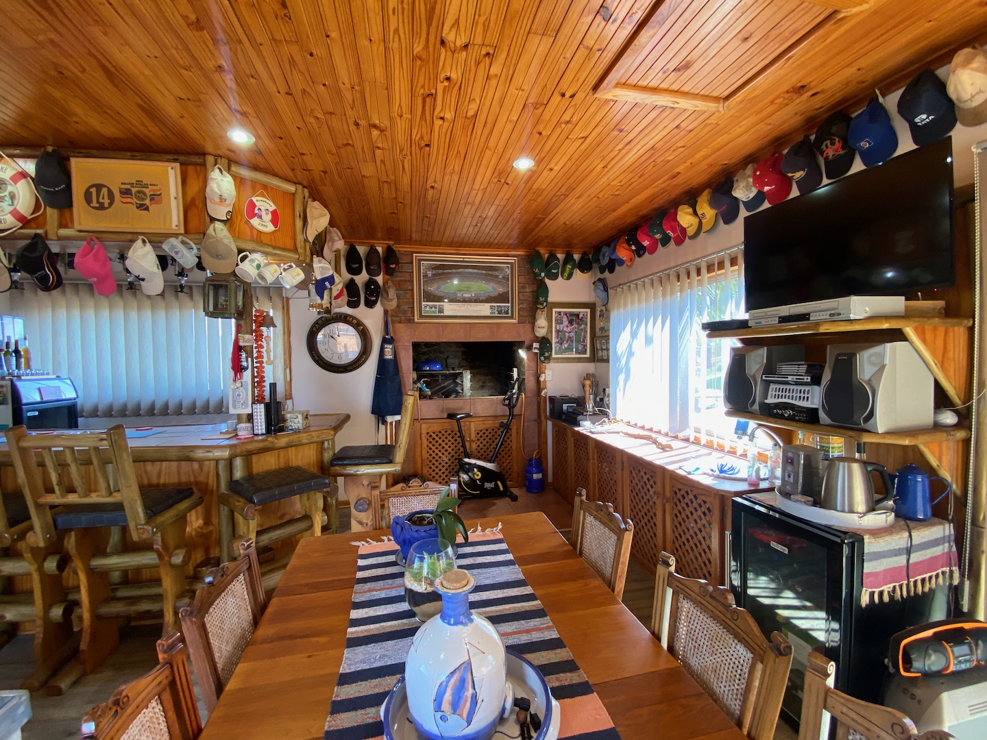 Upstairs, you'll find the owner's residence, featuring a lovely open-plan living area that flows into a compact kitchen. The main bathroom is complete with an instant heat shower. Three bedrooms, all with built-in cupboards, provide adequate space for your family. The main bedroom boasts an en-suite bathroom and a sliding door that opens onto a deck which stretches across the front of the house, connecting to a delightful entertainment room equipped with a built-in braai, bar, and prep bowl—ideal for entertaining friends or enjoying sporting events.