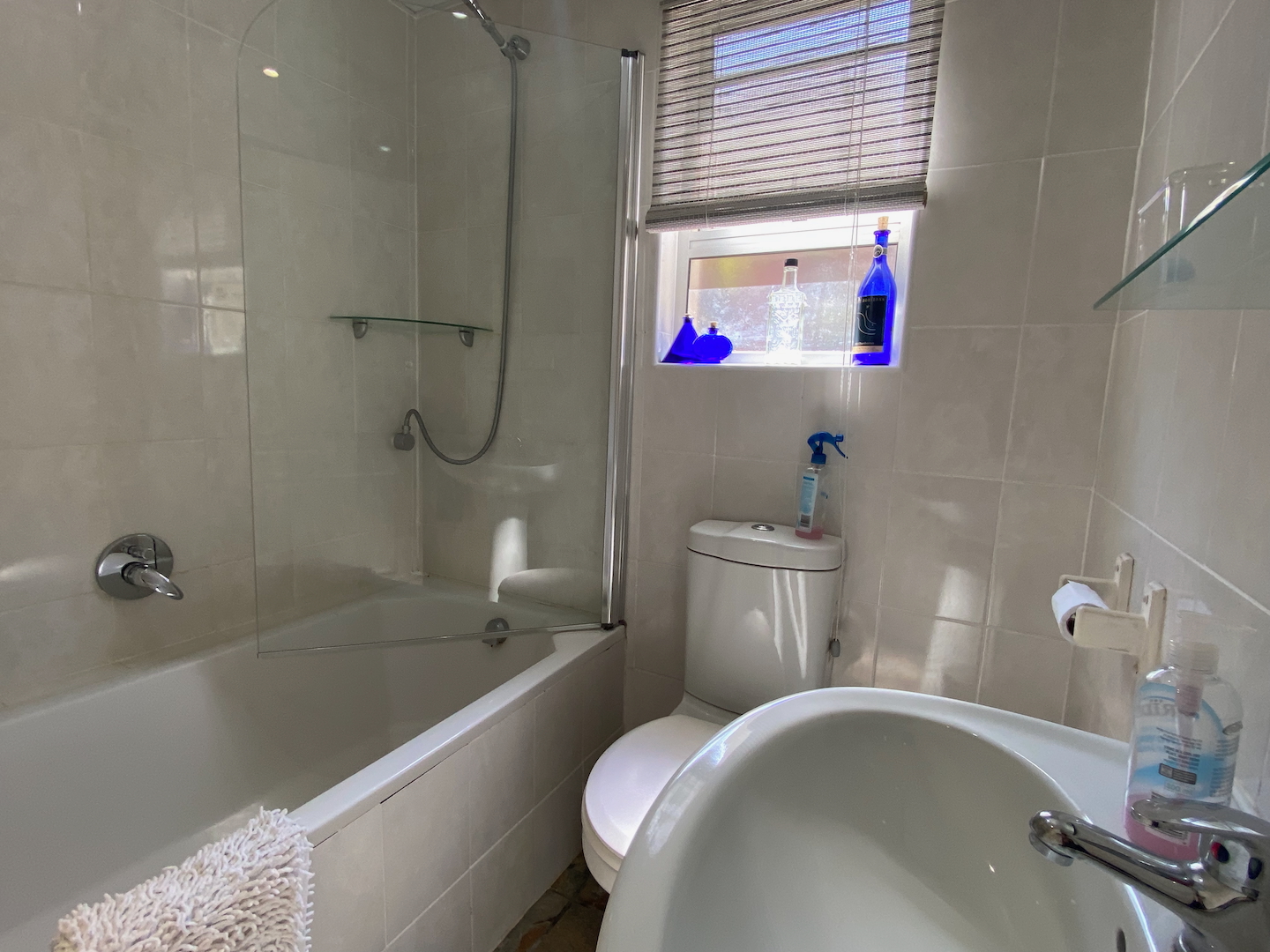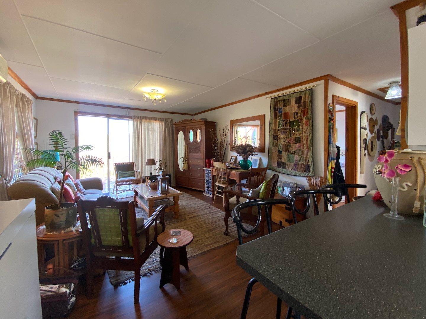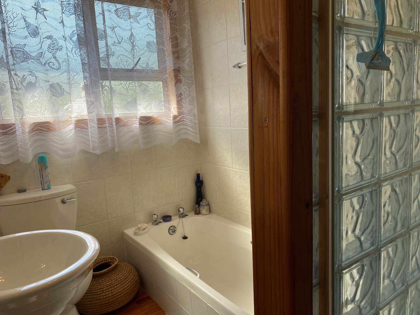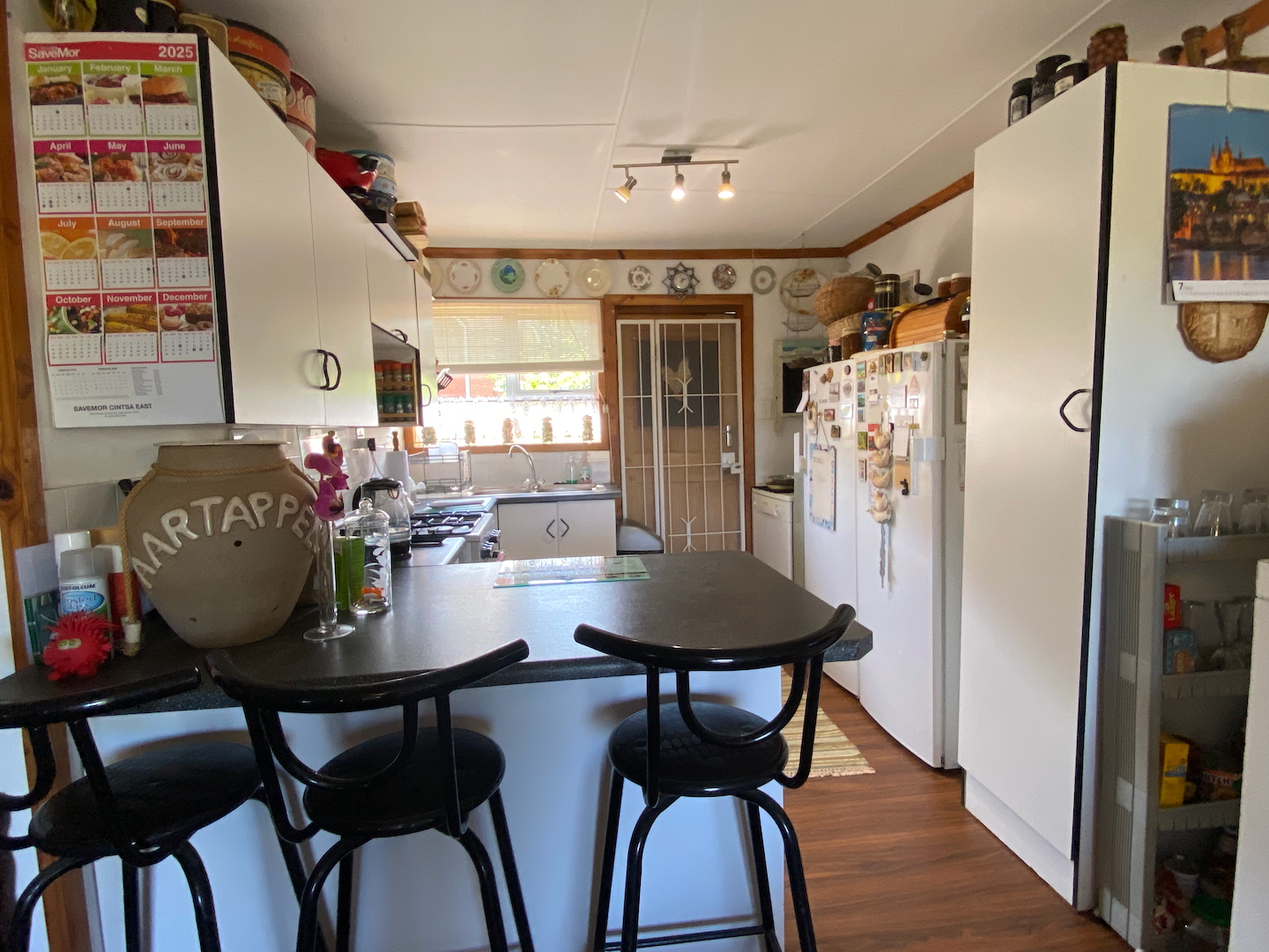 Upstairs, you'll find the owner's residence, featuring a lovely open-plan living area that flows into a compact kitchen. The main bathroom is complete with an instant heat shower. Three bedrooms, all with built-in cupboards, provide adequate space for your family. The main bedroom boasts an en-suite bathroom and a sliding door that opens onto a deck which stretches across the front of the house, connecting to a delightful entertainment room equipped with a built-in braai, bar, and prep bowl—ideal for entertaining friends or enjoying sporting events.