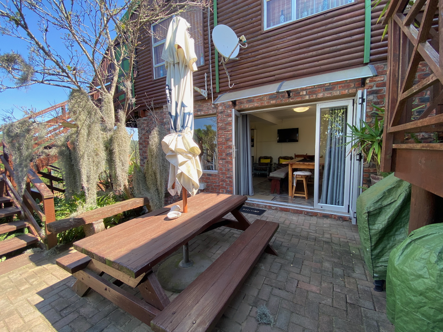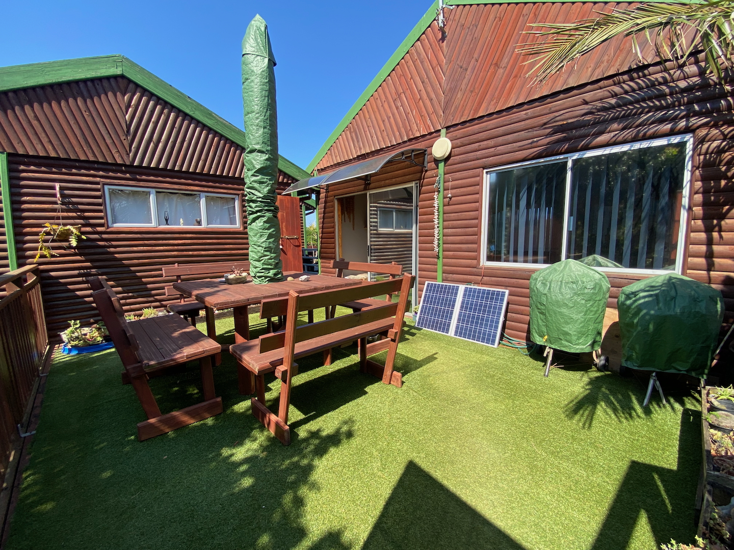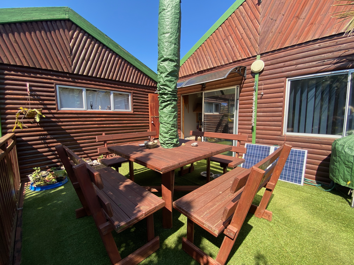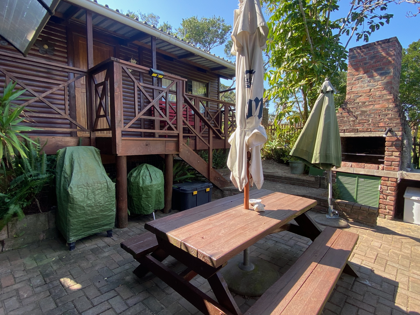 As you enter through two motorized gates, you'll find gated parking space for up to four vehicles. The main unit features a well-appointed kitchen and a scullery equipped with a washer, dryer, and dishwasher. The open-plan design seamlessly connects the dining and lounge areas, leading to a charming paved area complete outdoor table and a built-in braai. This main unit includes a comforable bedroom and a separate bathroom with a shower over the bathtub.