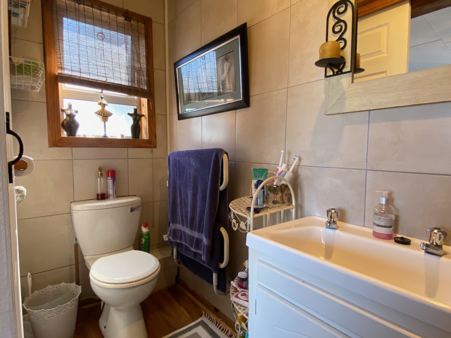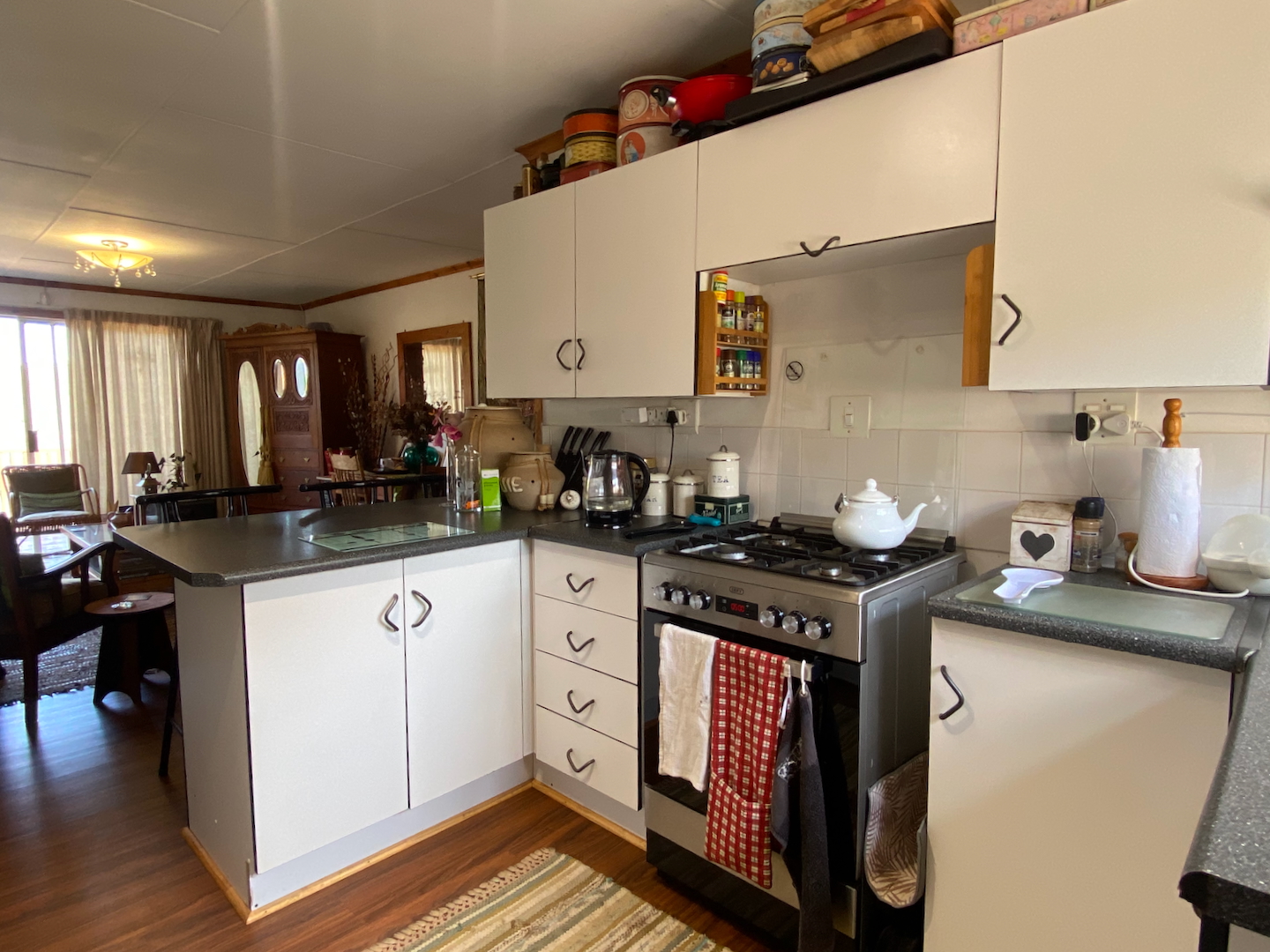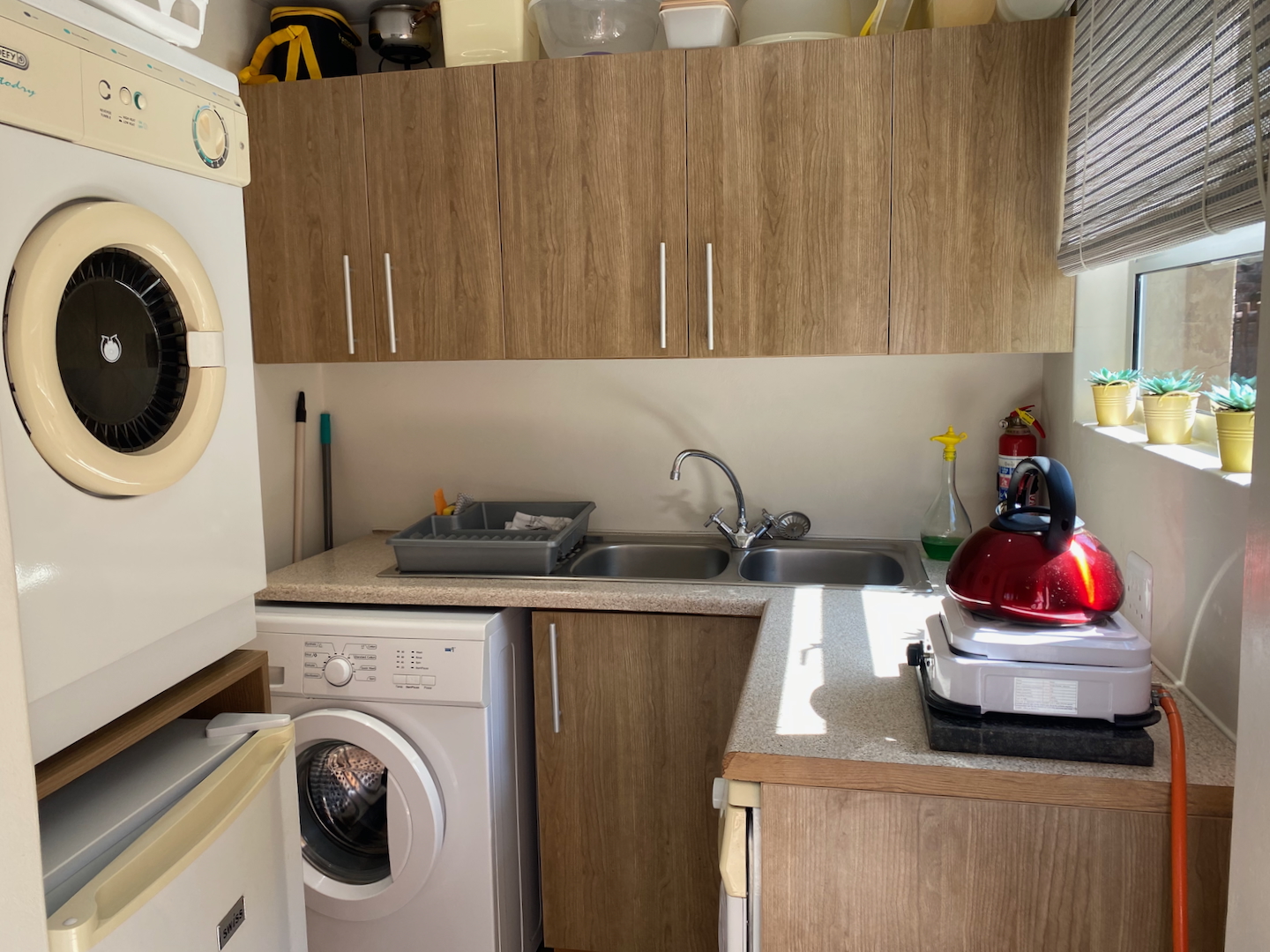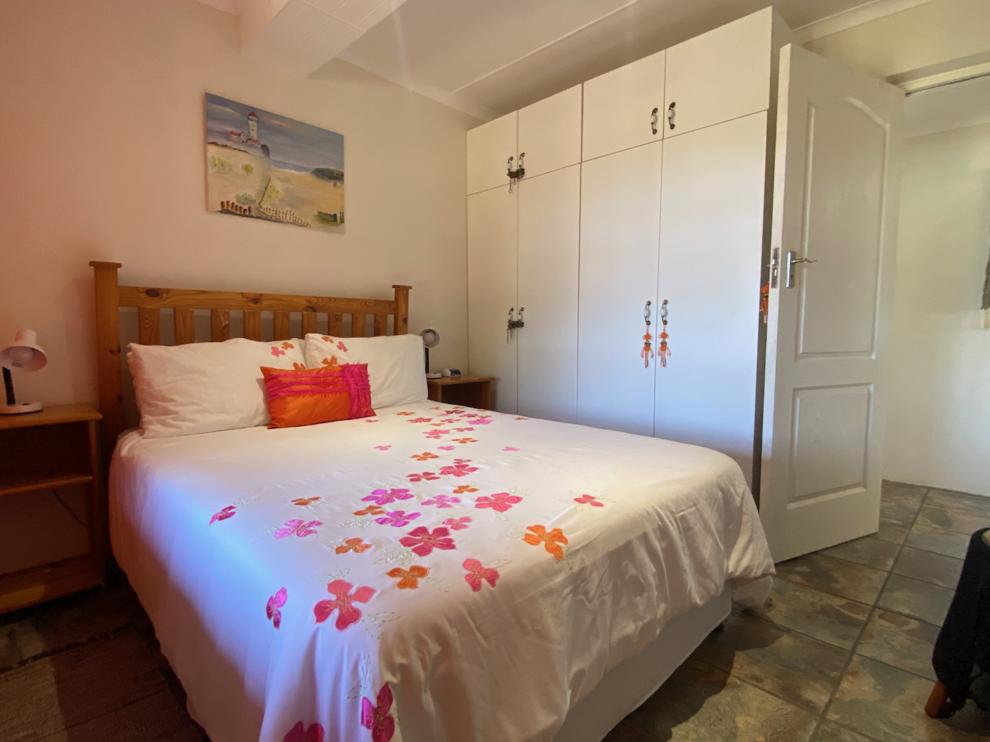 As you enter through two motorized gates, you'll find gated parking space for up to four vehicles. The main unit features a well-appointed kitchen and a scullery equipped with a washer, dryer, and dishwasher. The open-plan design seamlessly connects the dining and lounge areas, leading to a charming paved area complete outdoor table and a built-in braai. This main unit includes a comforable bedroom and a separate bathroom with a shower over the bathtub.