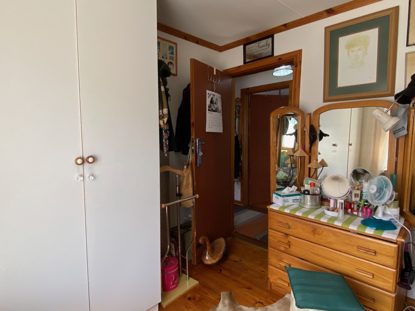 Further to the left, there's another en-suite room with a double bed and single bunks, along with a tea station and bar fridge.
