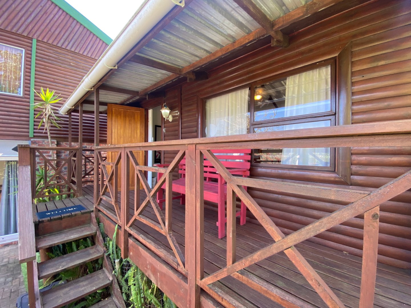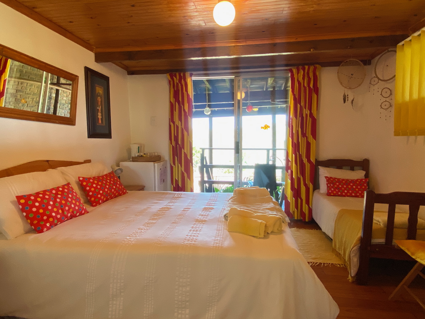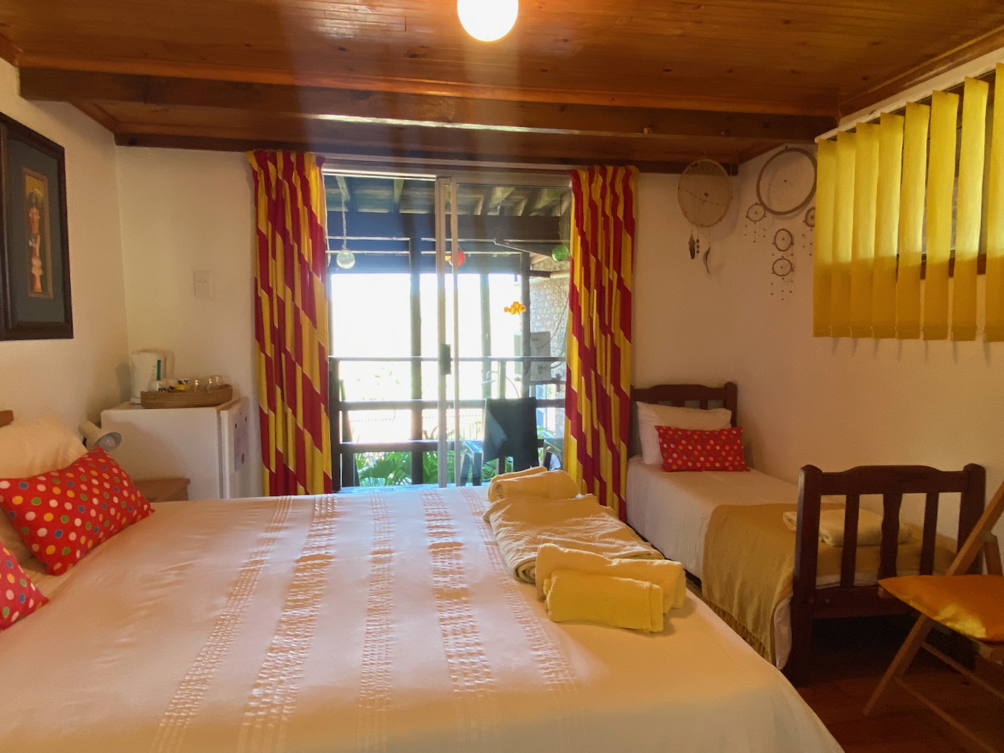 To the left of the main unit, you'll discover a secluded beach shower, nestled behind fan palms, providing a delightful tropical outdoor experience. The entrance to the second free-standing room is up a few stairs and also features a little deck for relaxation. This cheerful room includes a double bed, a child's bed, a bar fridge, a tea station, and an en-suite bathroom.