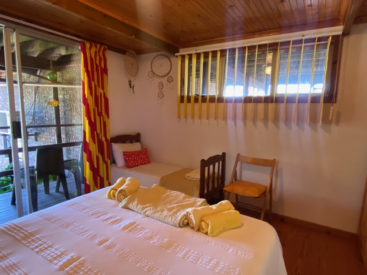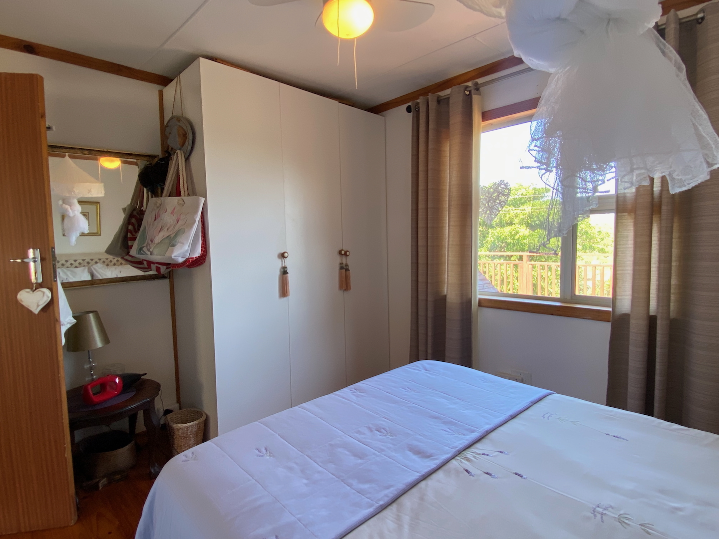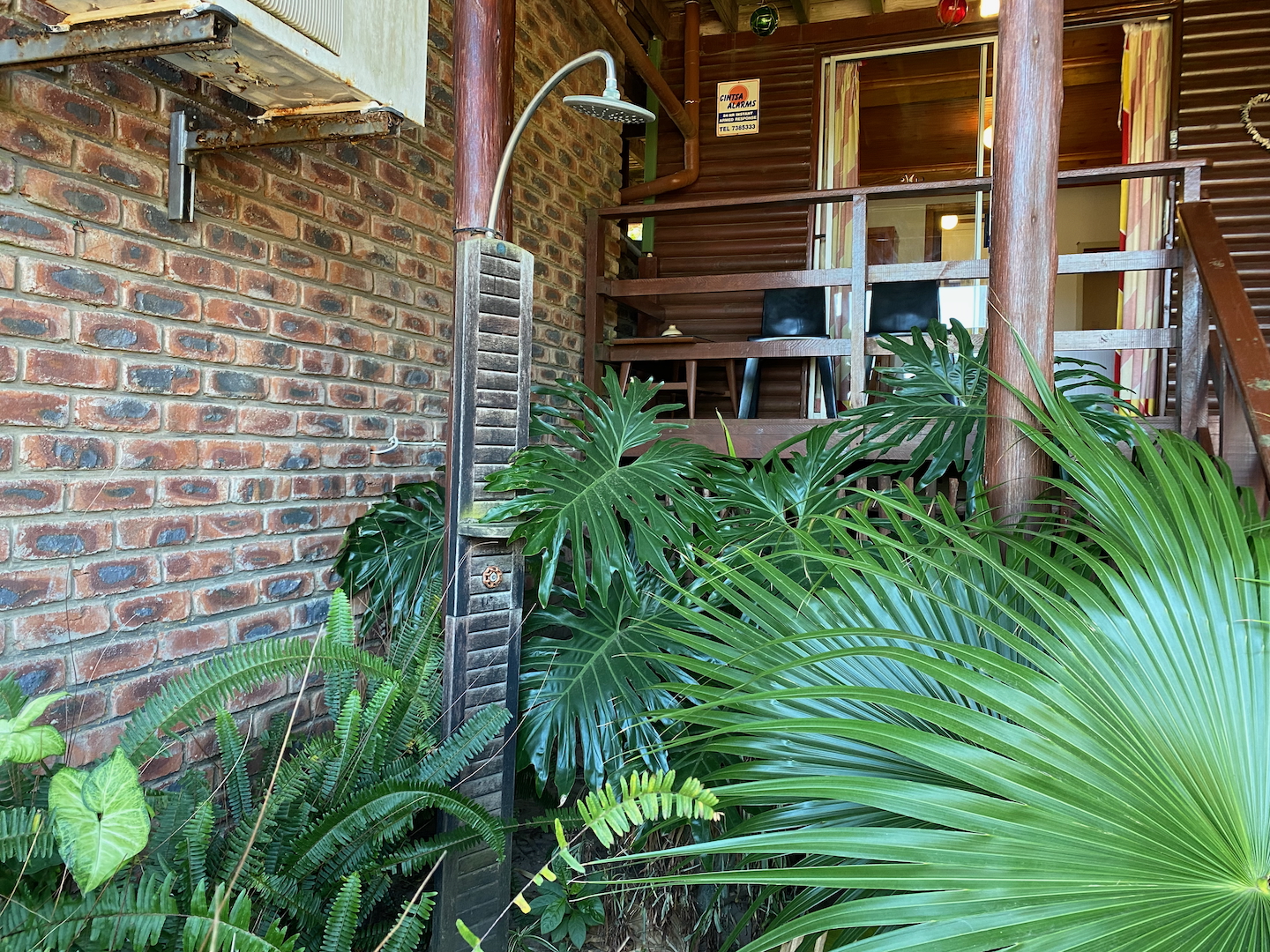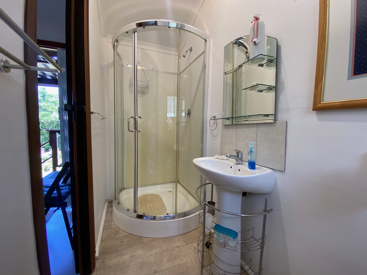To the left of the main unit, you'll discover a secluded beach shower, nestled behind fan palms, providing a delightful tropical outdoor experience. The entrance to the second free-standing room is up a few stairs and also features a little deck for relaxation. This cheerful room includes a double bed, a child's bed, a bar fridge, a tea station, and an en-suite bathroom.