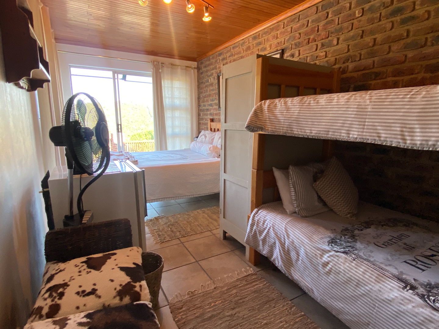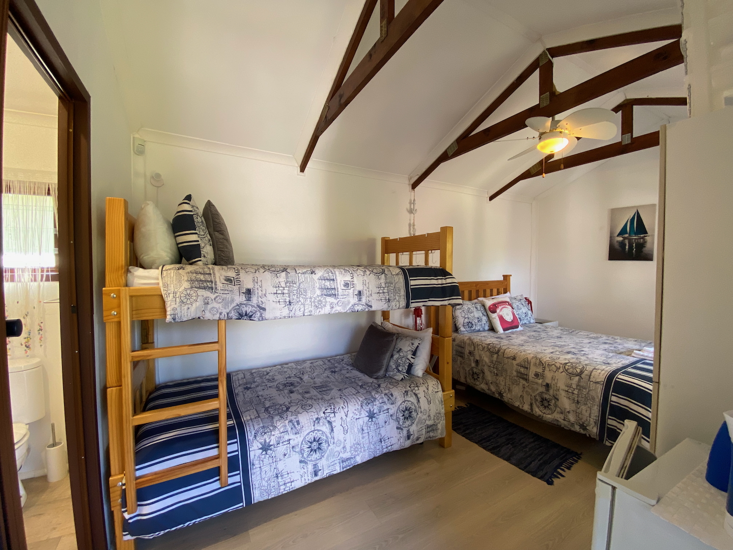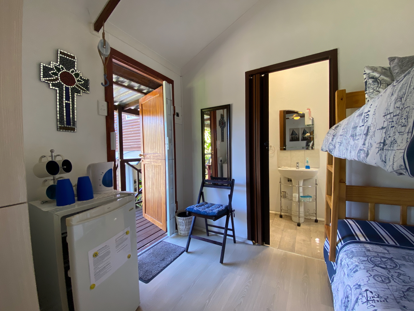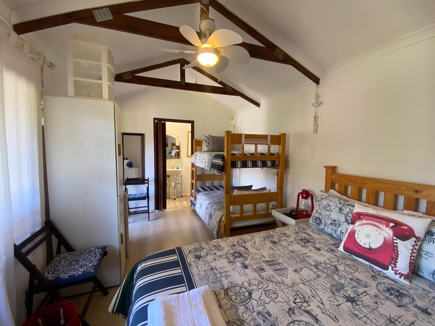 A free-standing cottage boasts a beautifully decorated room with a double bed, single bunk beds, a tea and coffee station with a bar fridge, and an en-suite bathroom. Guests can unwind on a small deck while enjoying a good book.