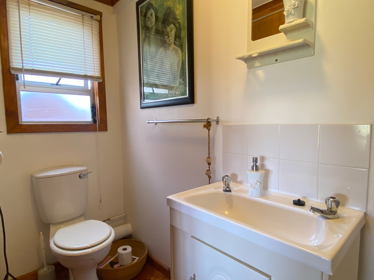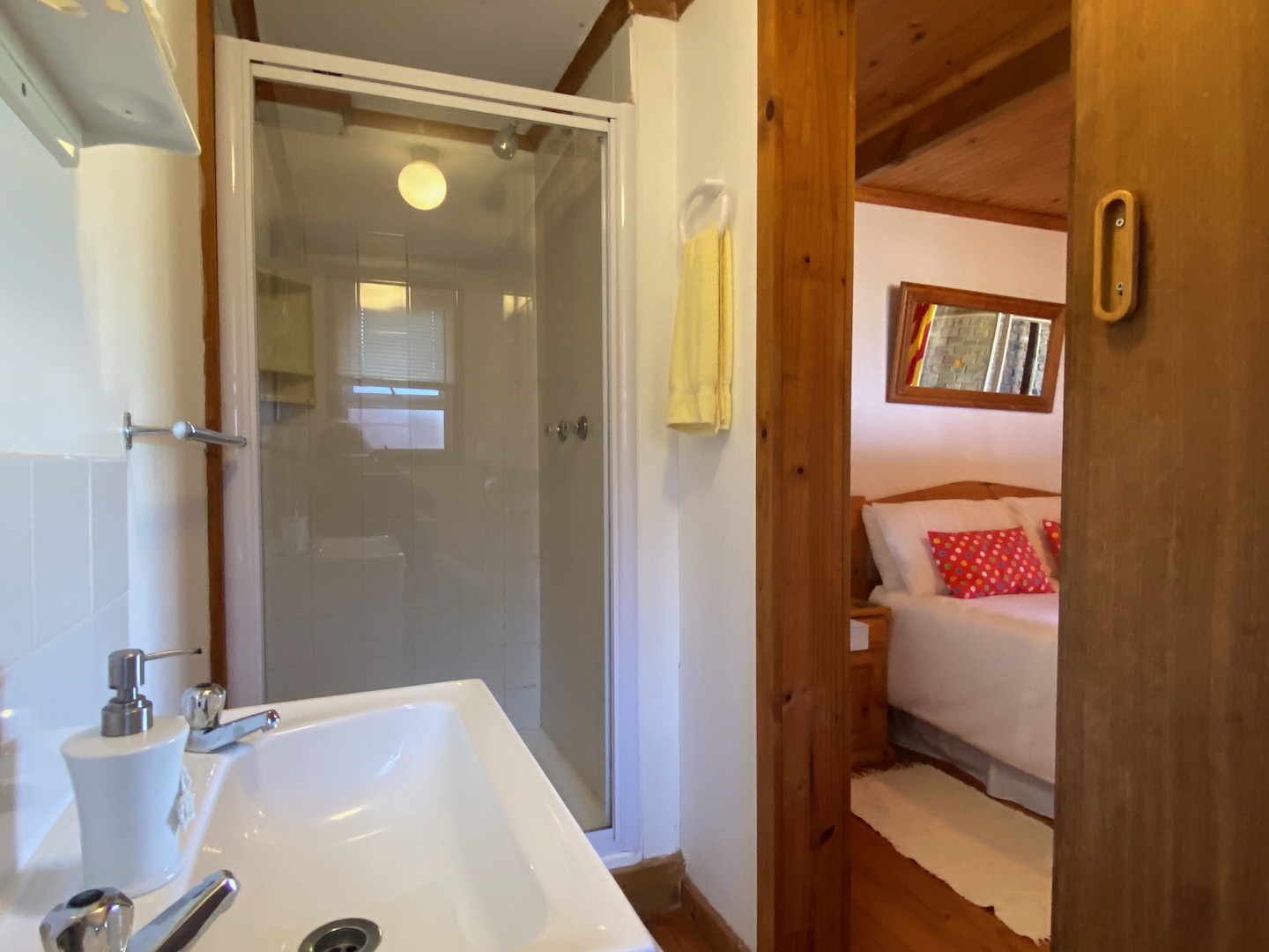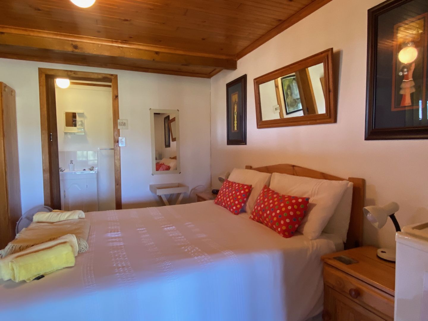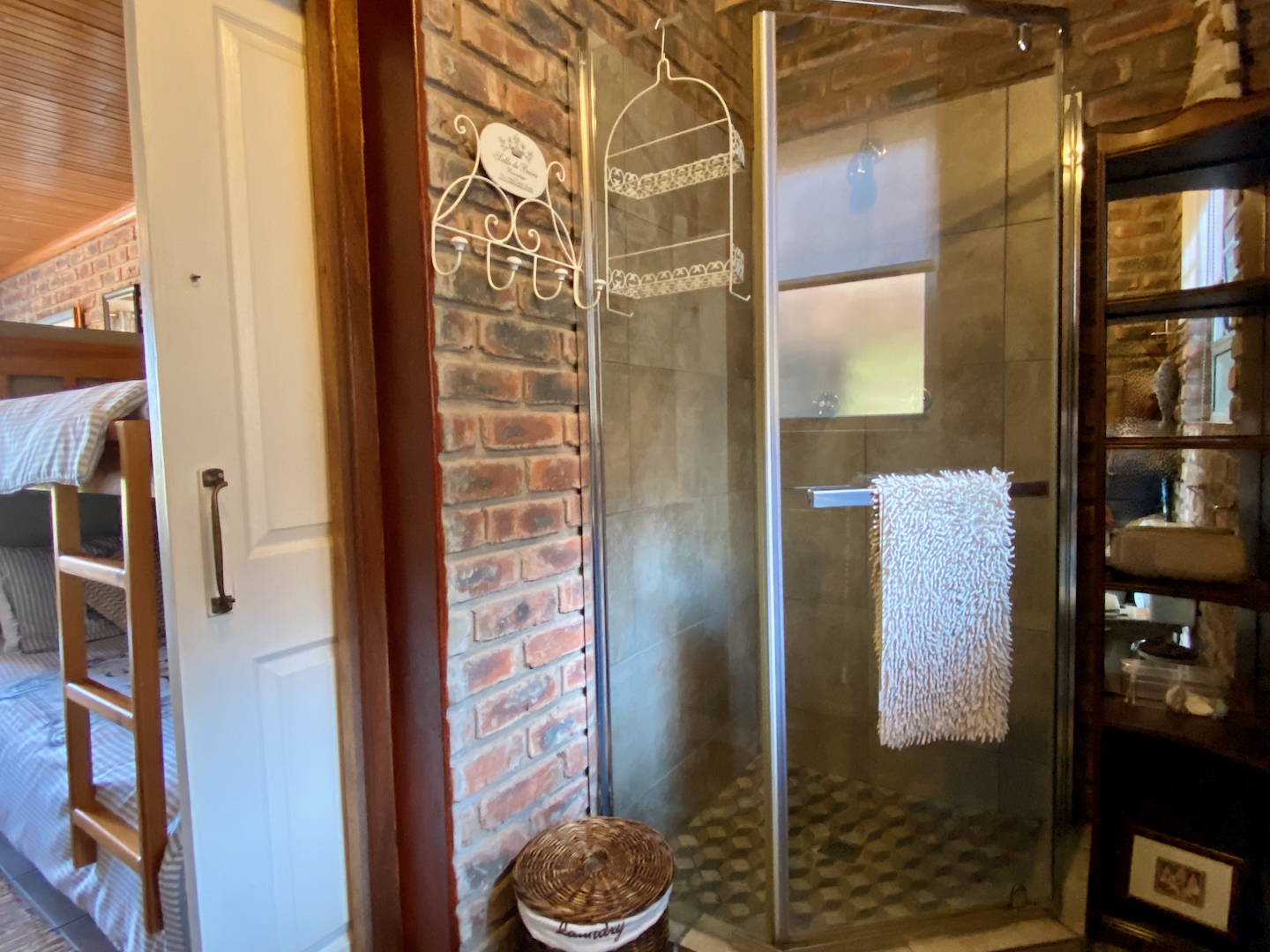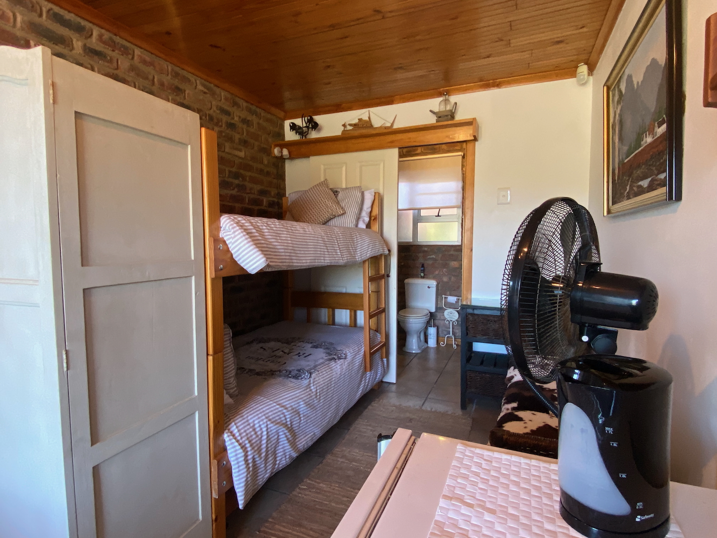 A free-standing cottage boasts a beautifully decorated room with a double bed, single bunk beds, a tea and coffee station with a bar fridge, and an en-suite bathroom. Guests can unwind on a small deck while enjoying a good book.