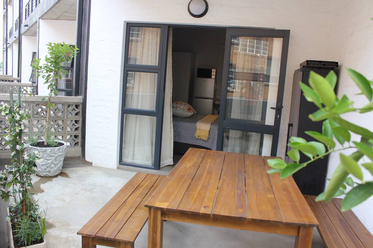 Safe, airy room, fully equipped kitchenette and large bathroom with shower. Lovely veranda to enjoy your breakfast or afternoon drinks. Pool and security in complex.