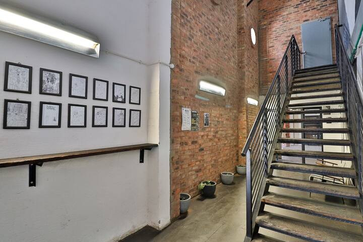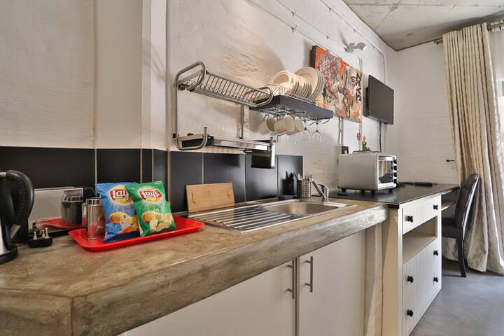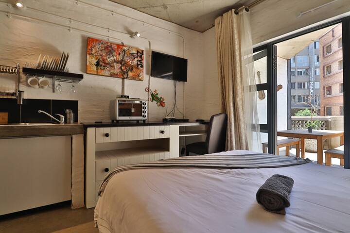 In the heart of the Maboneng Precinct, within walking distance of great restaurants and Maboneng night live. Our unit is designed to be your home from home with all the necessities and little luxuries. Enjoy the lovely sunset over Joburg whilst sipping on your sundowner on your very own balcony.
