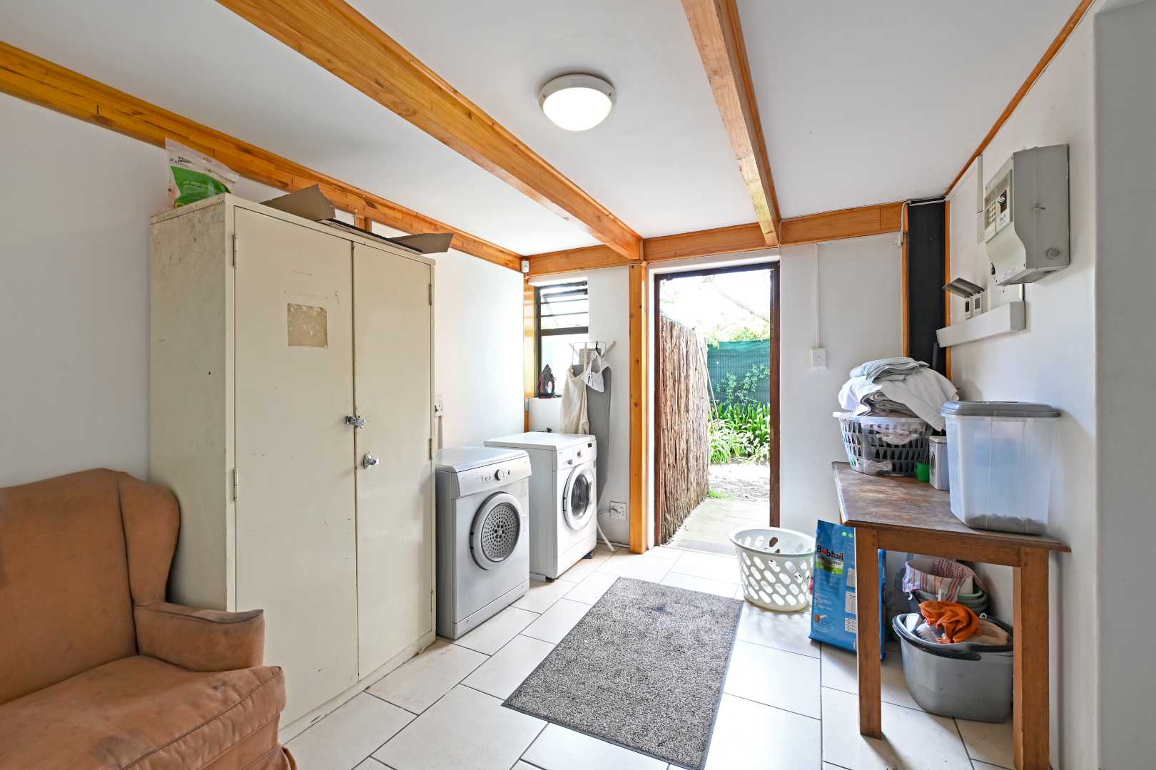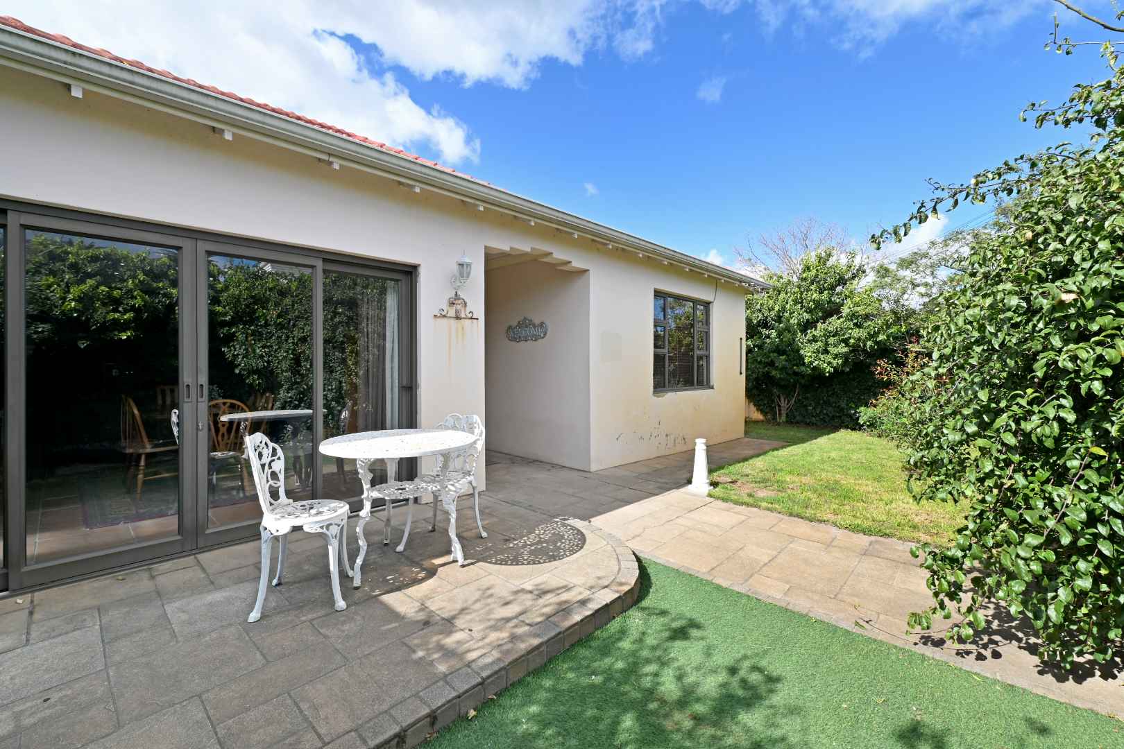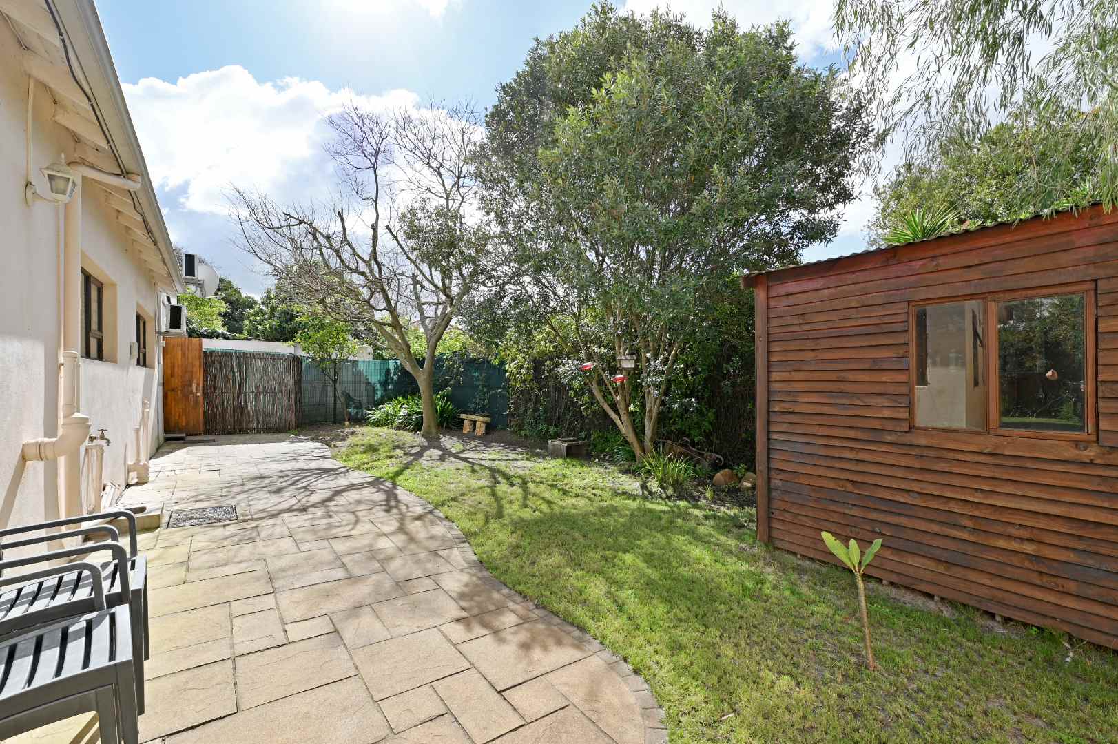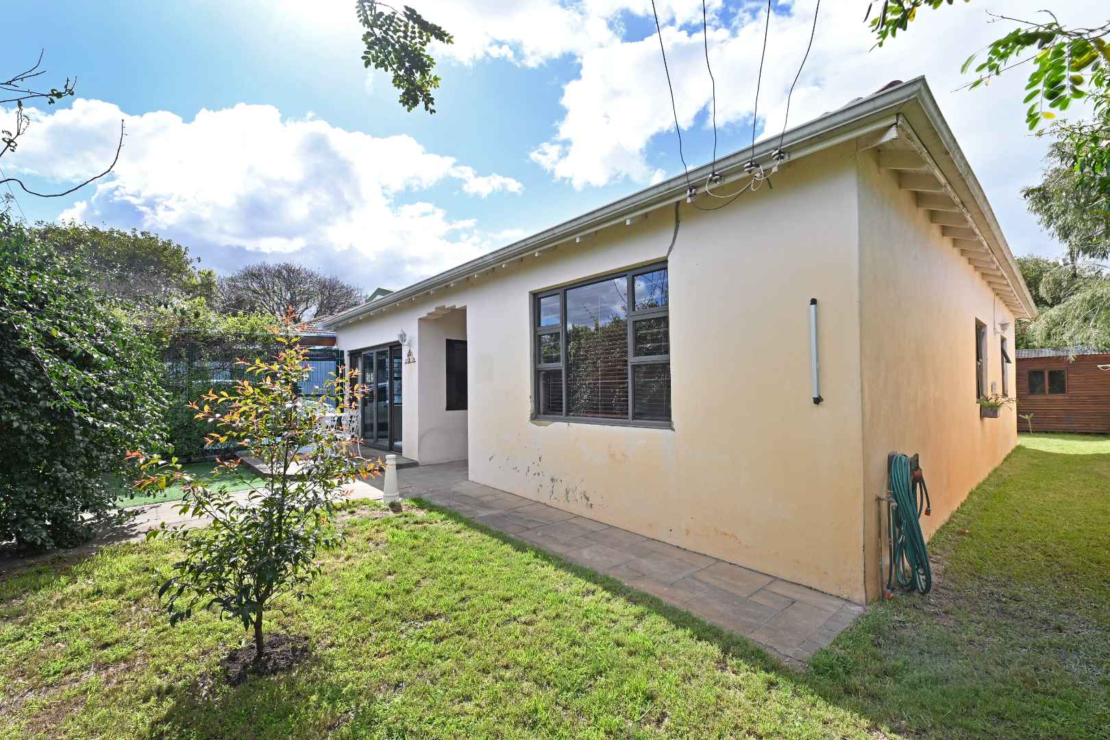 The back garden, bathed in morning light, offers room to add a pool and comes with a handy 3x3m garden shed and well-point. Plus, two solar heat pumps mean you'll enjoy hot water without worrying about rising electricity costs.