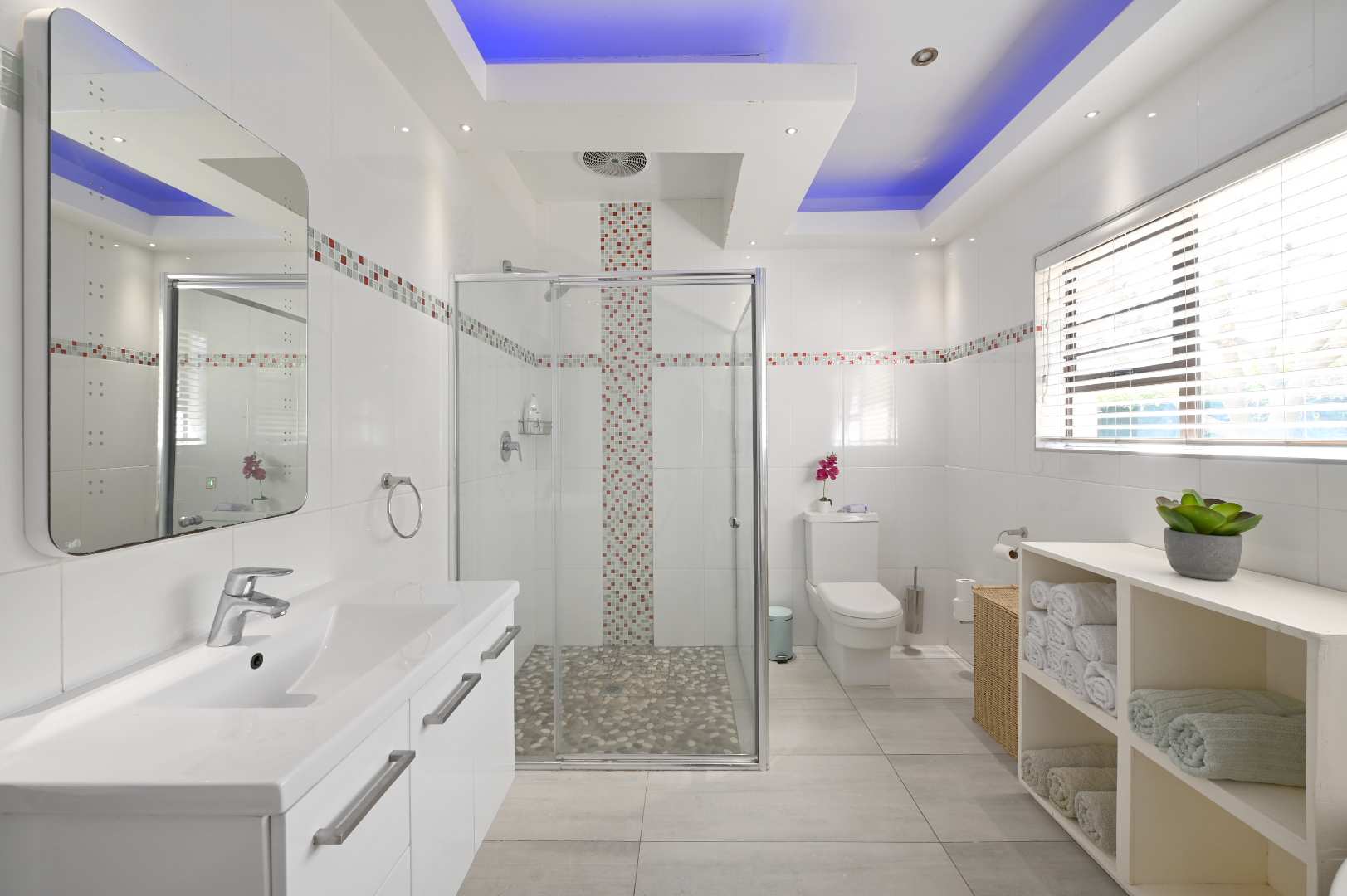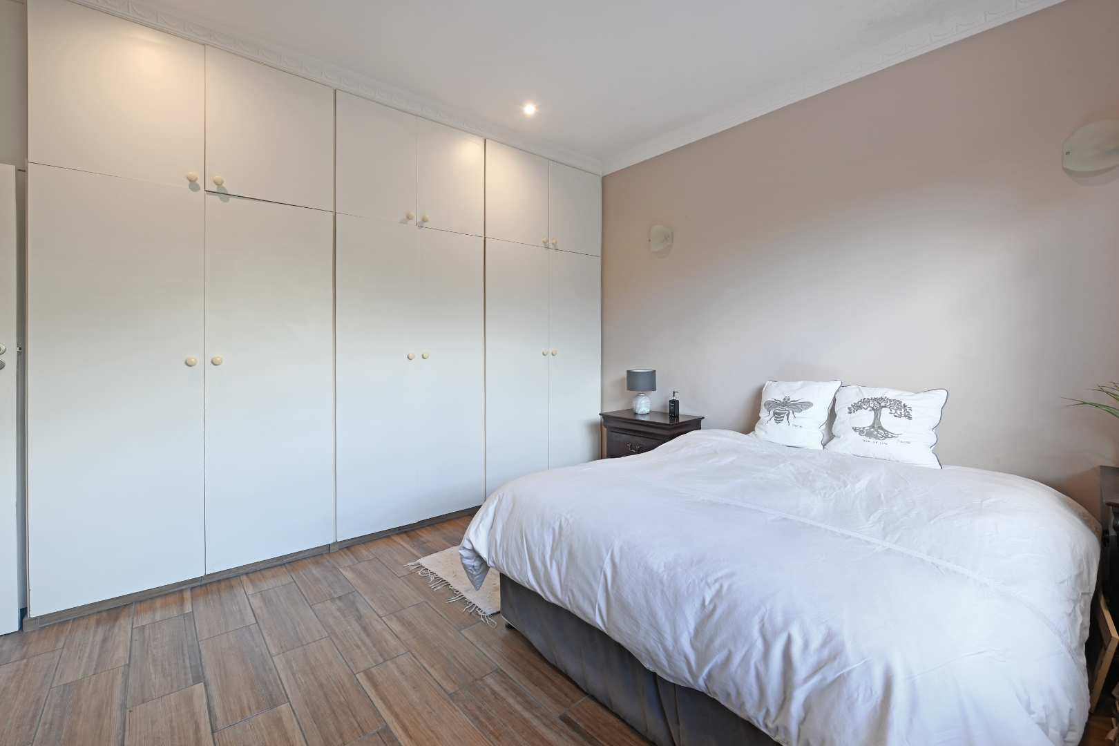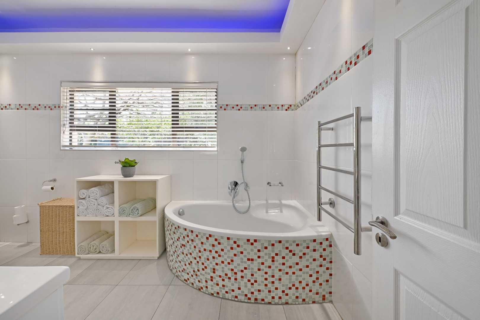 The bathroom is a sanctuary with a full corner bath and a roomy shower, all accented by stylish LED mood lighting. The second bedroom is generously sized with built-in cupboards, while the third bedroom invites your personal touch.