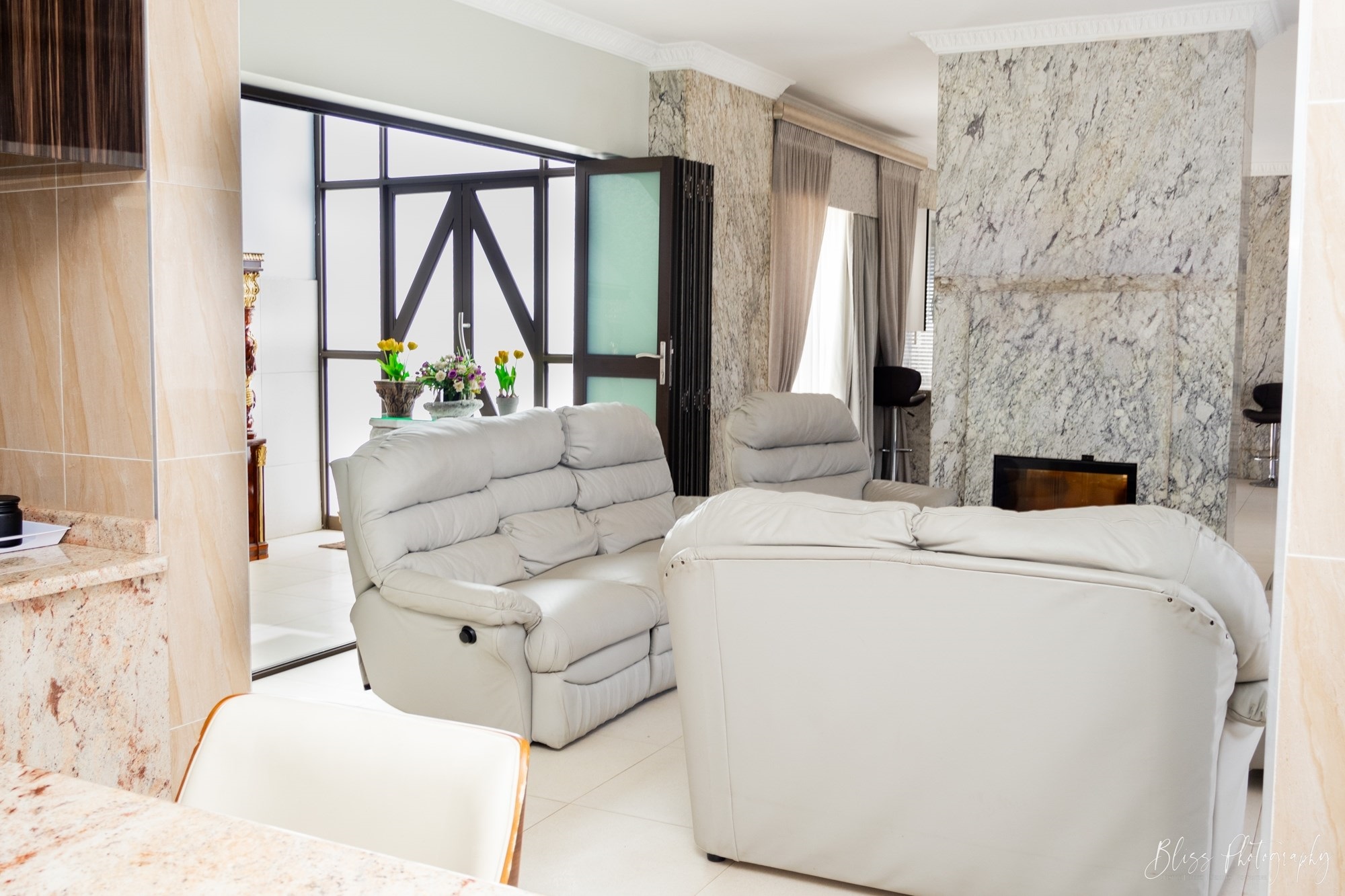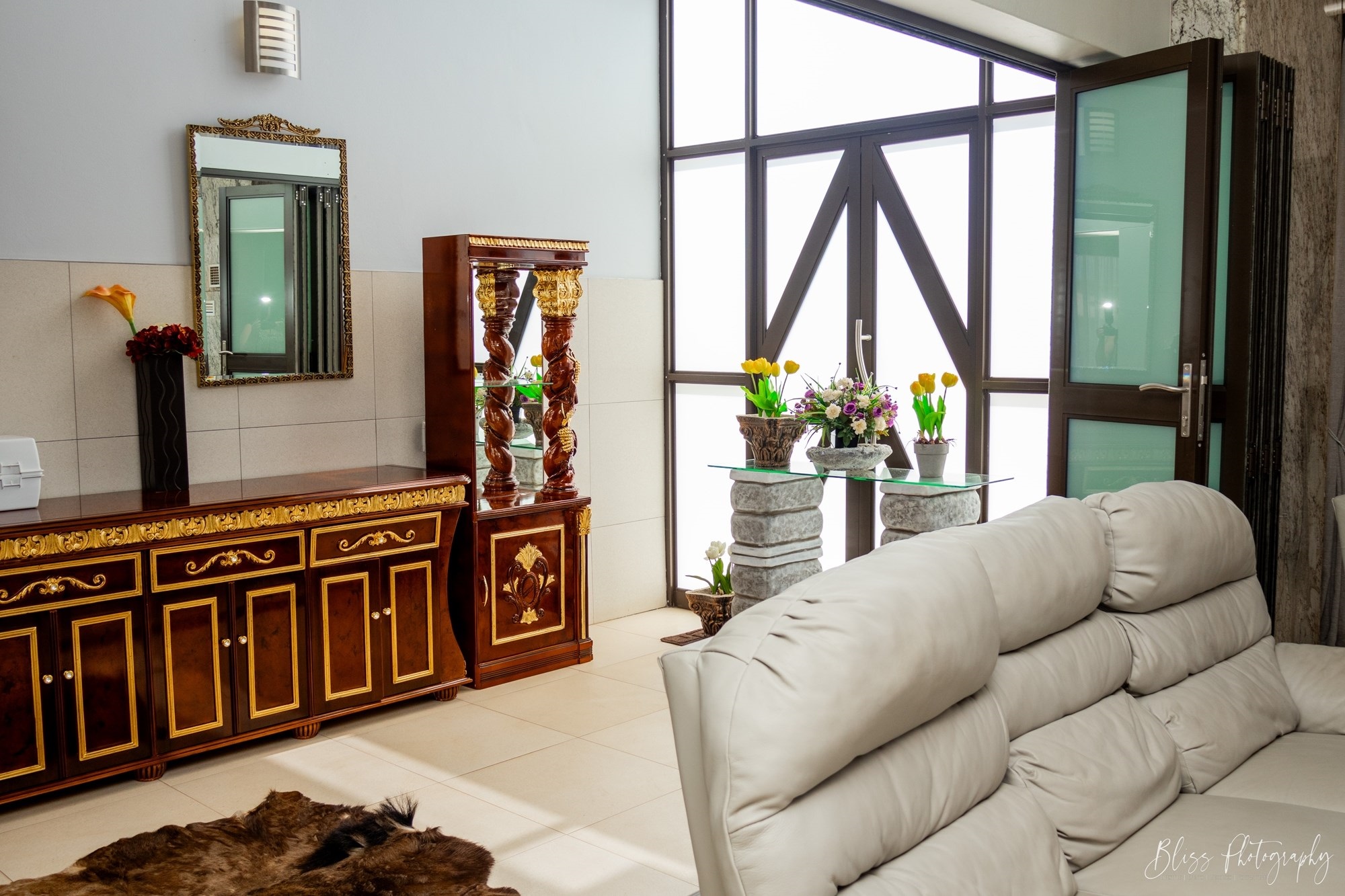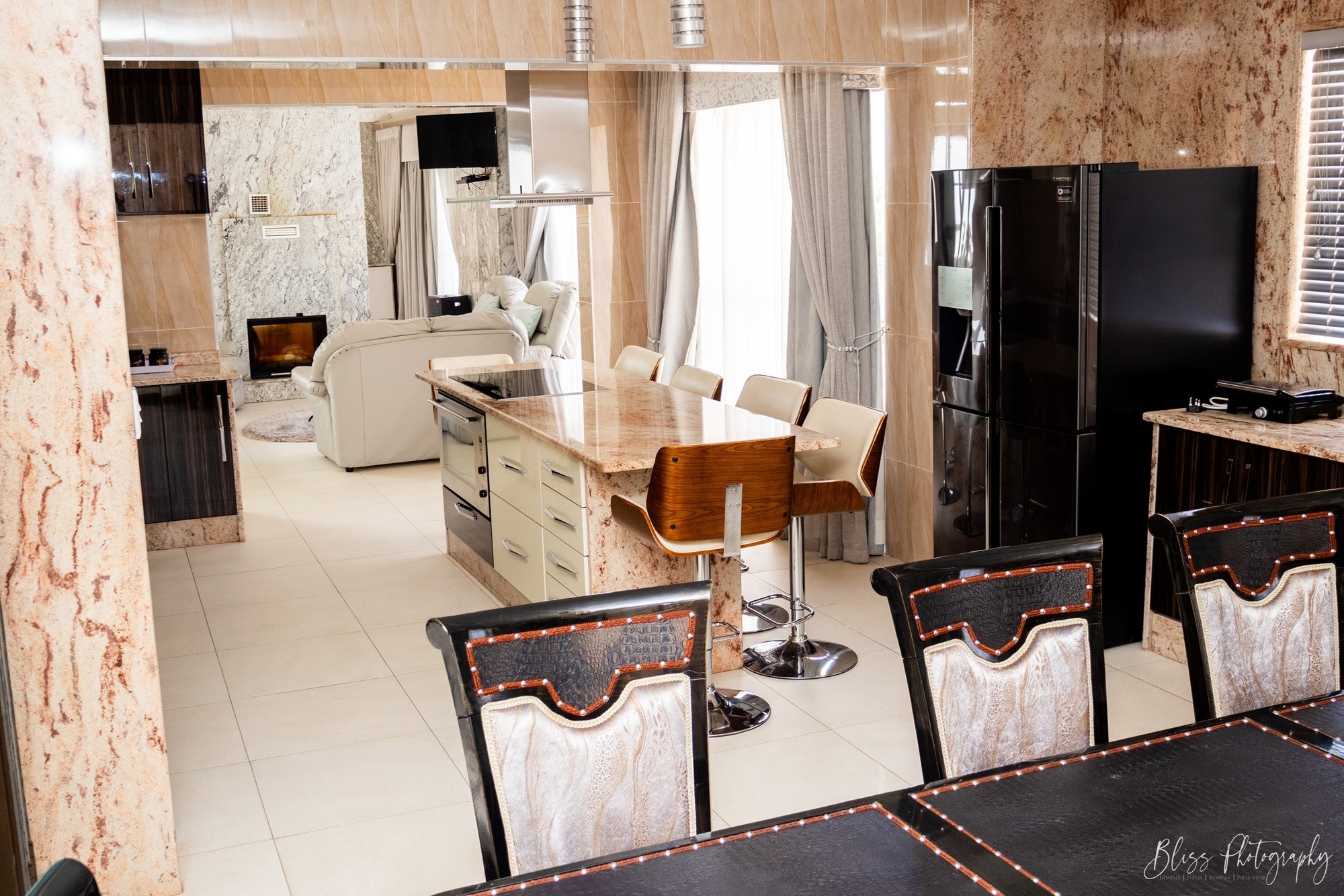 The living room, dining room and kitchen areas as well as the extremely large double garage, all have the most beautiful interior design.