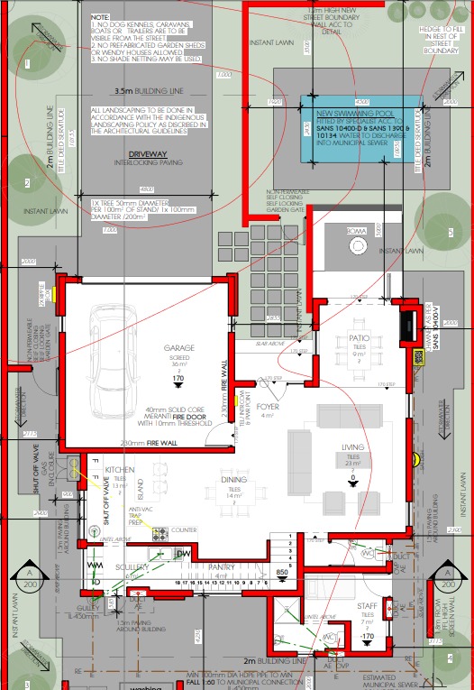 Groundfloor will consist of large Dining - Living - Patio area with built in braai. Patio will lead onto a boma area and also to the swimmigpoll (optional extra) . The kitchen has a scullery out of sigth. The staff room has en ensuit bathroom. A double garage will accommodate ethe vehicles with ample spwace for parking in fro to the garage.