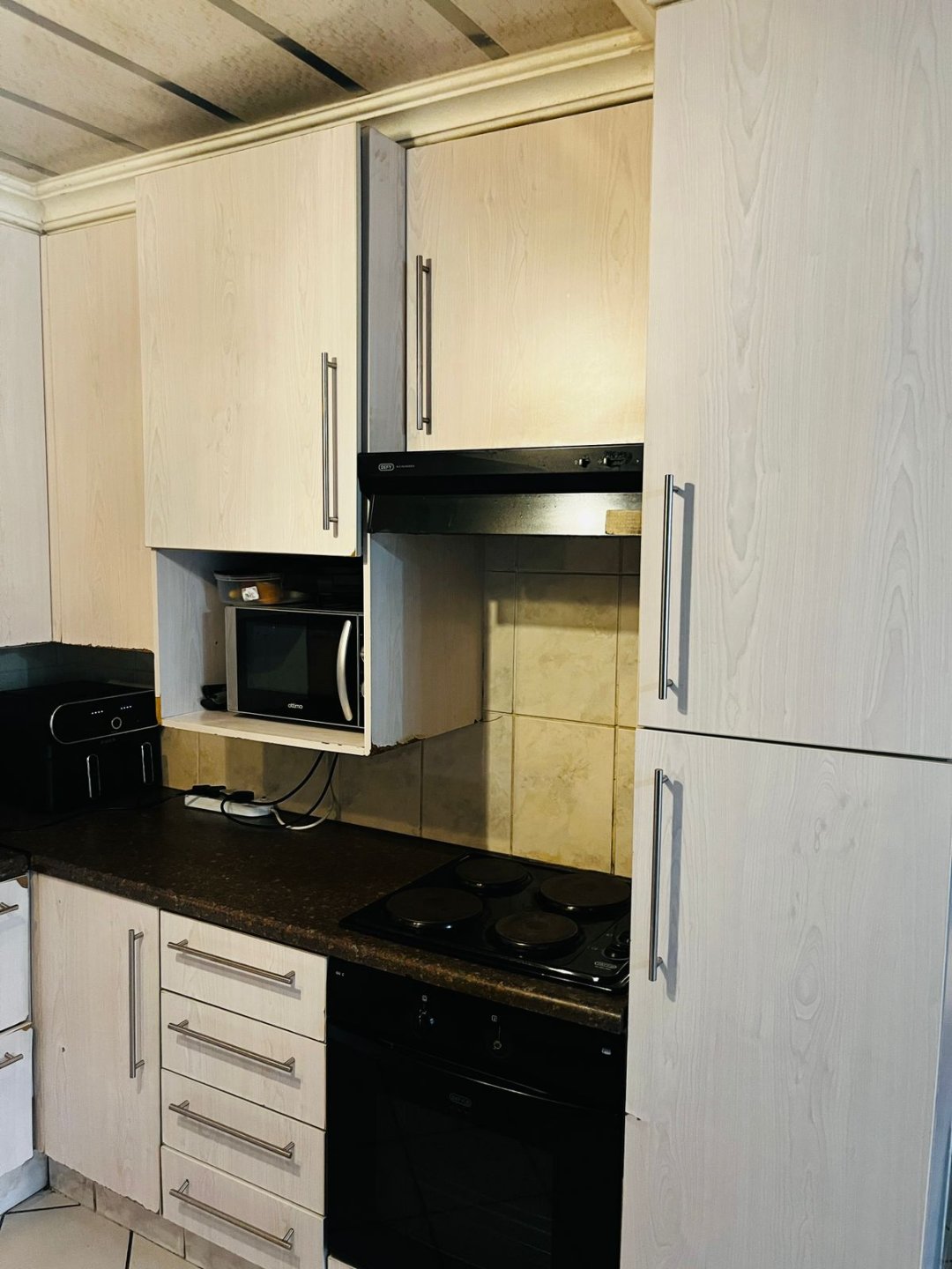 Modern Kitchen: Stylish built-in kitchen units with an electric stove, extractor fan, fridge space, and microwave space.