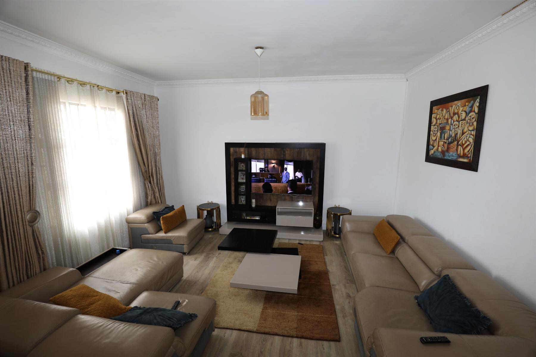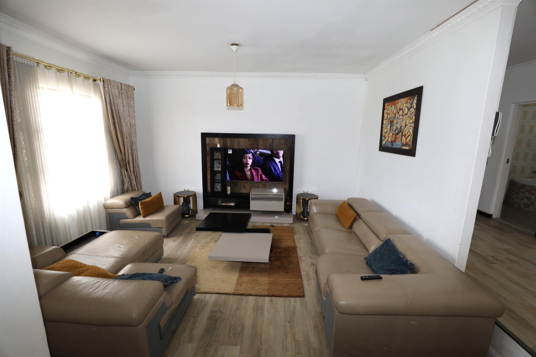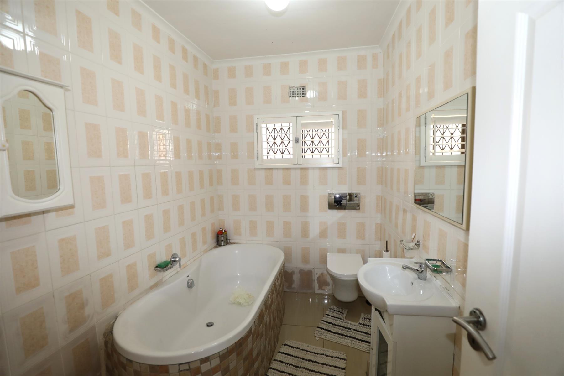 Step outside to discover a beautifully landscaped garden, perfect for enjoying the outdoors or hosting barbecues. The property is secured by a sturdy brick wall, ensuring privacy and peace of mind. Additional amenities include aluminium windows that enhance natural light and ventilation, and a spacious bathroom featuring a double basin and a bath for your convenience.