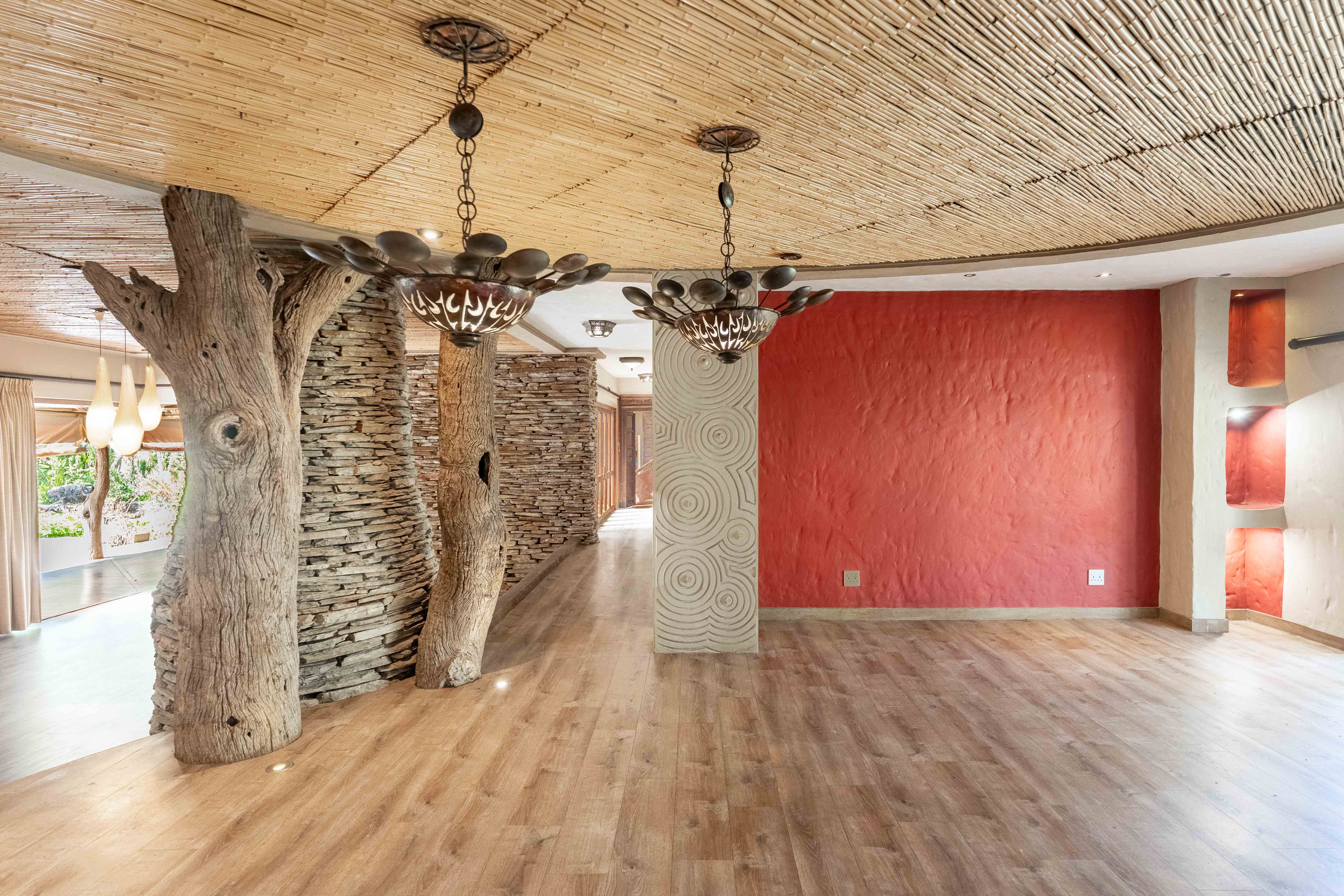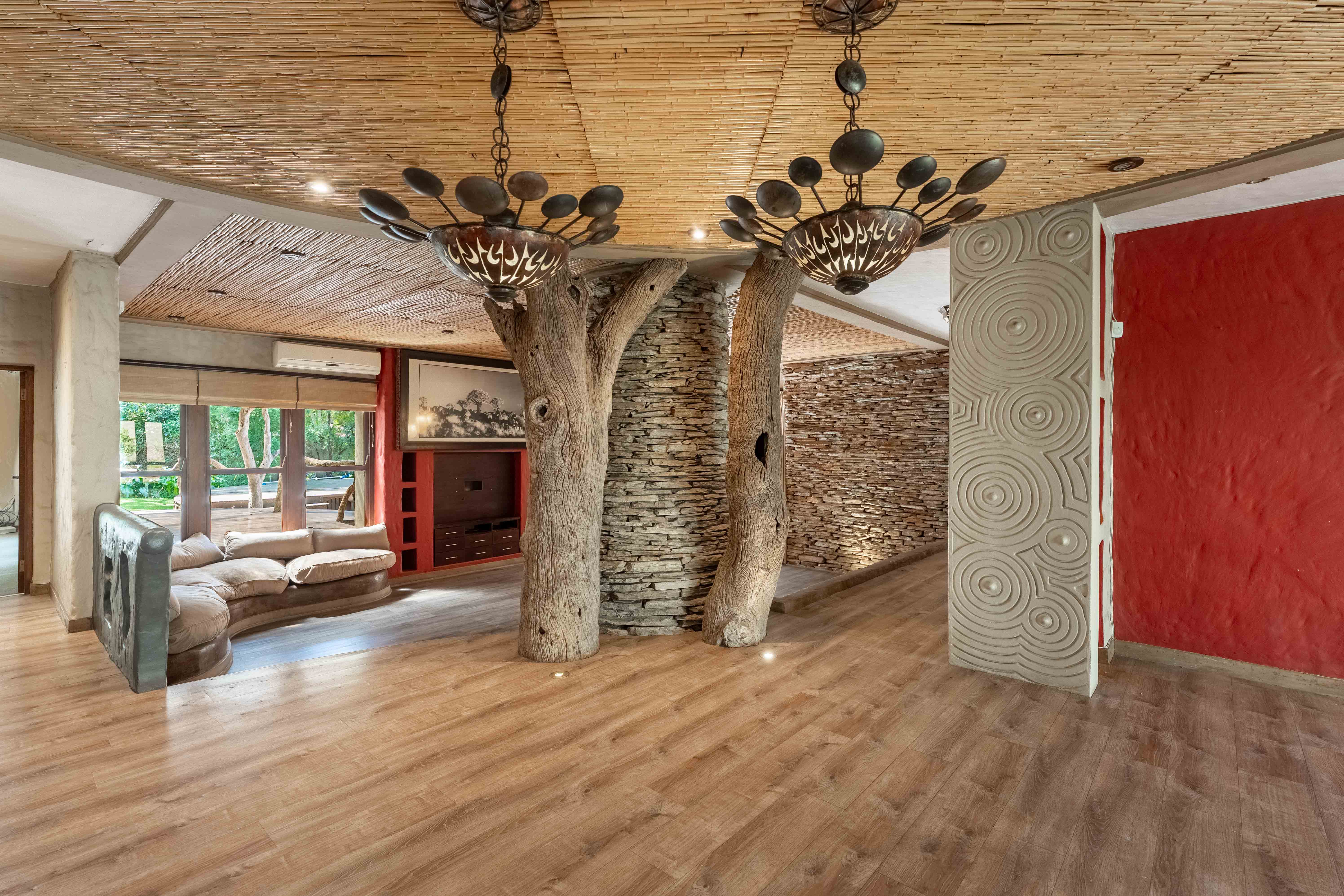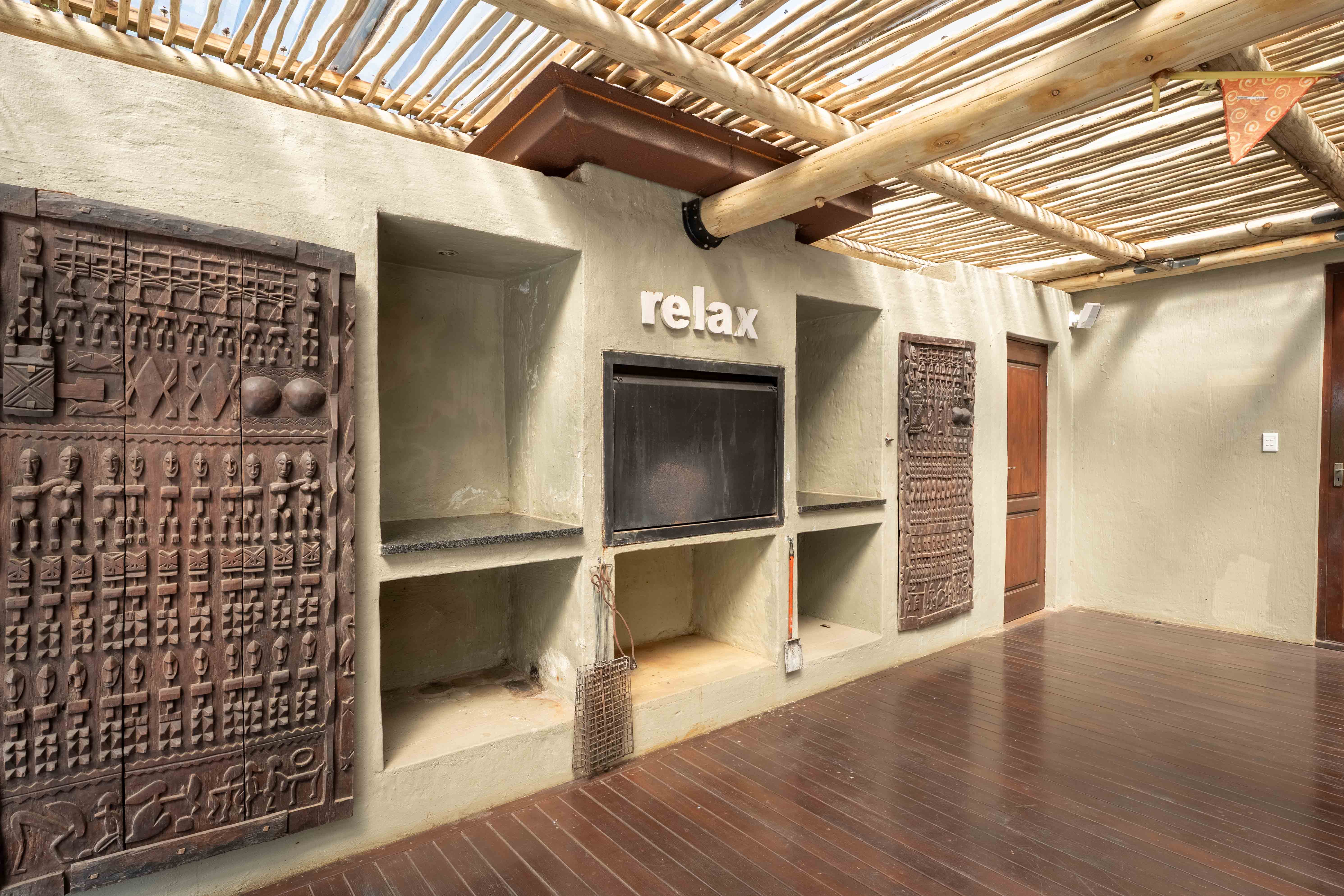 Discover the charm and sophistication of this remarkable home, a property where rustic elegance meets modern luxury, inspired by the essence of the African wilderness. From its striking hand carved West African doors to the thoughtfully curated interiors, this home is brimming with character and style.