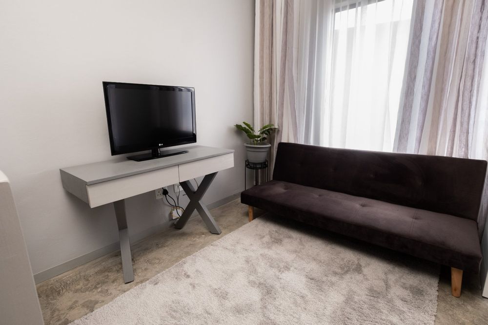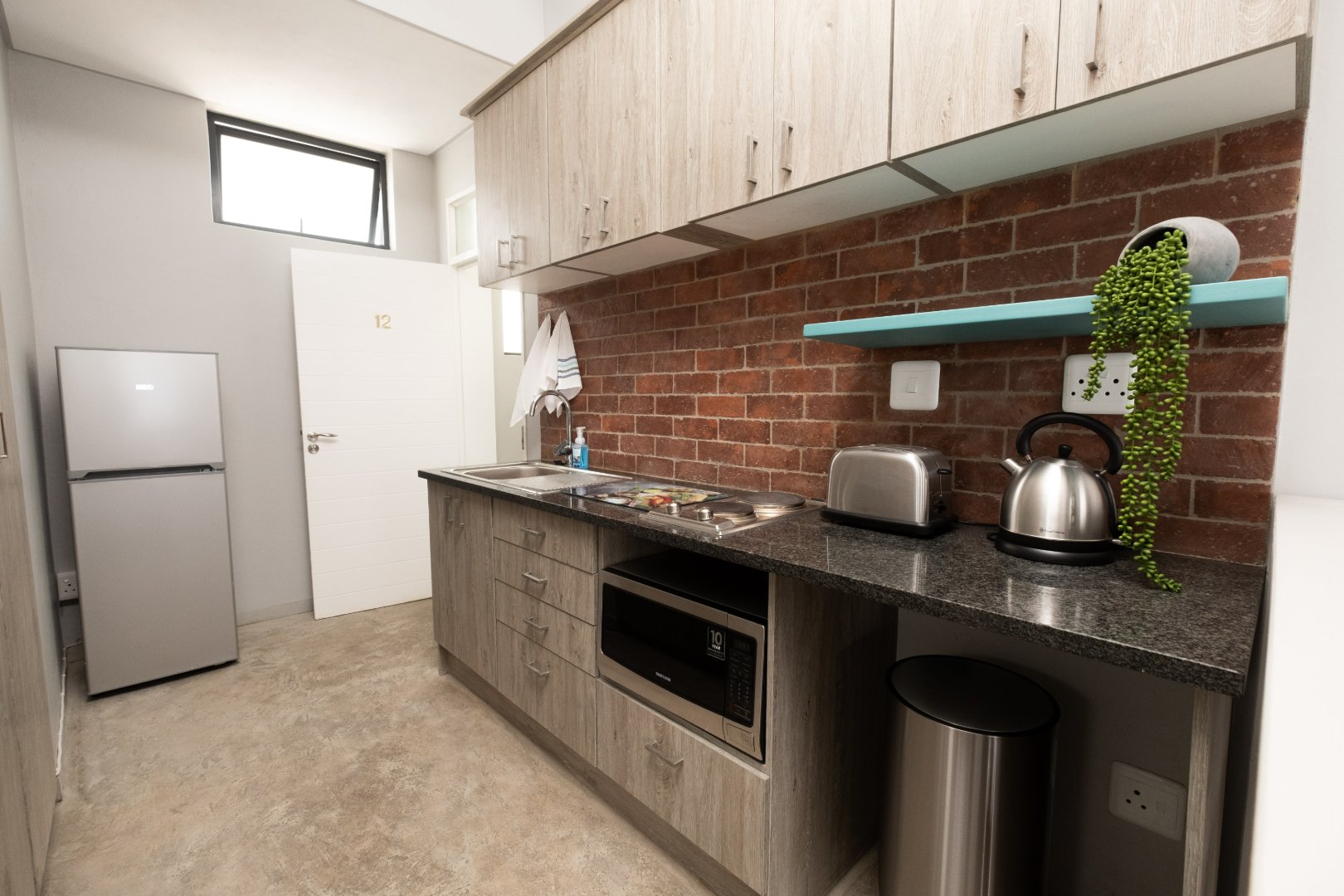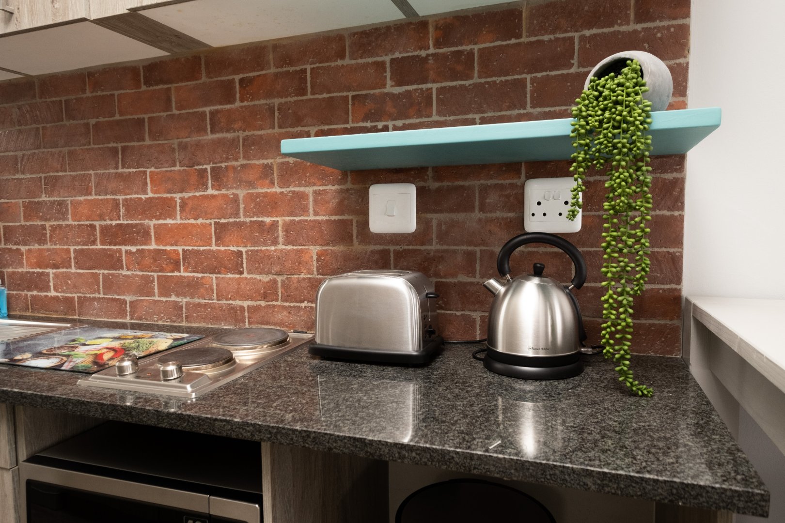 Open plan living and bedroom, tiles, Shower with toilet and Basin, small but effective kitchen.