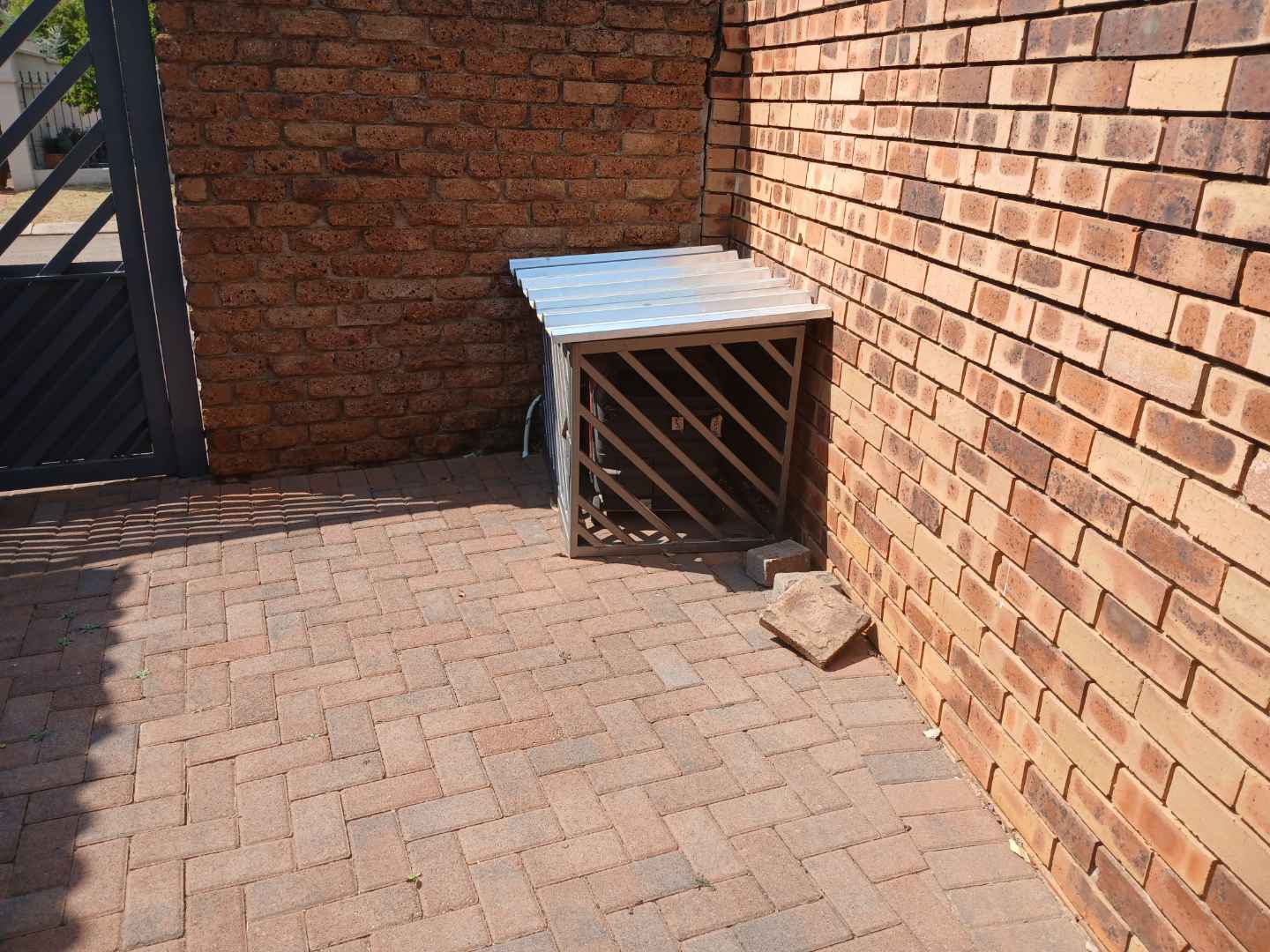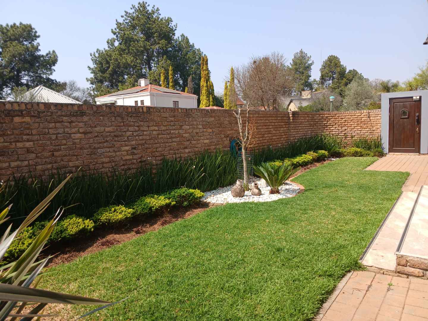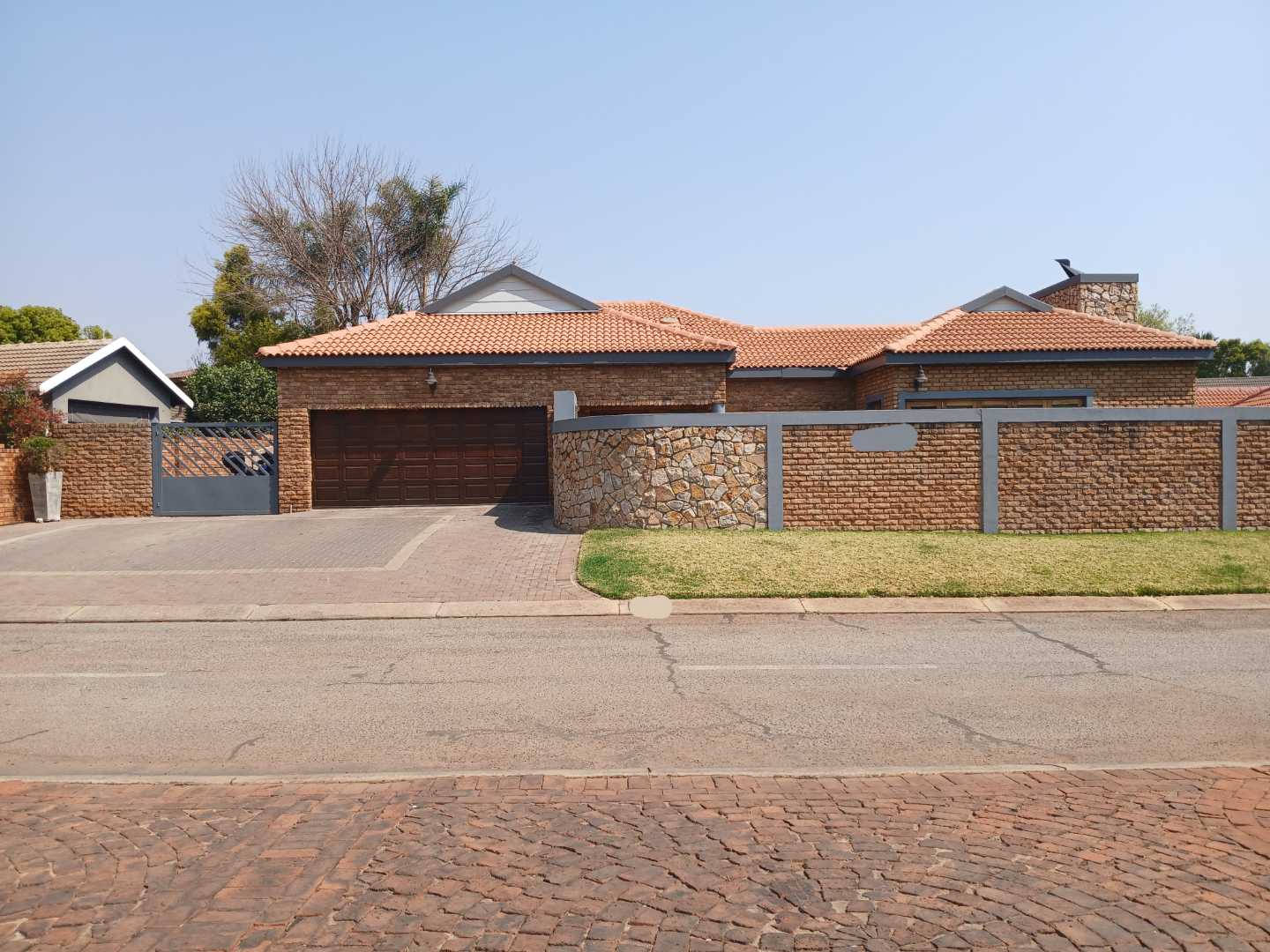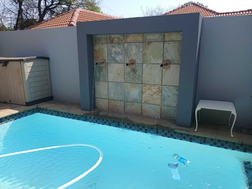 Perfect for outdoor living and entertaining, the property includes an indoor braai area and a beautiful swimming pool with a waterfall wall, surrounded by a brick patio and pergola. The secured estate ensures peace of mind with cameras for added safety. The property is set in a residential area with neighboring houses visible against a backdrop of a clear blue sky 🌞.