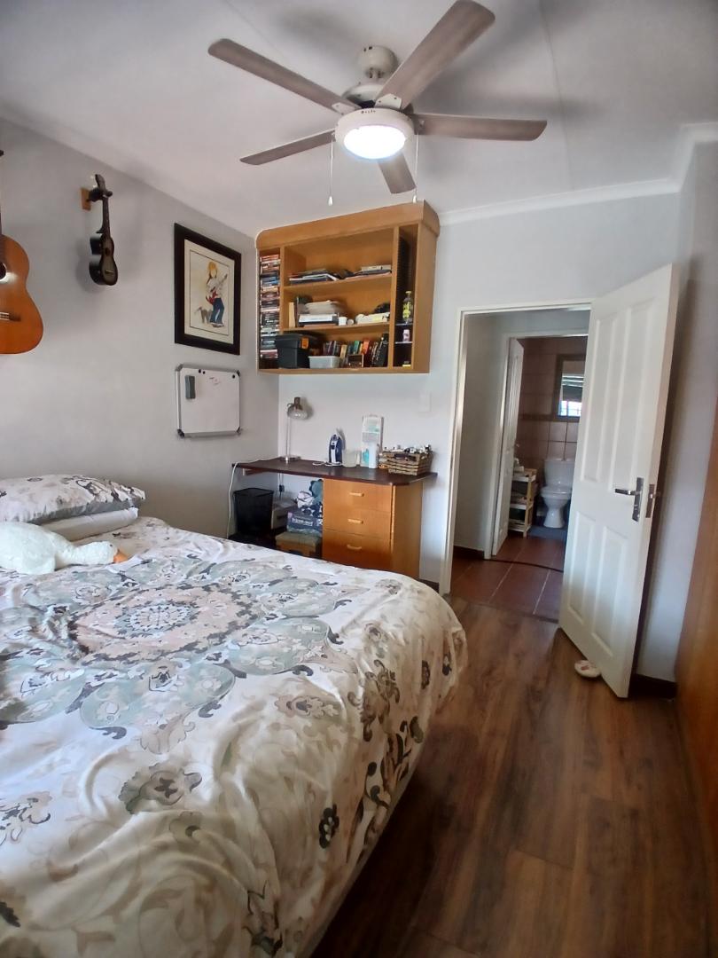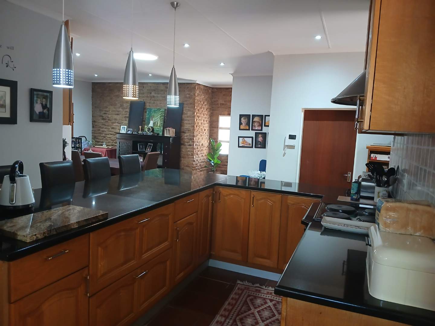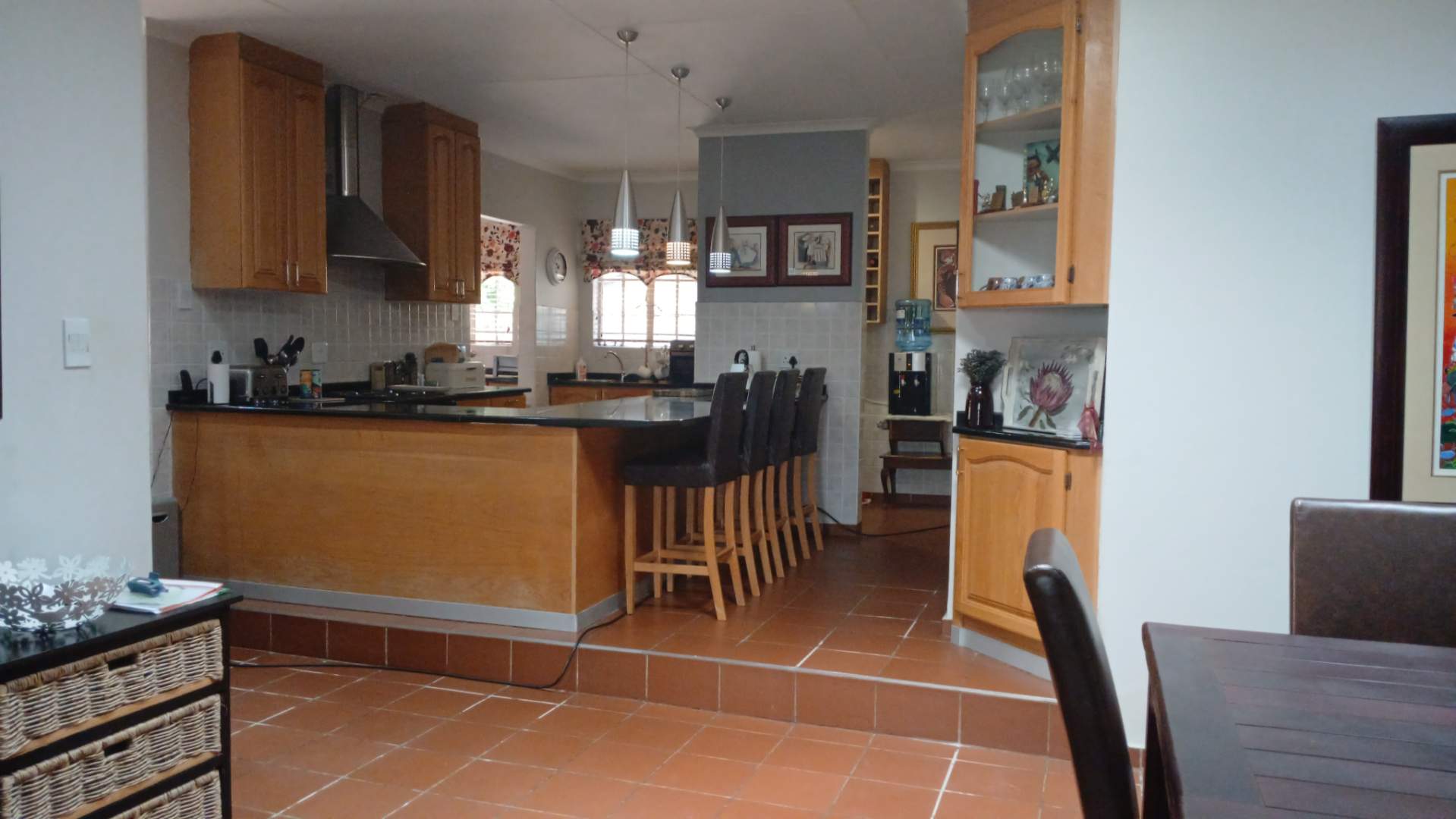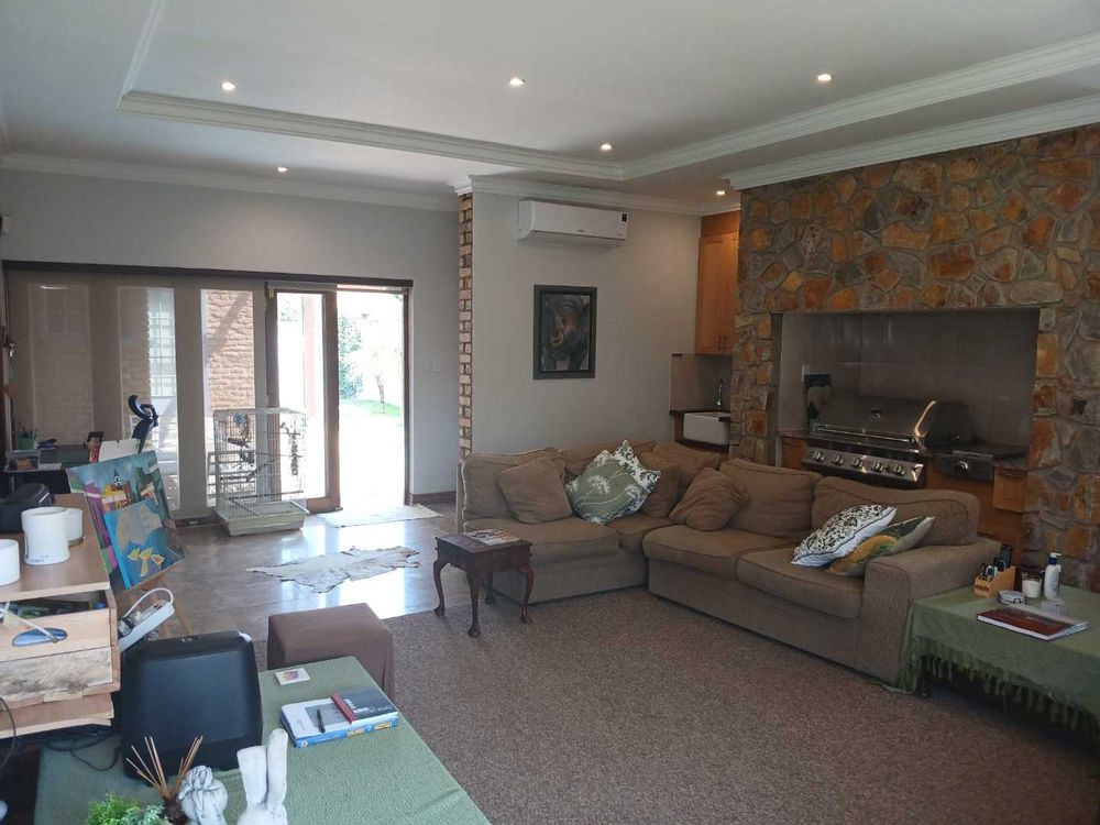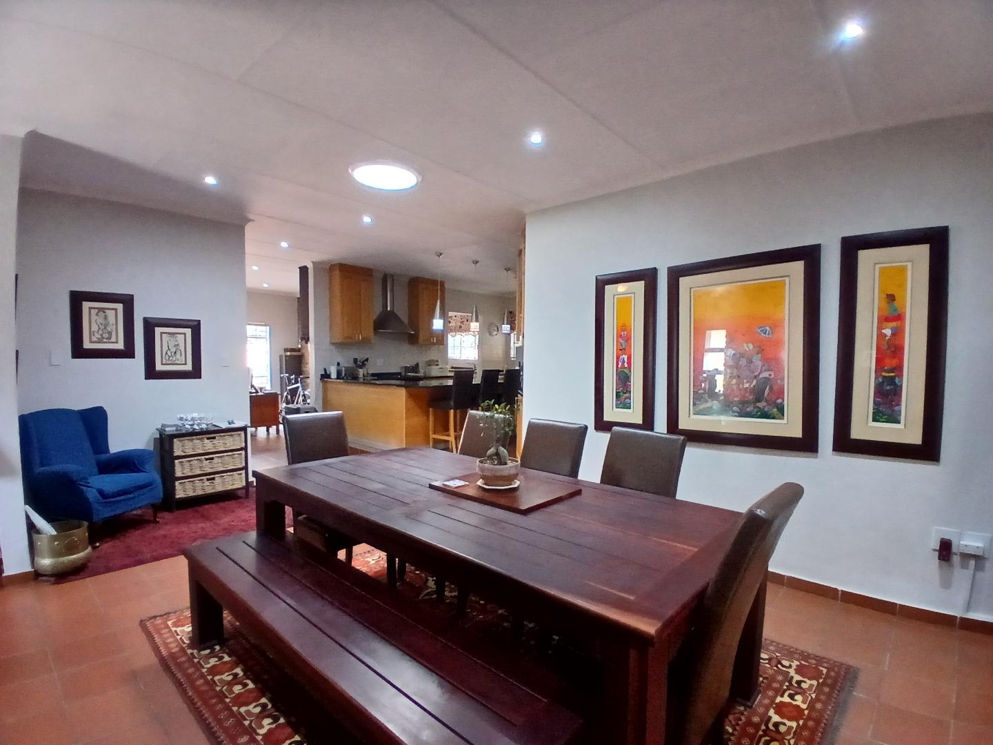 This stunning 4-bedroom, 3-bathroom property in Centurion offers a perfect blend of comfort, entertainment, and security. Boasting 270m2 of floor space, the property features an open-plan living area with a kitchen equipped with wooden cabinets and a breakfast bar. The dining area includes a dark wooden table with leather chairs and a cozy nook with a blue armchair.