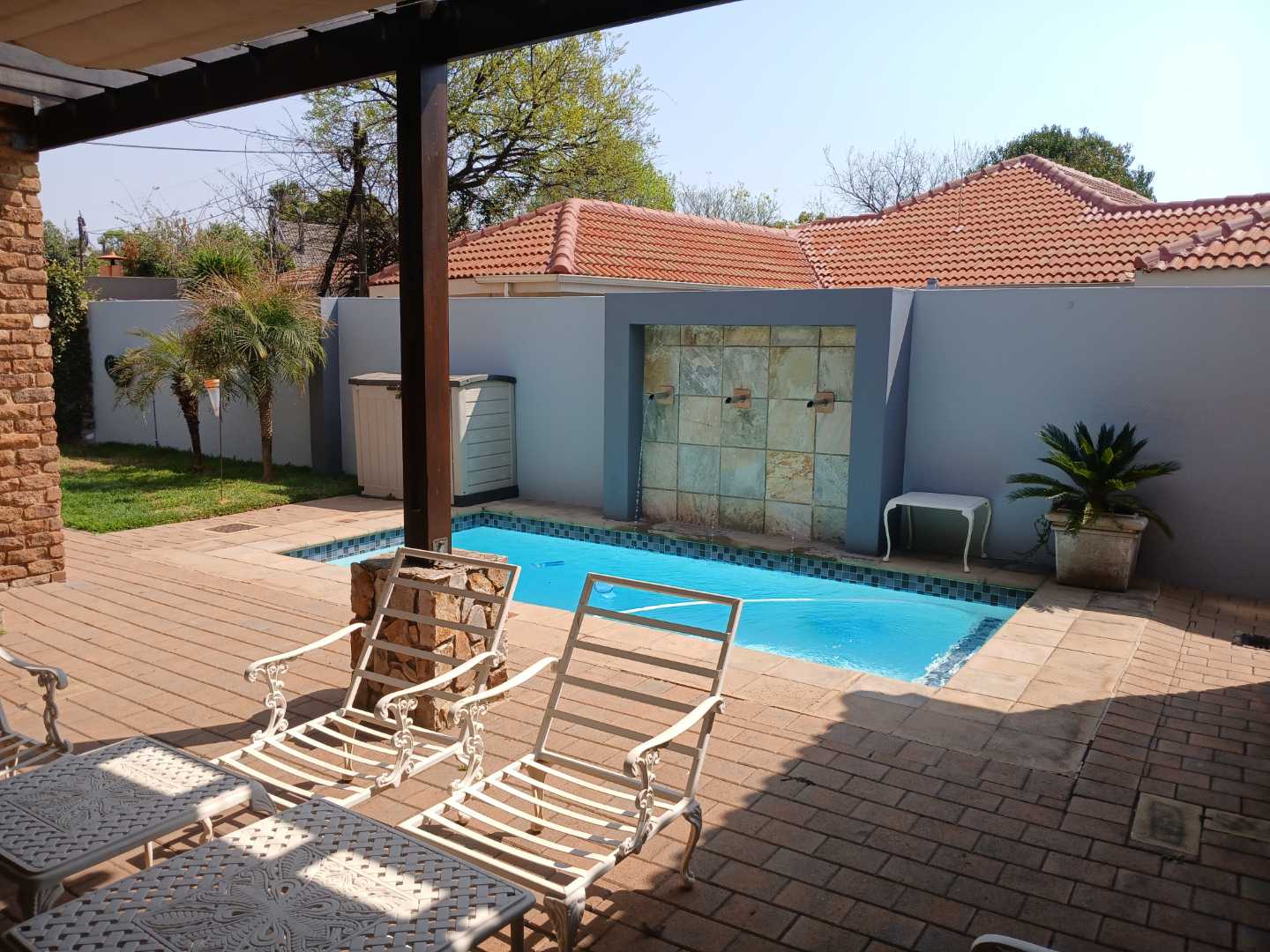 - Swimming pool with brick patio, waterfall wall, and pergola for shade