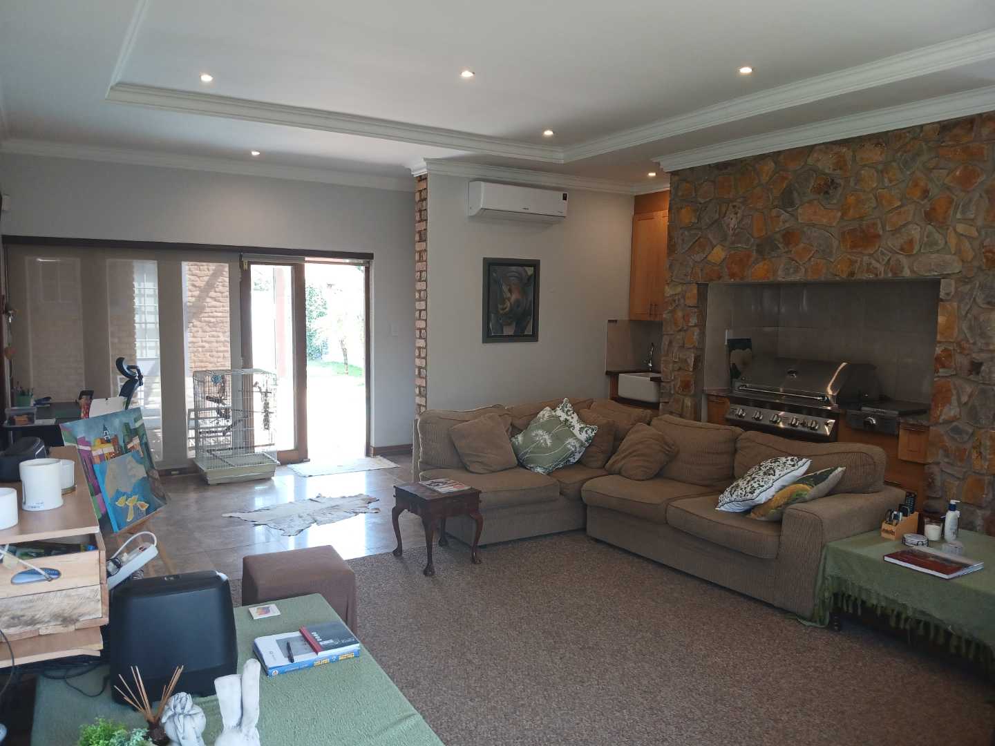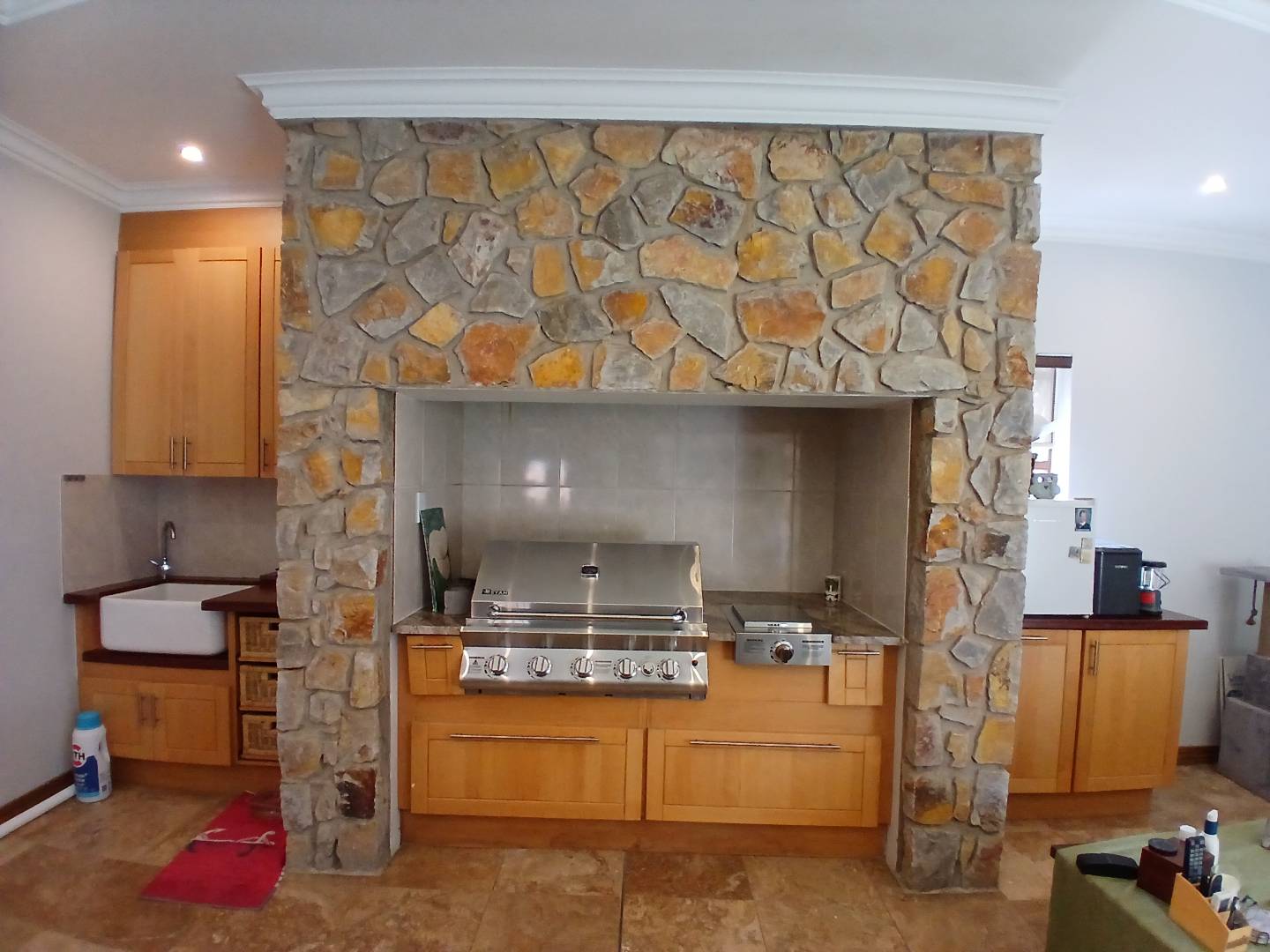 - Indoor braai area with stone-built grill, stainless steel grill and side burner, wooden cabinets, and sink area