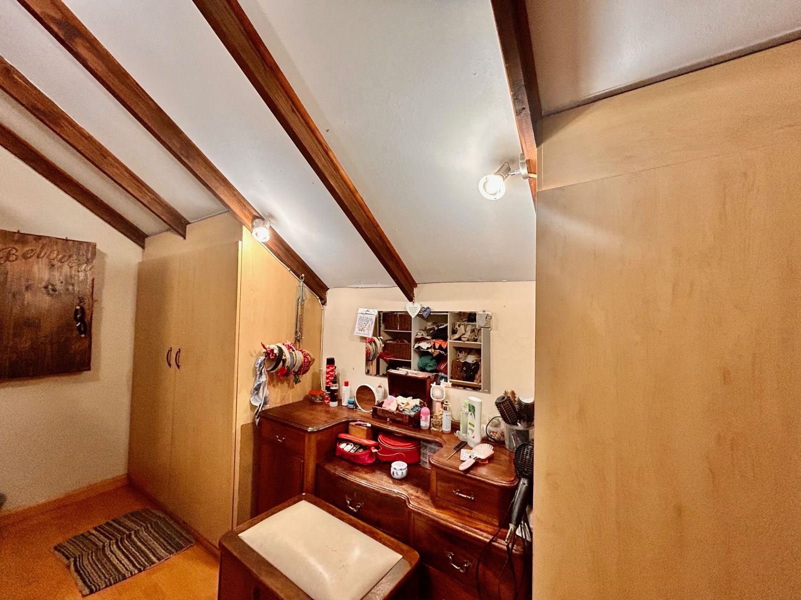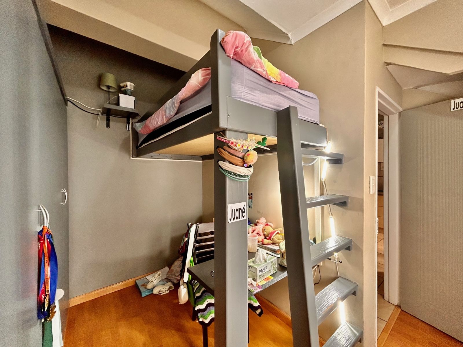 On the ground floor you have an open plan lounge, dining room with high ceilings and a cozy open Fireplace. The compact yet practical kitchen with scullery offers a walk-in pantry, bespoke appliance cupboard with power, a gas hob, space a large single door refrigerator, dishwasher & washing machine.