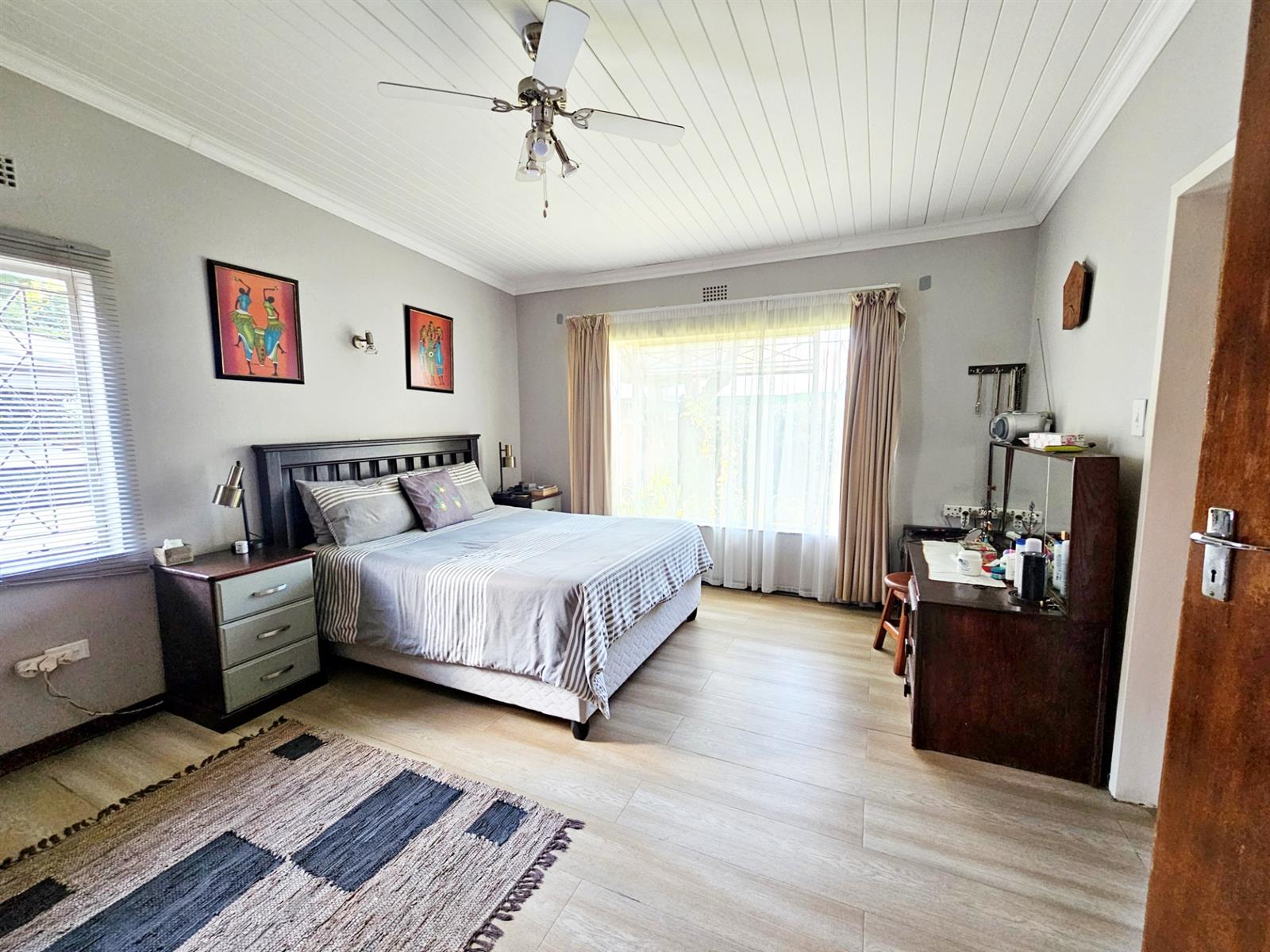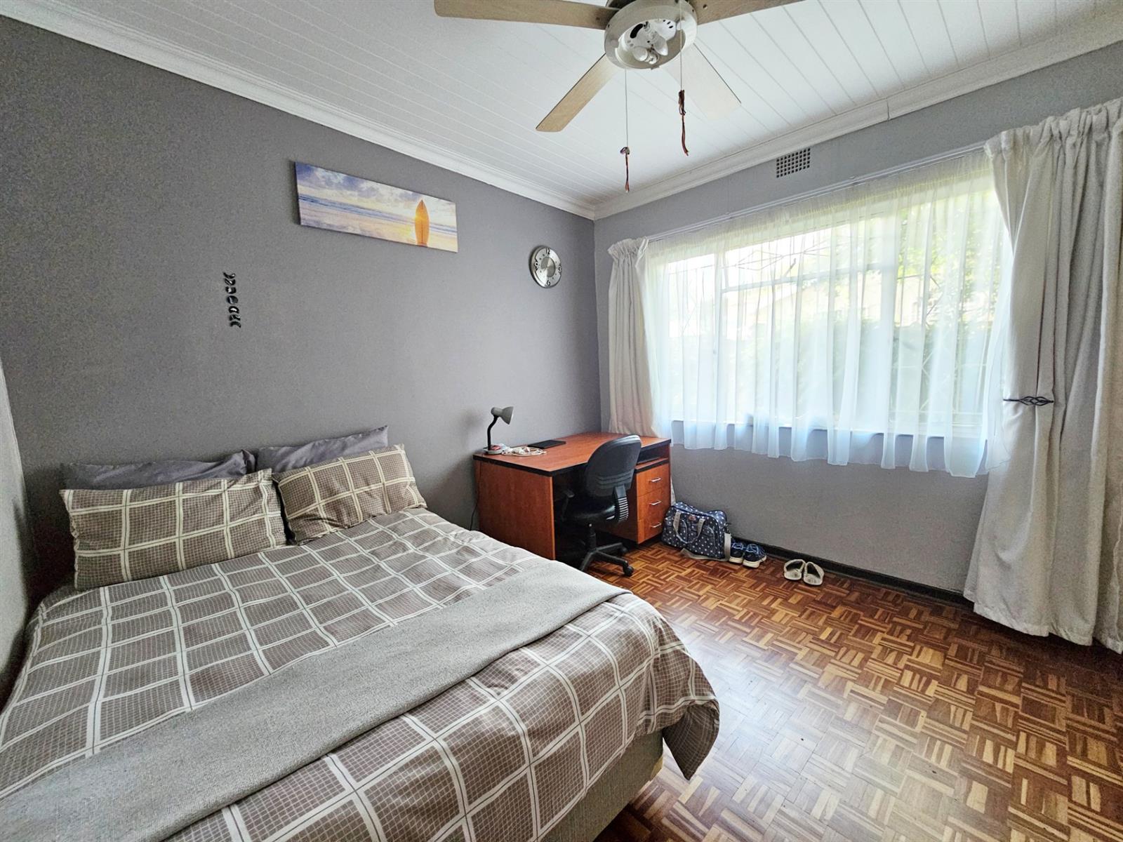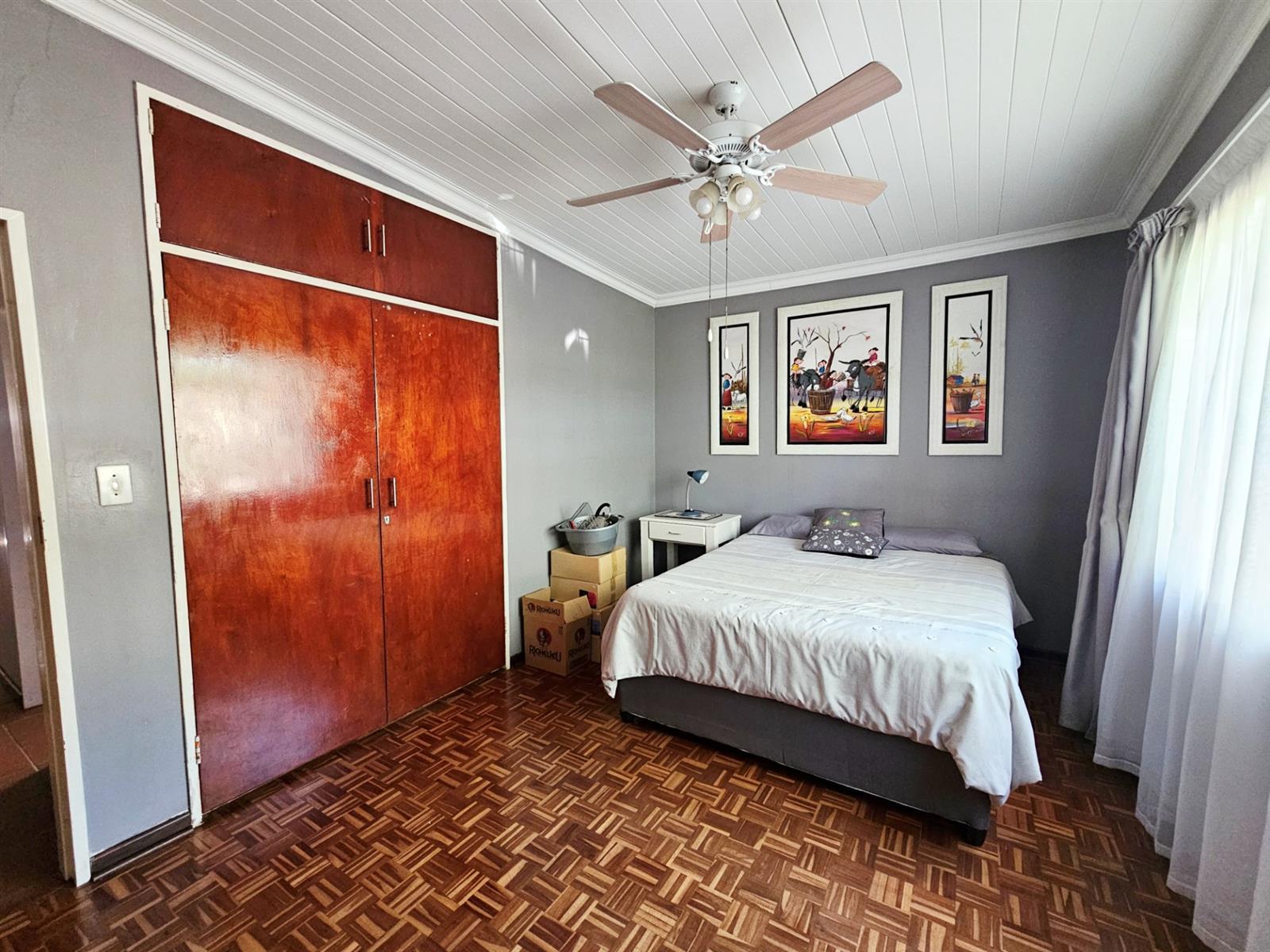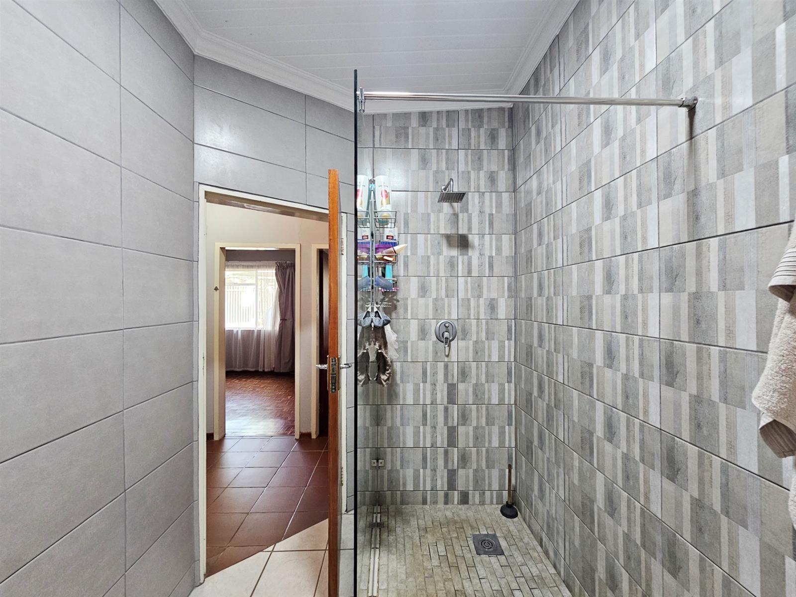 Down the long passage, you’ll find five generously-sized bedrooms — 3 of them with parquet floors and two laminated, all with extra cupboard space and ceiling fans (except for 1) — The main en-suite bathroom is a full bathroom with a modern shower and bath, The shared bathroom has a large walk-in shower. There are 2 geysers, so no one’s fighting for hot water. A separate guest loo with a basin adds convenience.