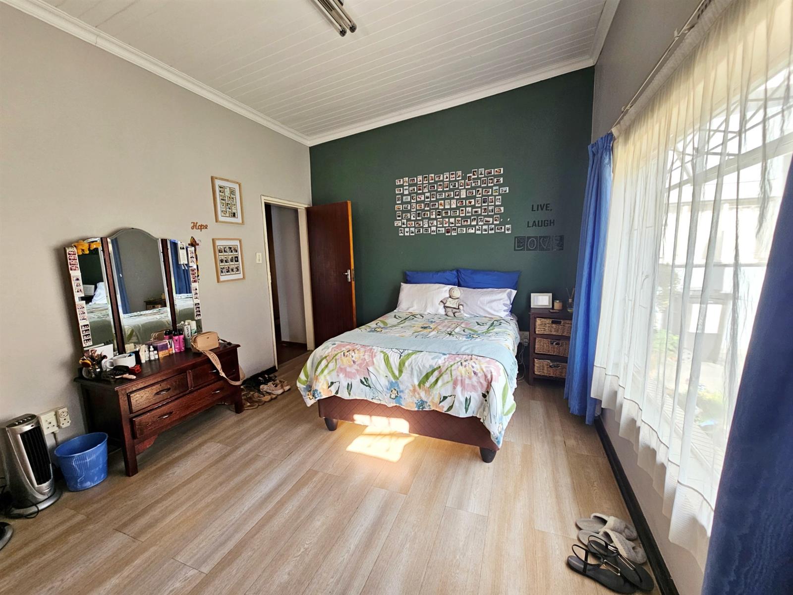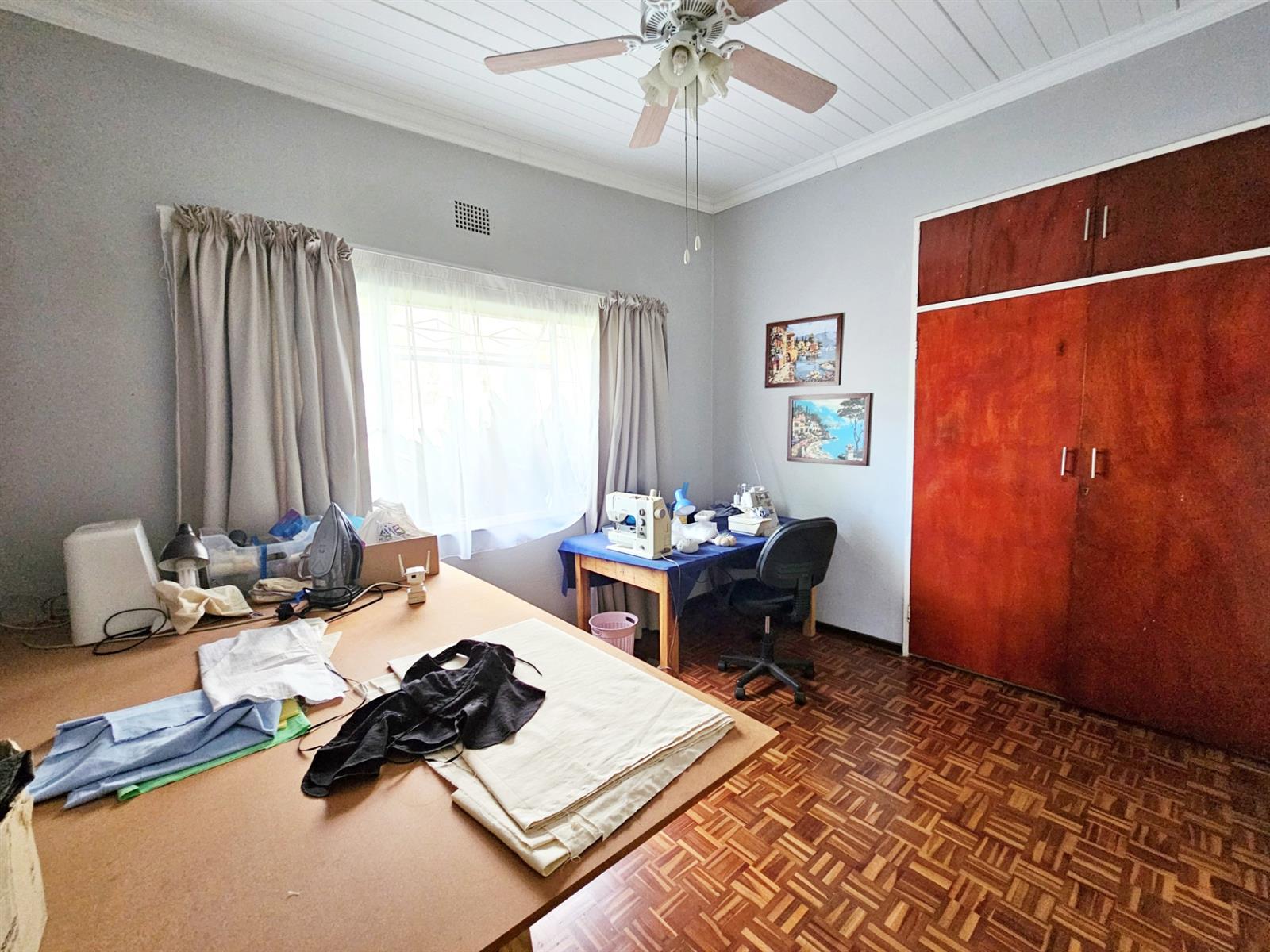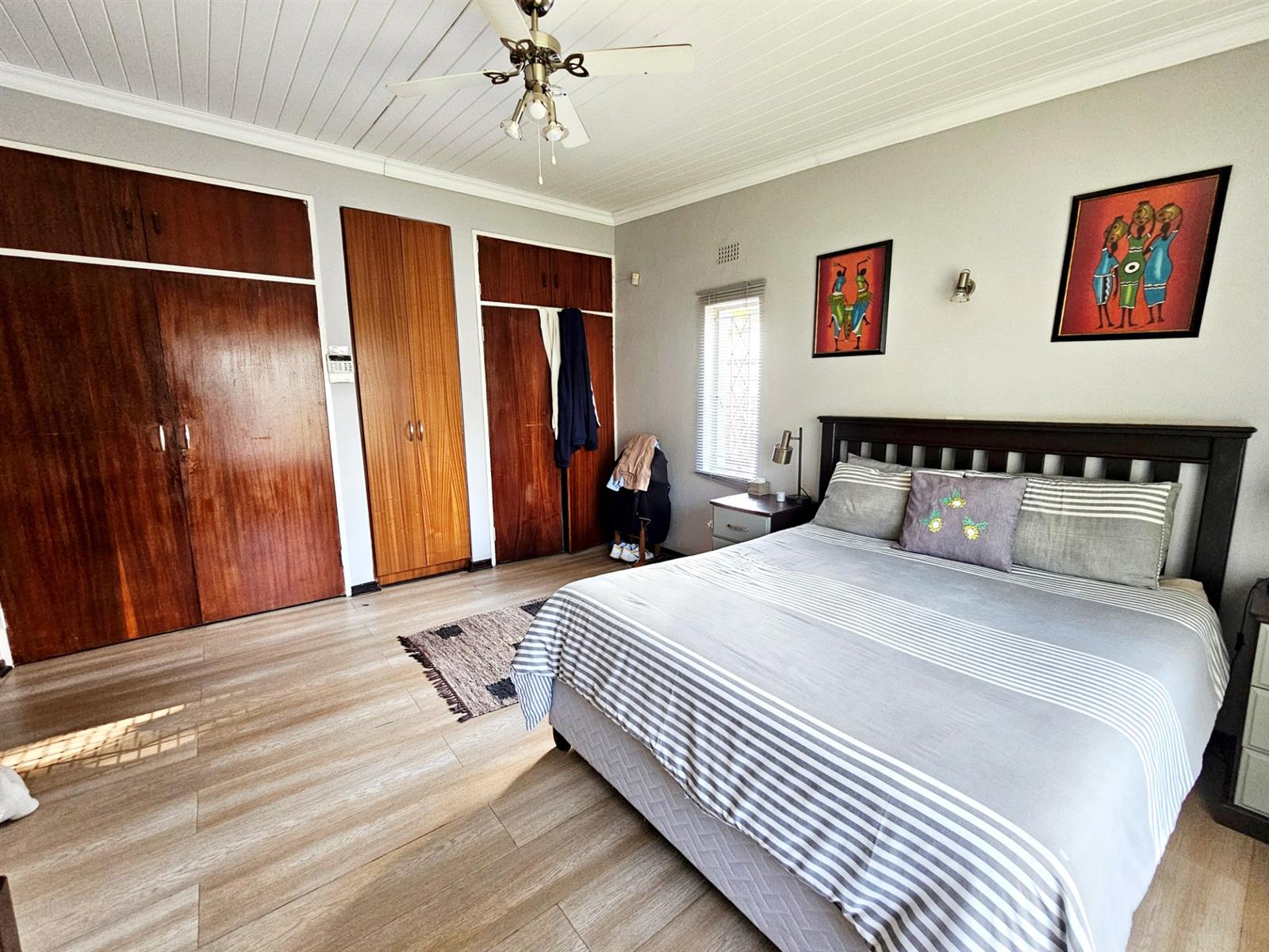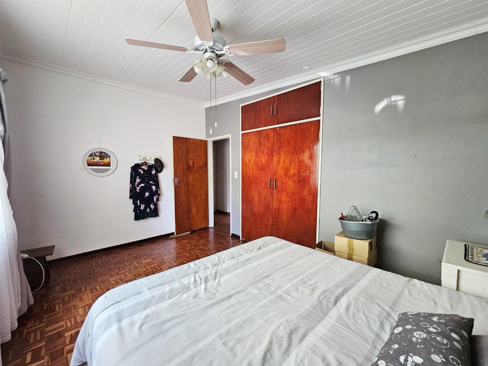 Down the long passage, you’ll find five generously-sized bedrooms — 3 of them with parquet floors and two laminated, all with extra cupboard space and ceiling fans (except for 1) — The main en-suite bathroom is a full bathroom with a modern shower and bath, The shared bathroom has a large walk-in shower. There are 2 geysers, so no one’s fighting for hot water. A separate guest loo with a basin adds convenience.