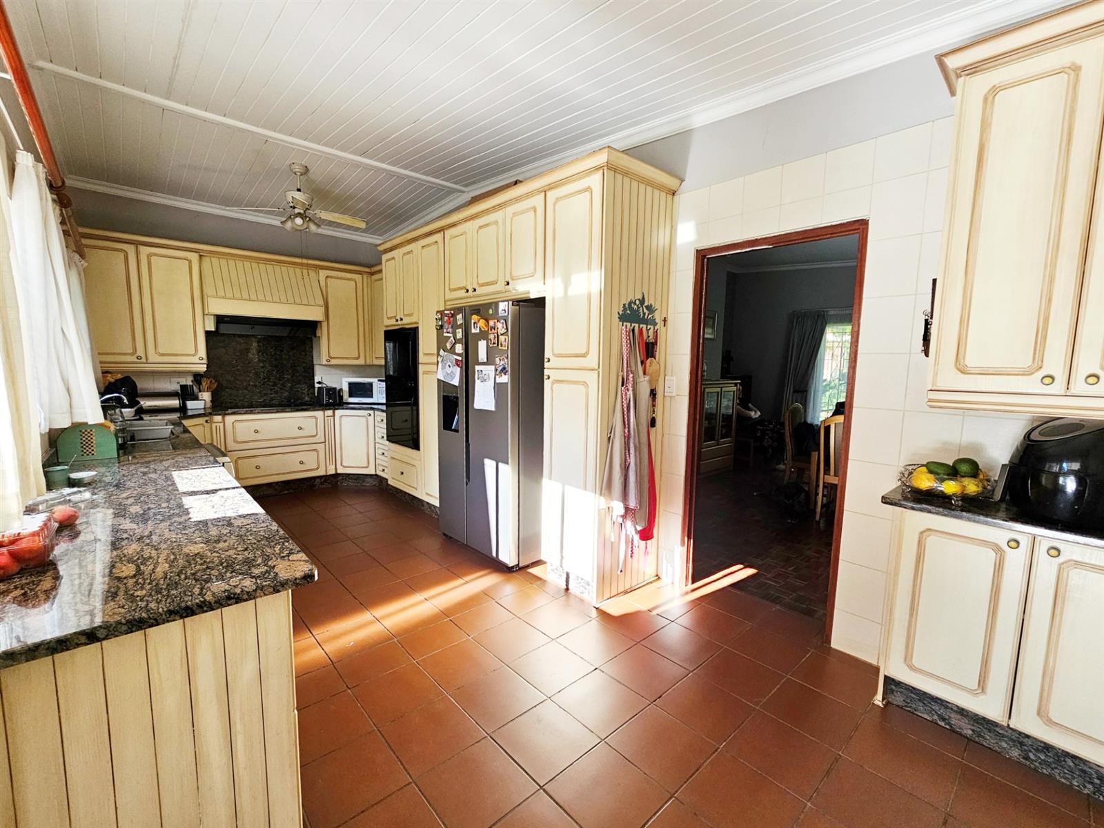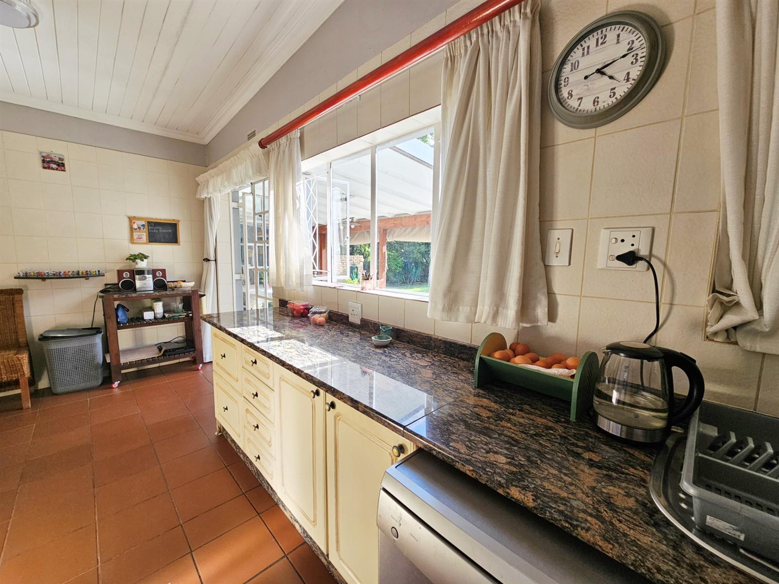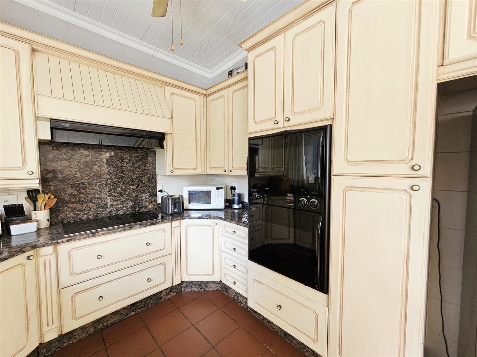 The kitchen? Generous and practical, with more than enough cupboard space and room for your double-door fridge. There is an eye-level, double oven and a large ceramic hob with extractor fan- catering for a large family or a group of friends, made easier. A dishwasher connection and granite counter tops. The kitchen, very practically, leads into the dining room as well as opens out, via French doors to the long, outside, covered, entertainment patio.