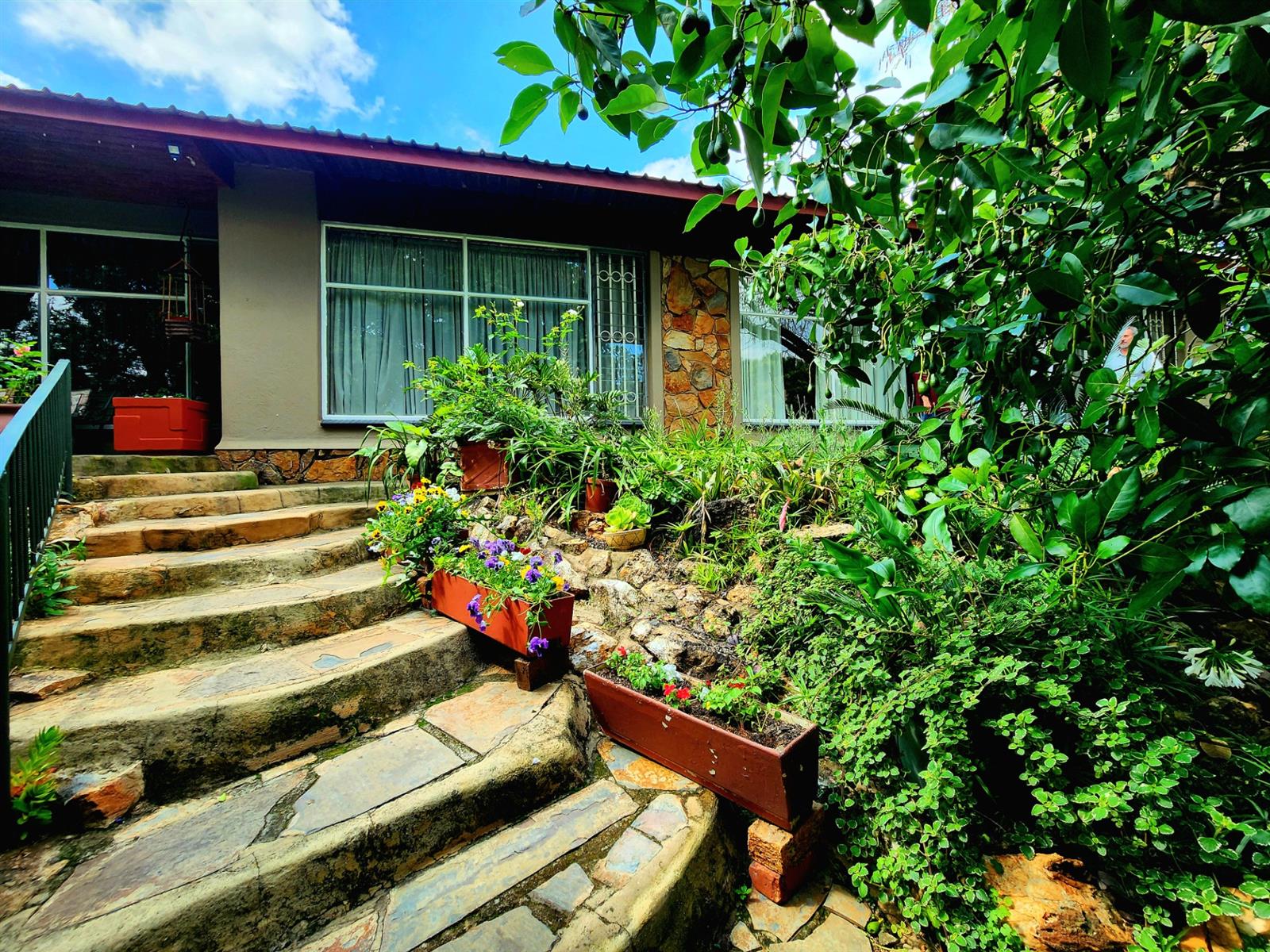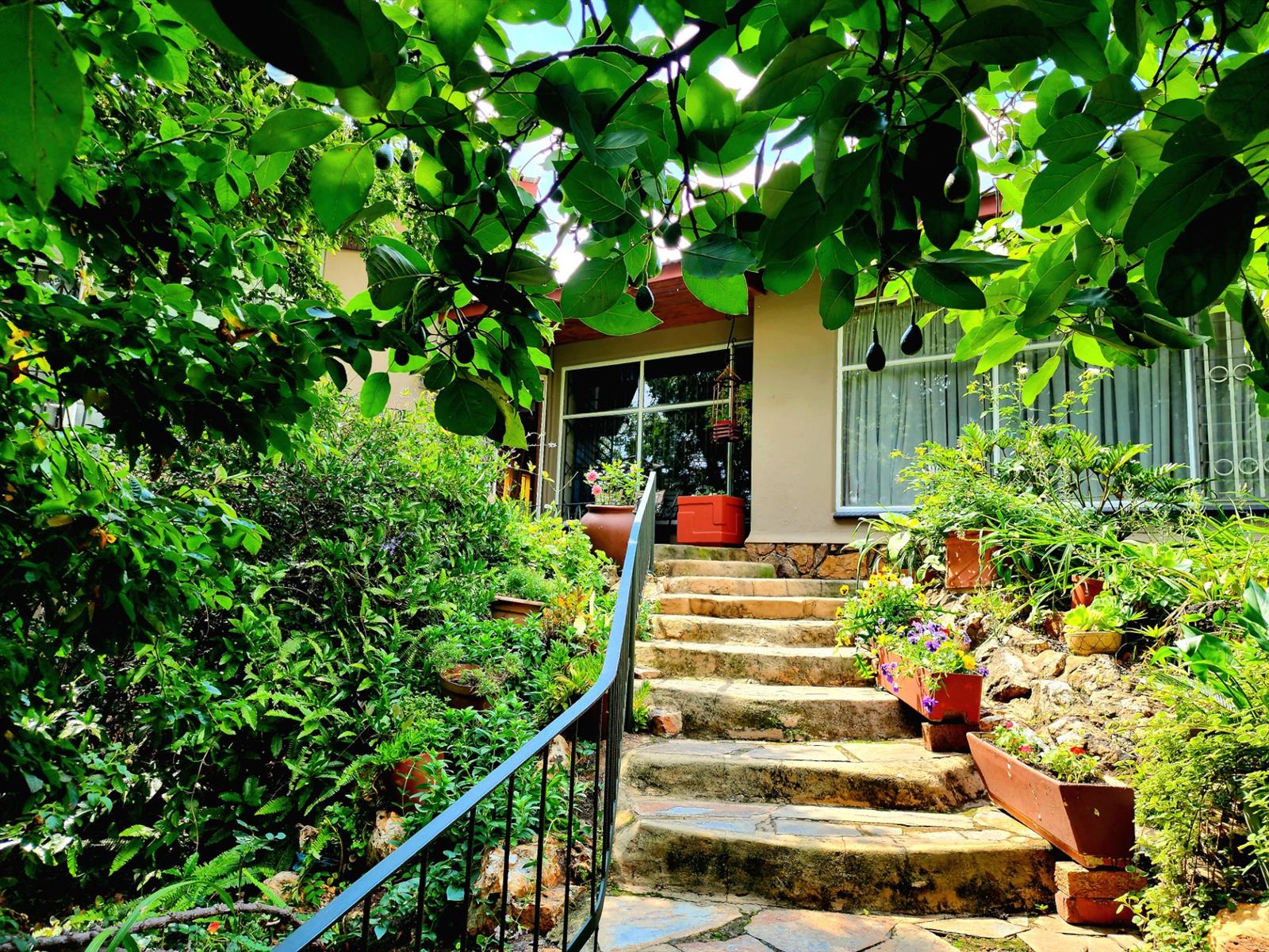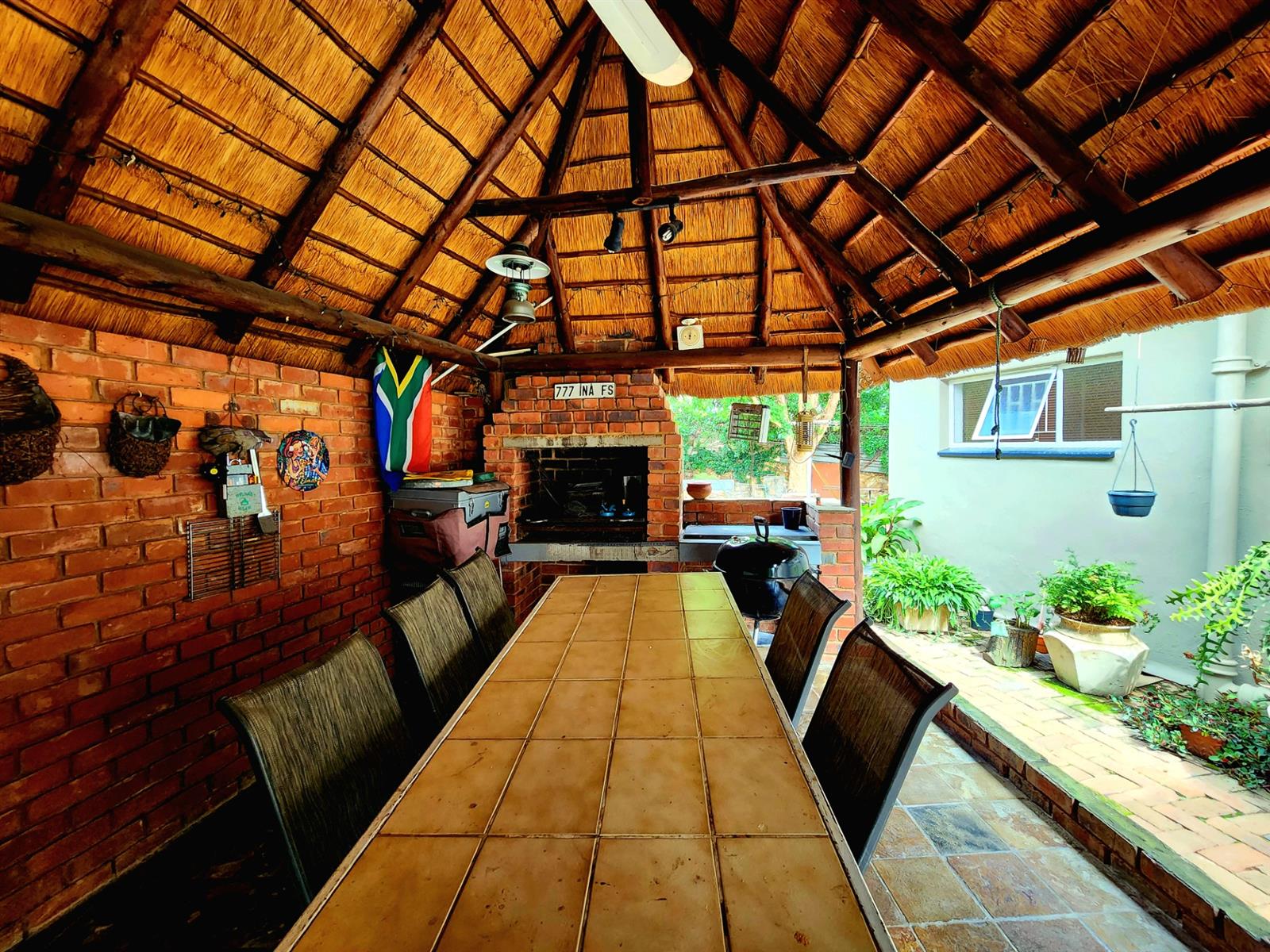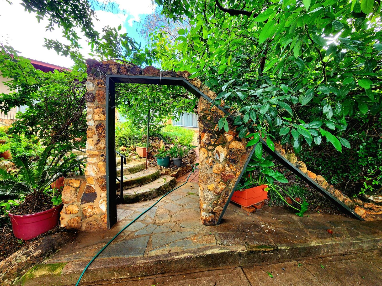 This charming home offers generous space, exotic garden and modern convenience and exceptional comfort. The interior features four bedrooms, two bathrooms (including an en-suite), an inviting entrance hall, two spacious living areas, a dining room, a study and a walk-in linen closet. The kitchen is fitted with a gas stove and is complemented by a separate laundry and pantry. Additional conveniences include a fireplace, pre-paid electricity, a storeroom or domestic room with an outside toilet, plus a double garage and double carport.
