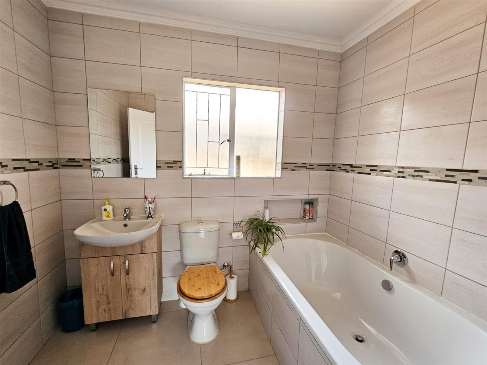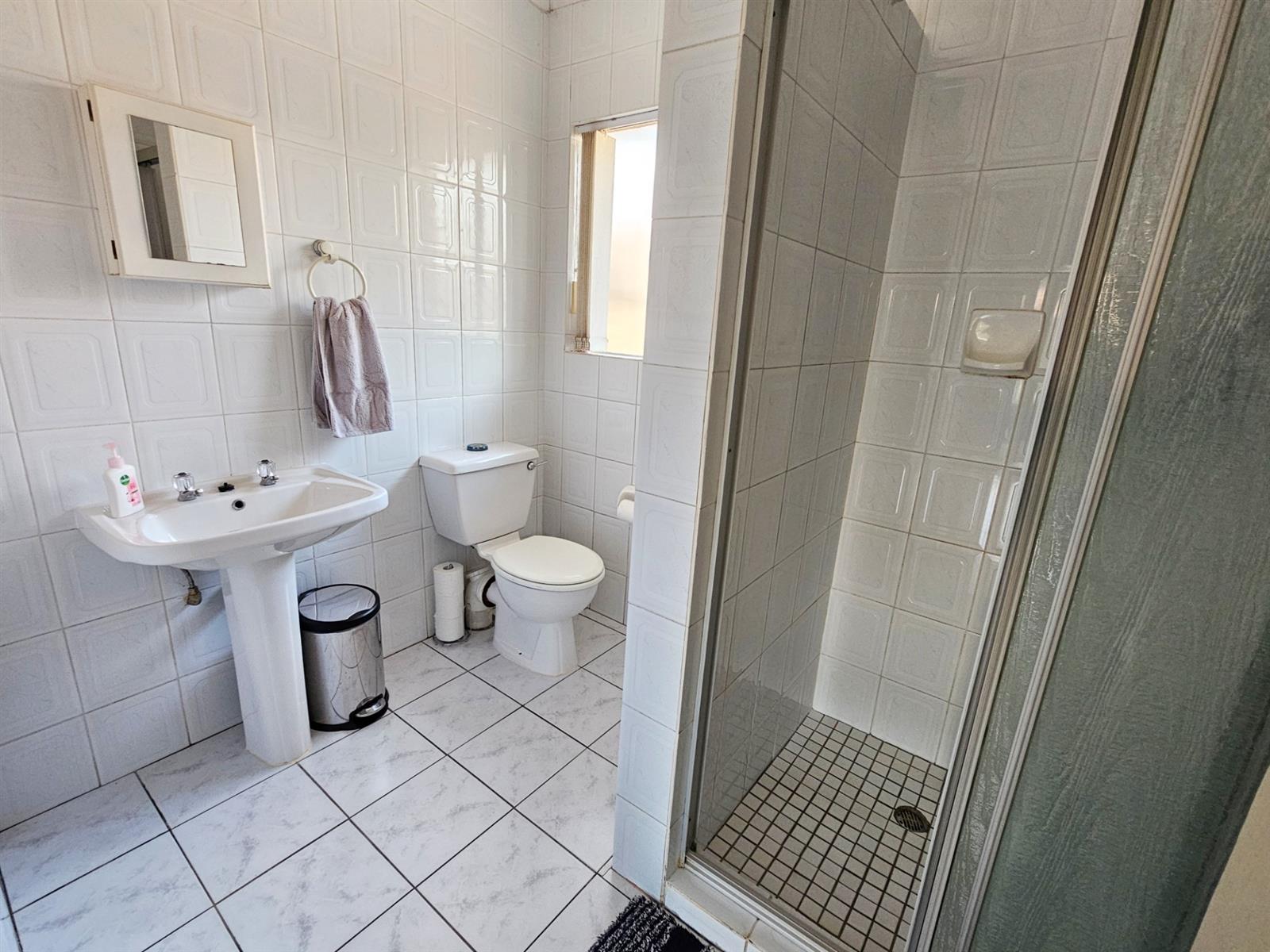Abundant natural light floods the front of the house, including two of the roomy bedrooms. The main bedroom is impressively spacious, featuring laminate flooring, modern cupboards, and a newly renovated en-suite bathroom with a bath. The second bedroom comfortably fits a queen-size bed, and the third, a double. Both include built-in cupboards and share a neat bathroom with a shower.