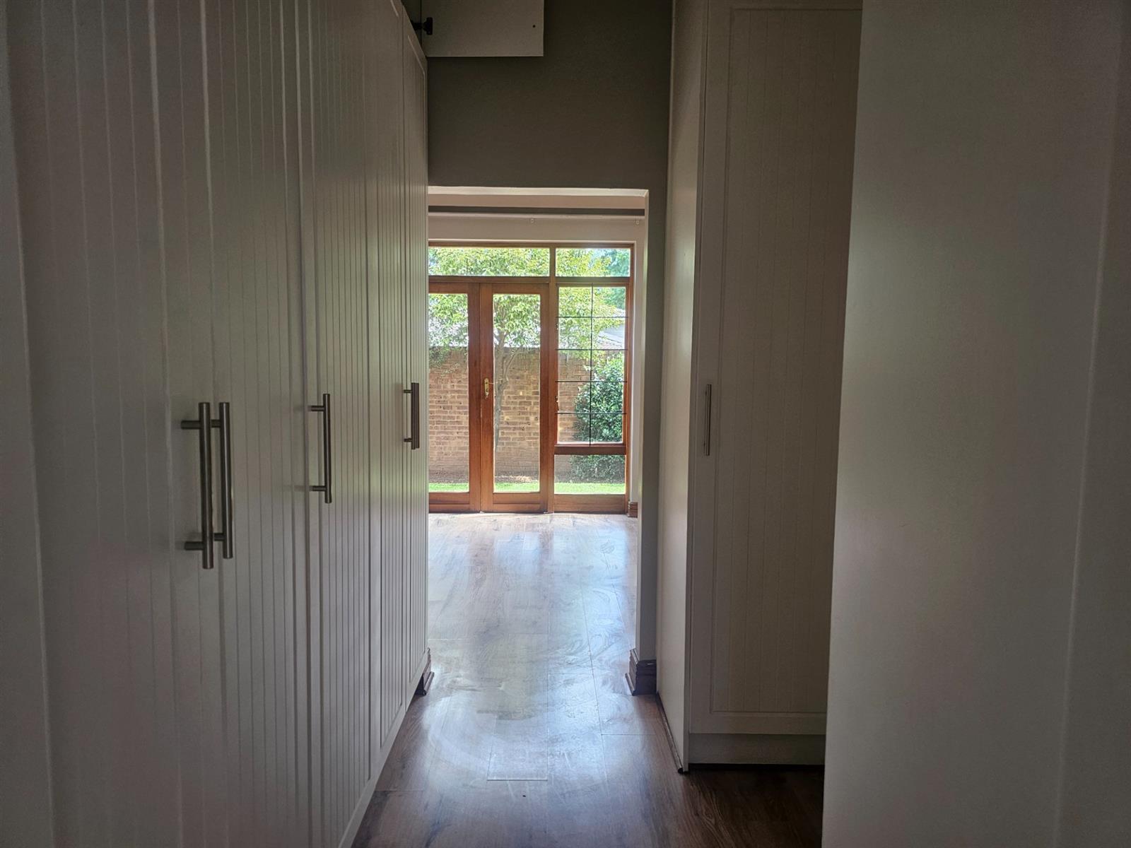 The home features three spacious bedrooms with laminated floors and built-in cupboards. The luxurious main suite boasts a walk-in closet and a full en-suite bathroom with double basins, bath, shower and toilet, while the second bathroom is equally well appointed. A double garage with direct access to the house adds convenience, and the private, well-maintained garden is pet friendly and inviting.