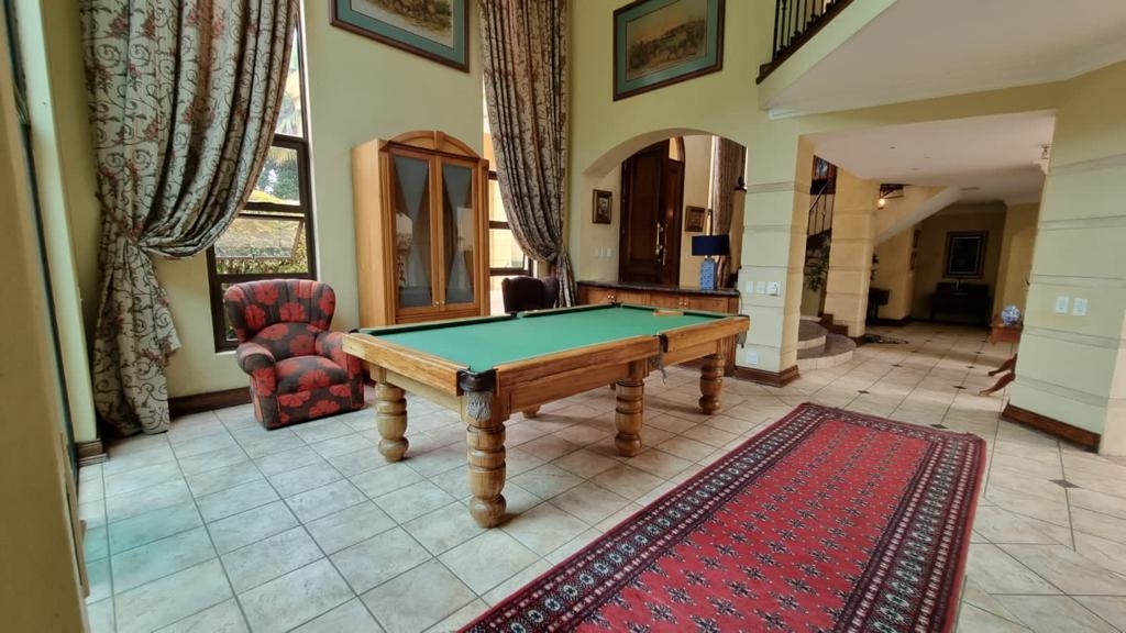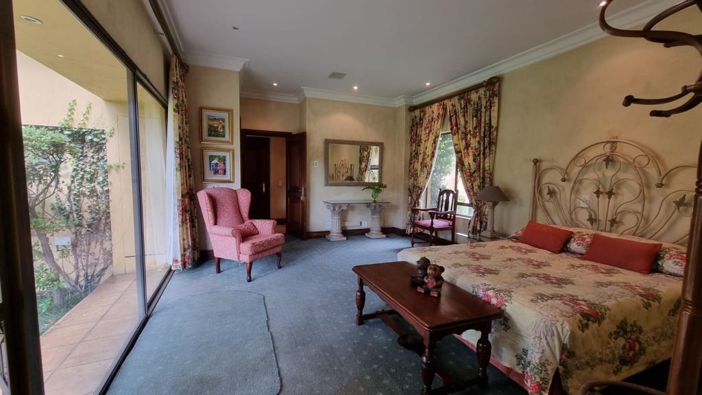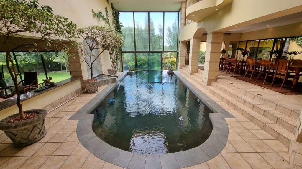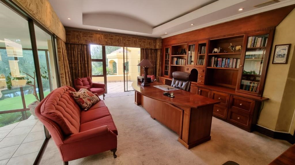 The unique marble staircase with designer balustrades leads up to the second floor. Here you have a study corner with solid wood desk and book case. There are two double volume bedrooms with walk in cupboards and own en-suite as well as doors that open up onto private balconies. You will also find the most amazing home office with a view over the entire garden, fitted with solid wood furniture, built in book case and a sliding door that opens up onto a balcony that overlooks the indoor pool.