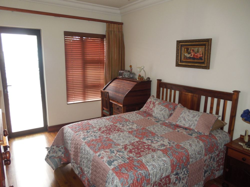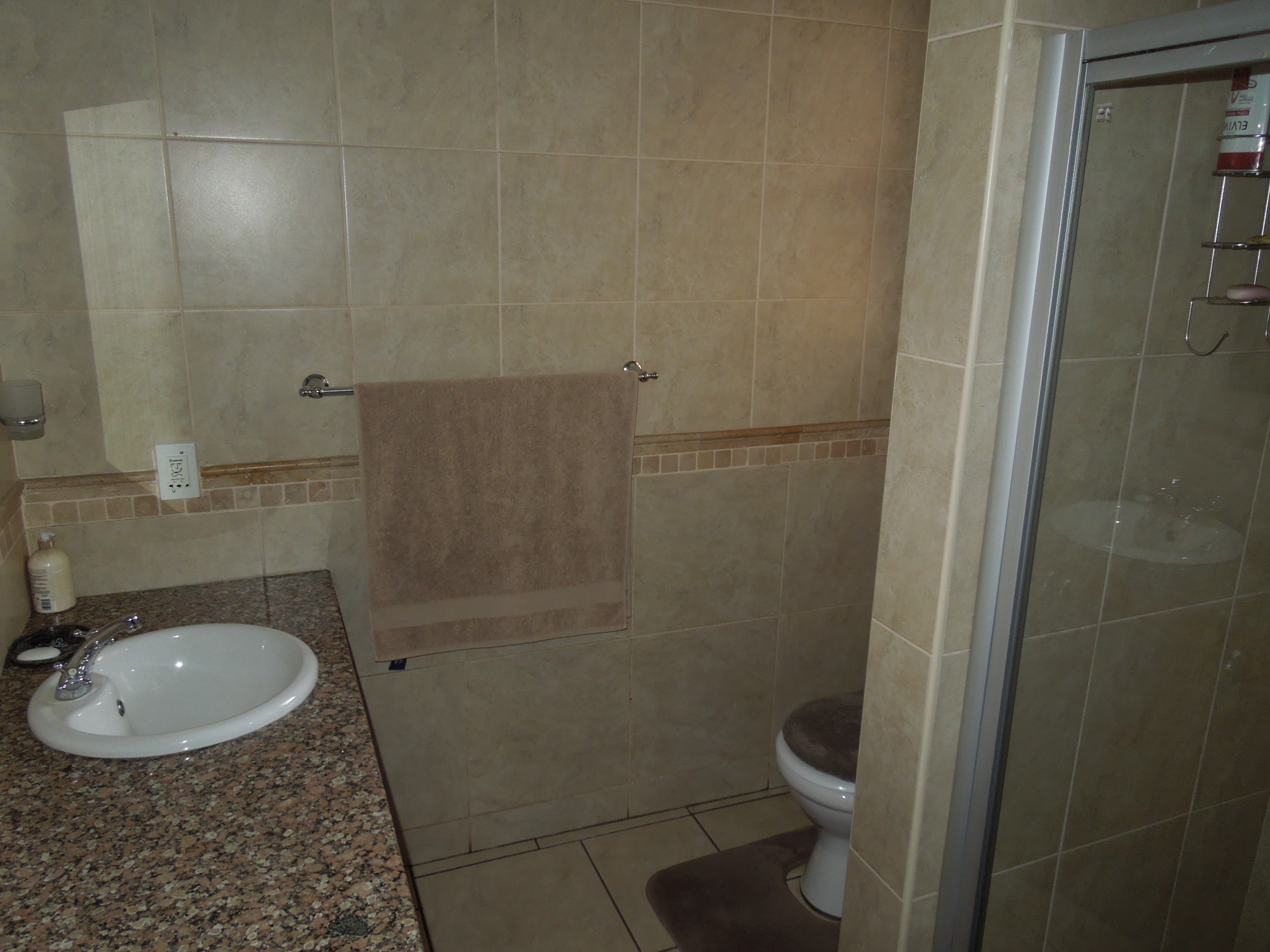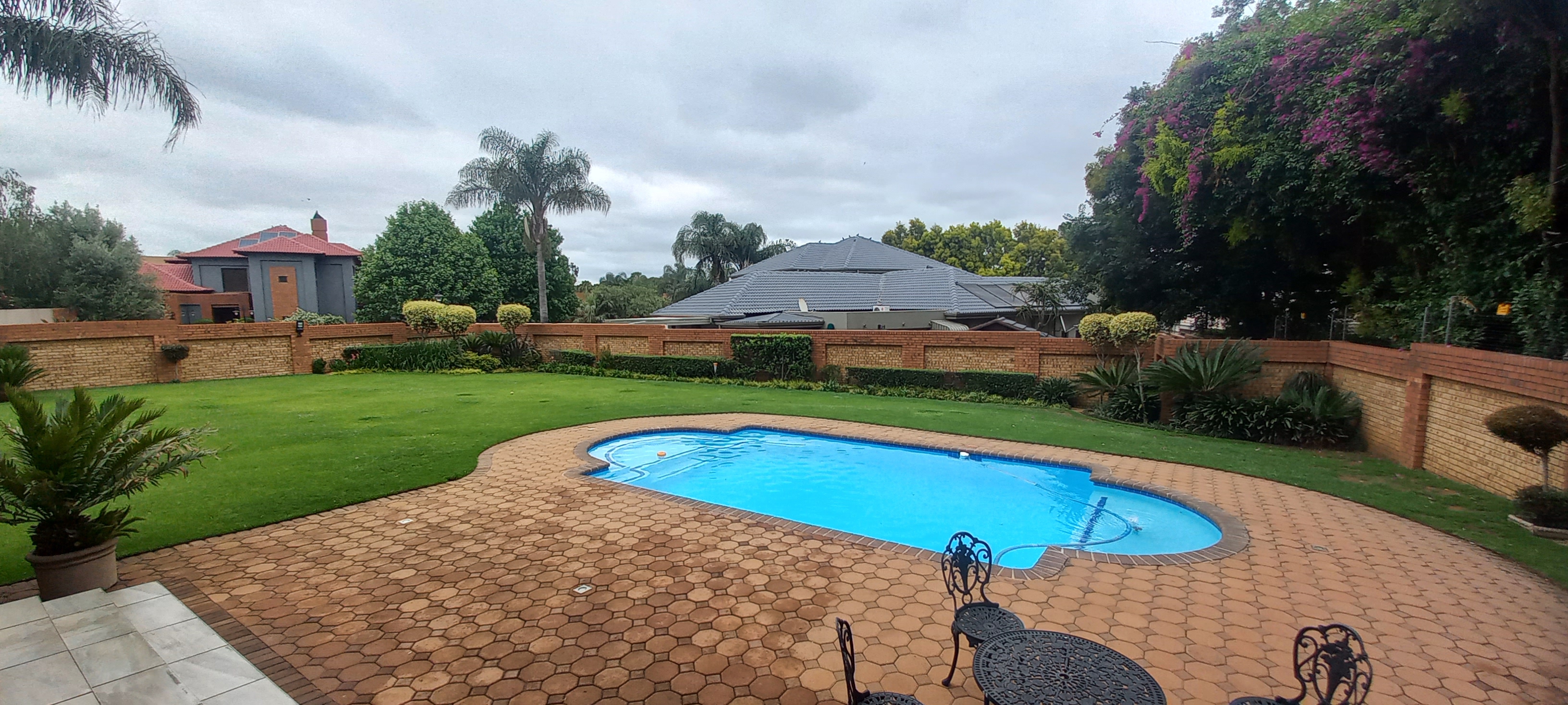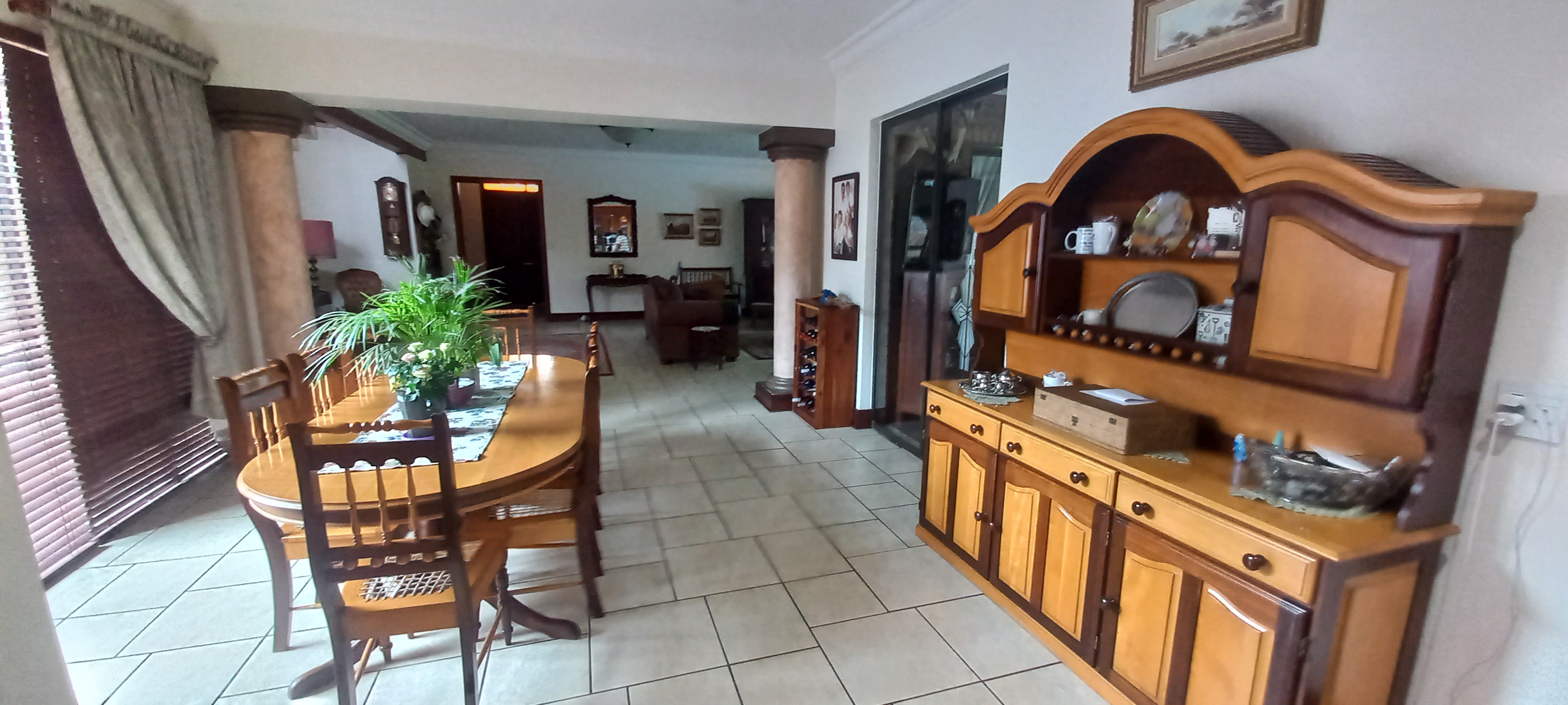The entertainment area, with glass sliding doors, has a large serving hatch into the kitchen, ensuring cullinary delights are enjoyed all year round. There is also a built in bar counter as well as braai (part of which can be converted to gas should you wish to do so) catering for all entertainment needs. This in turns leads out to the vast, private garden and sparkling swimming pool!