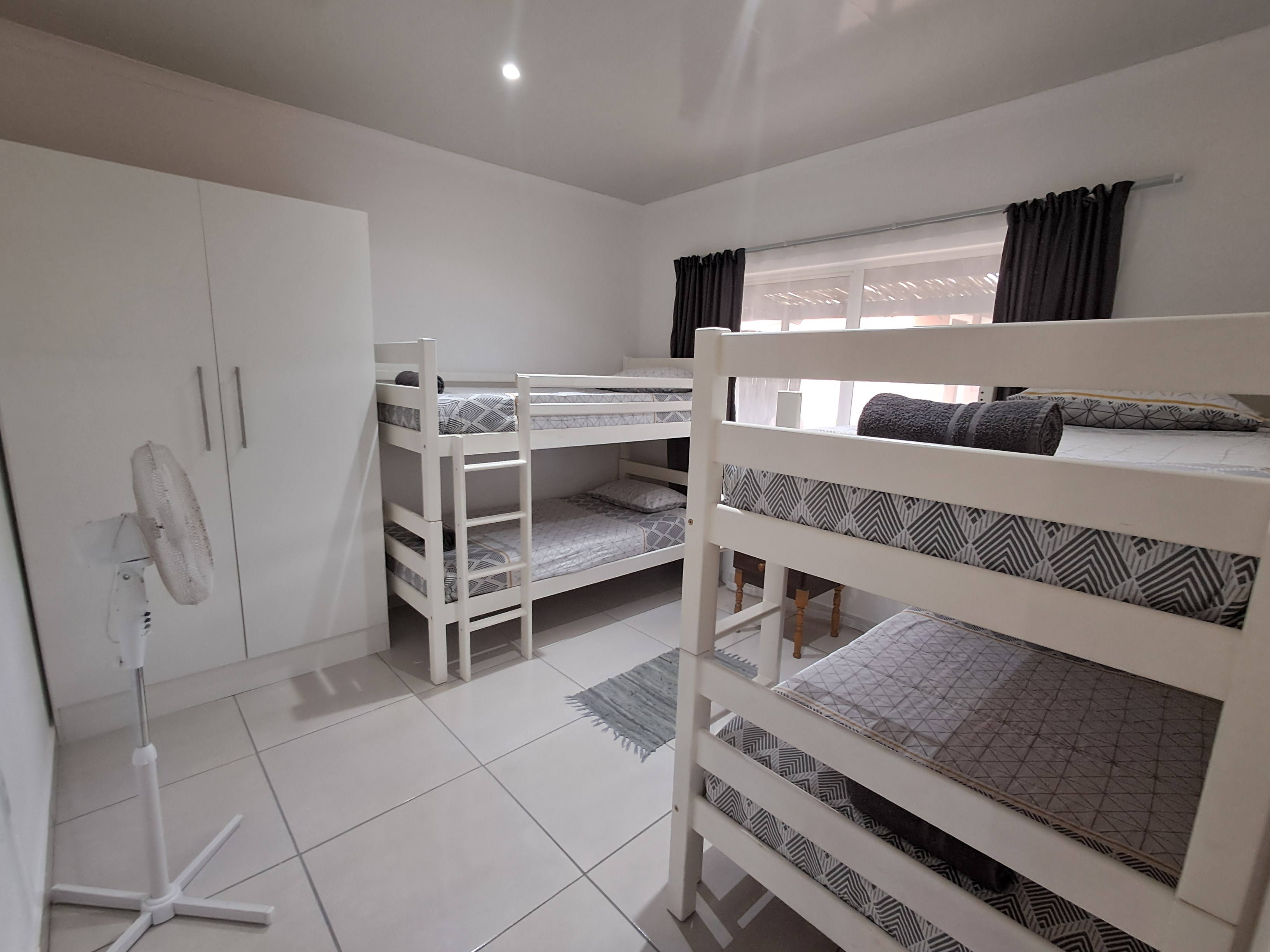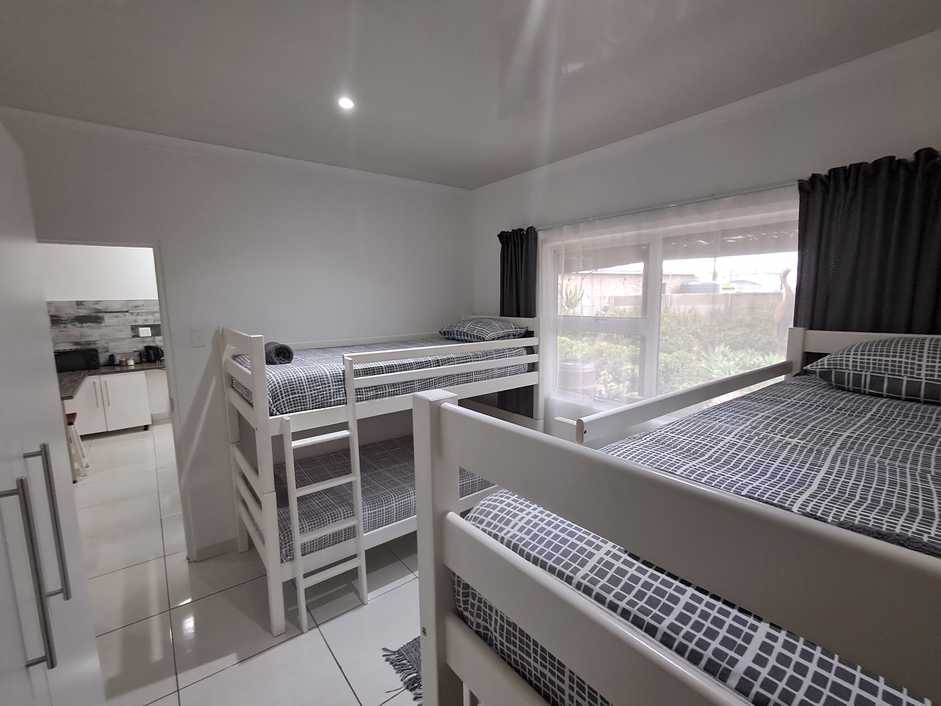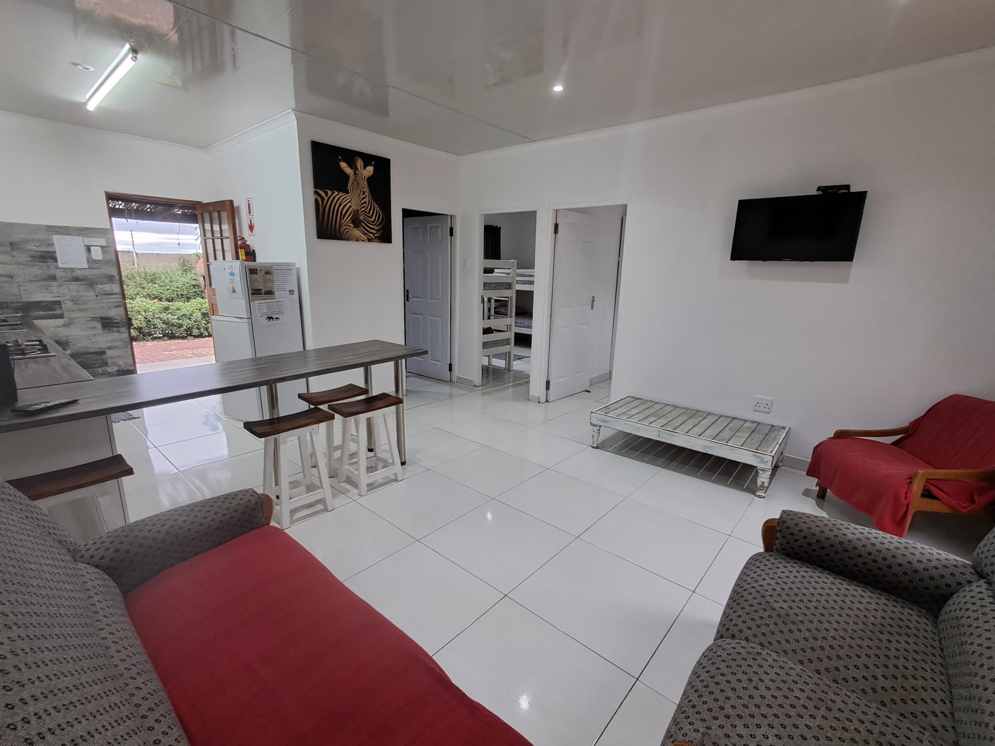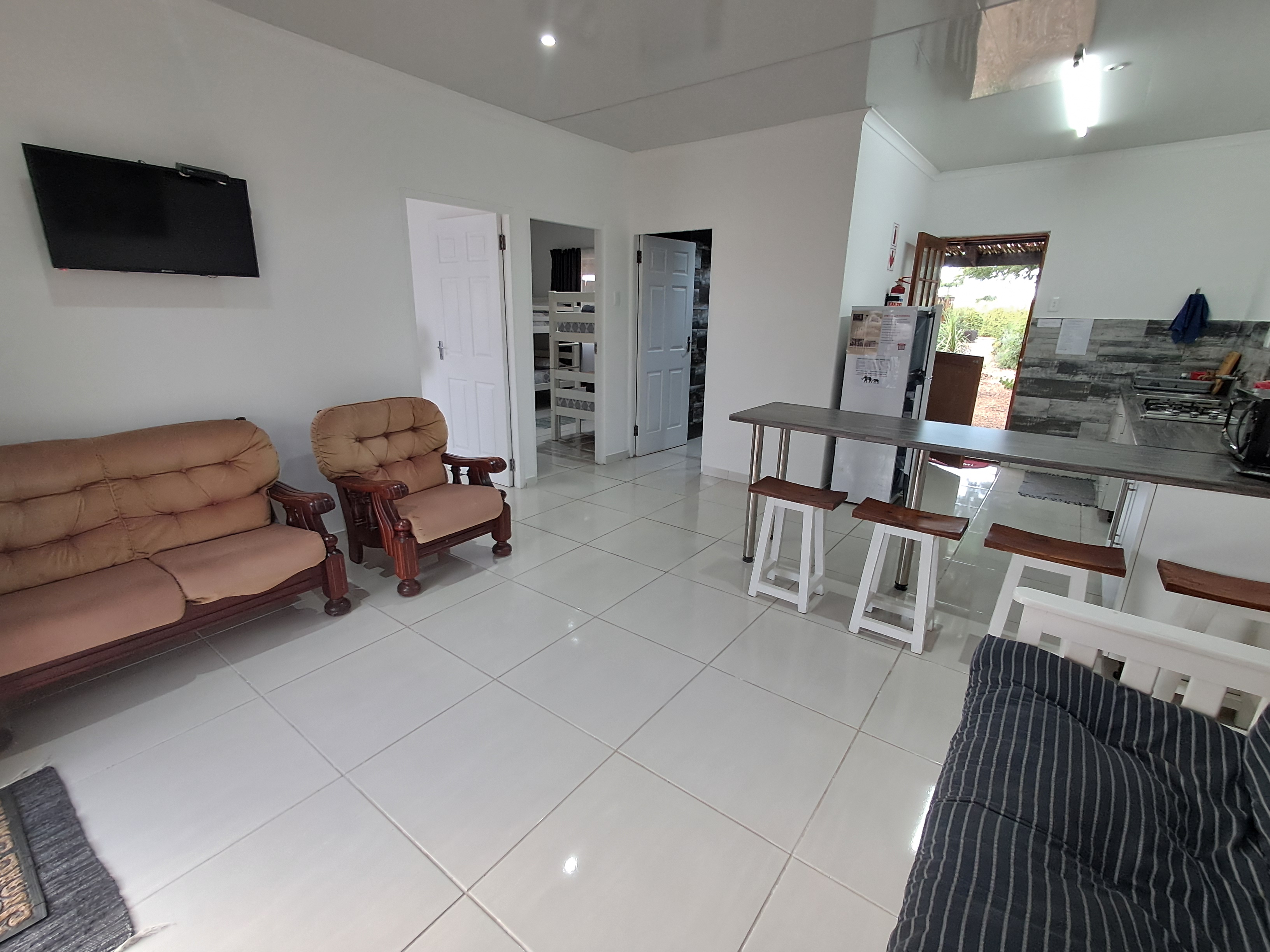 Each spacious unit features two bedrooms (one with a double bed, the other with two double bunks), a modern bathroom with a shower, toilet, basin and extractor fan, with an open-plan kitchen and lounge area that seamlessly extends to a private outdoor braai and wooden table set.