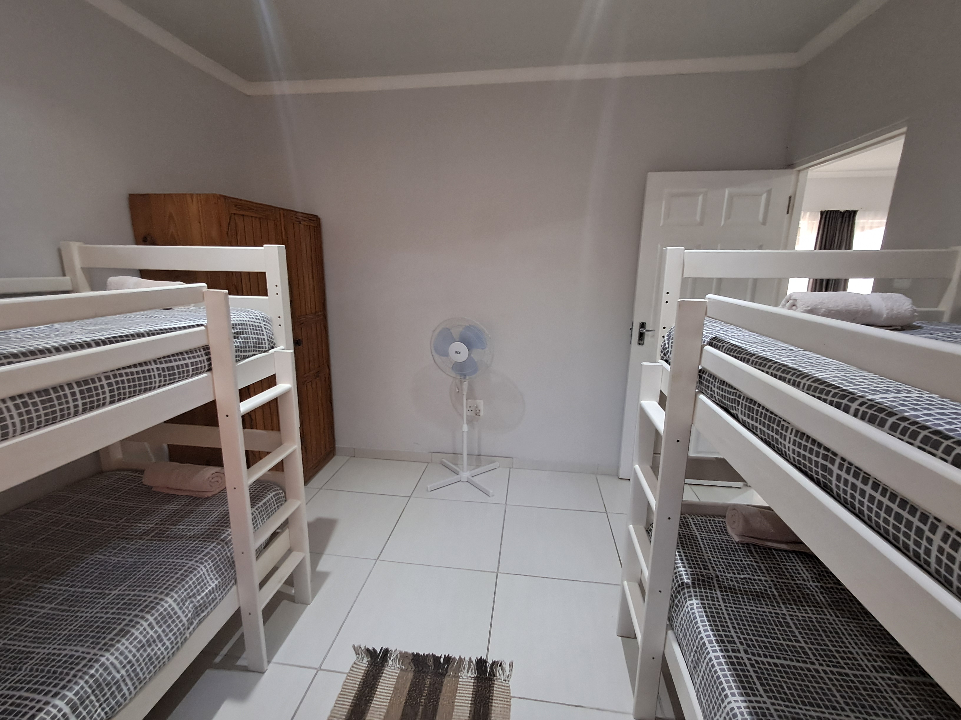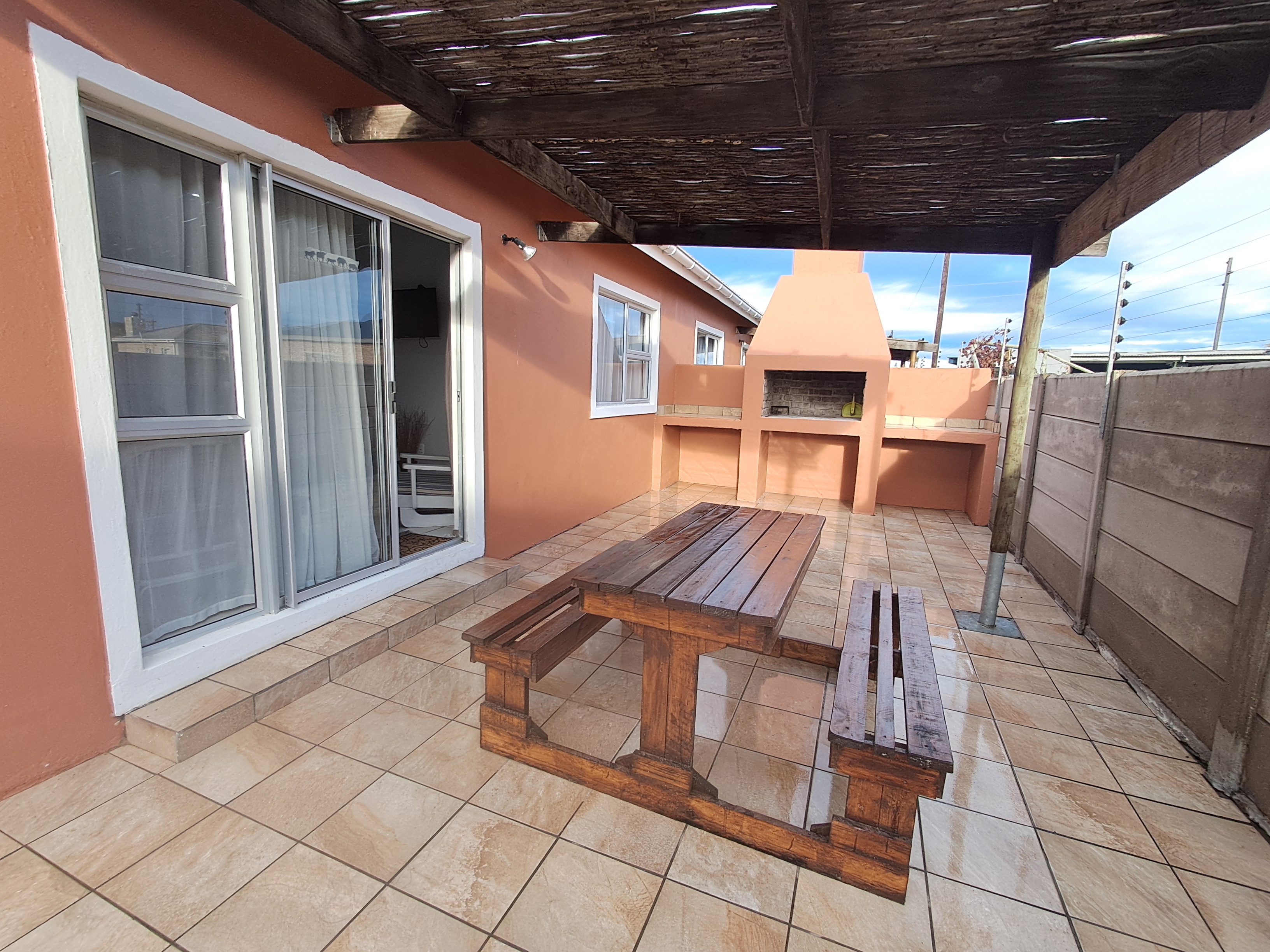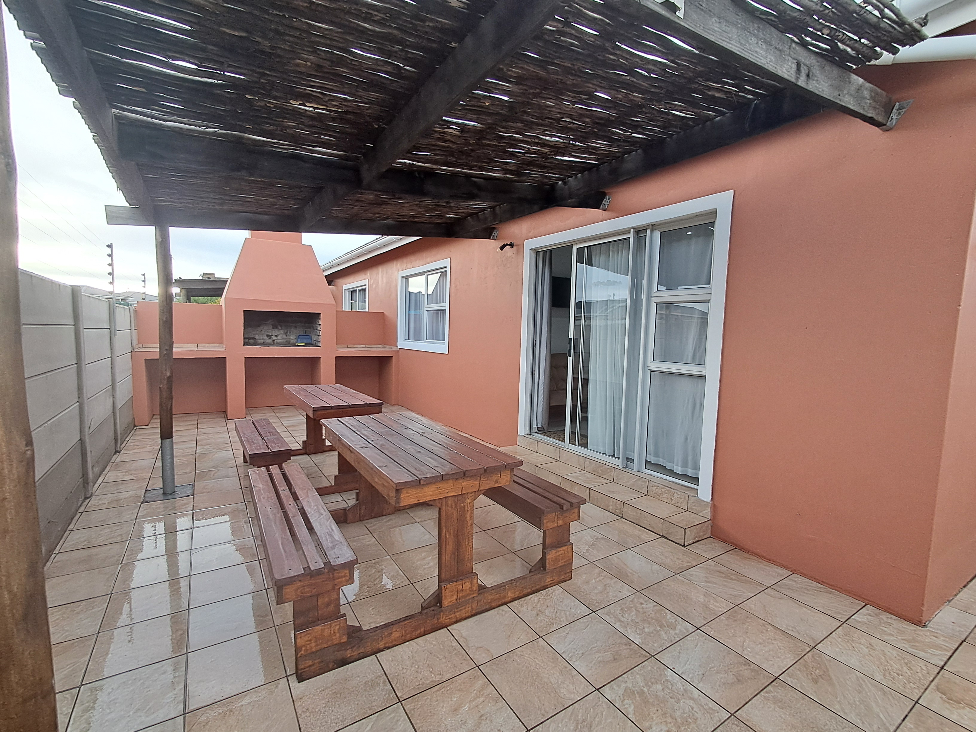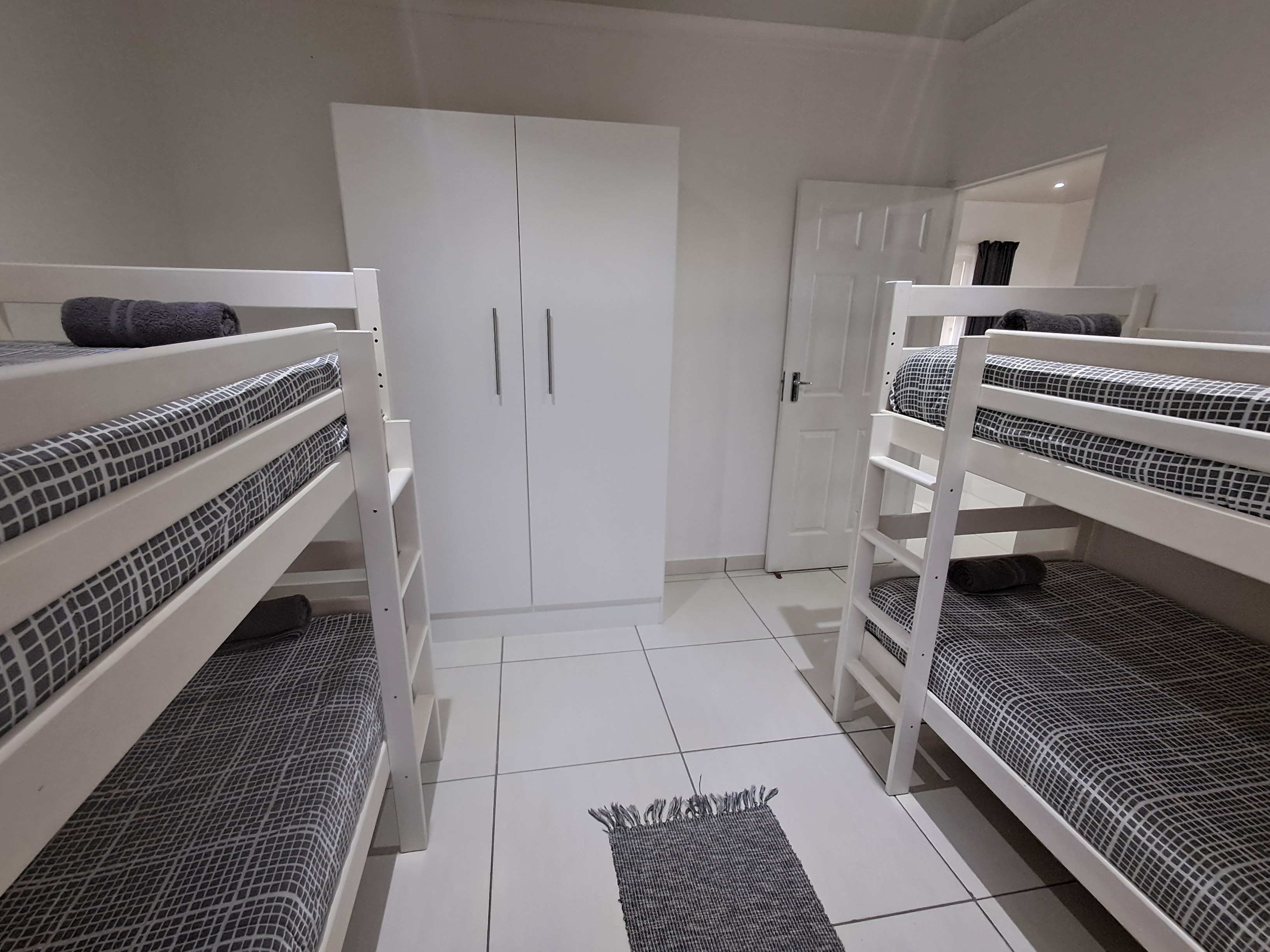Each spacious unit features two bedrooms (one with a double bed, the other with two double bunks), a modern bathroom with a shower, toilet, basin and extractor fan, with an open-plan kitchen and lounge area that seamlessly extends to a private outdoor braai and wooden table set.