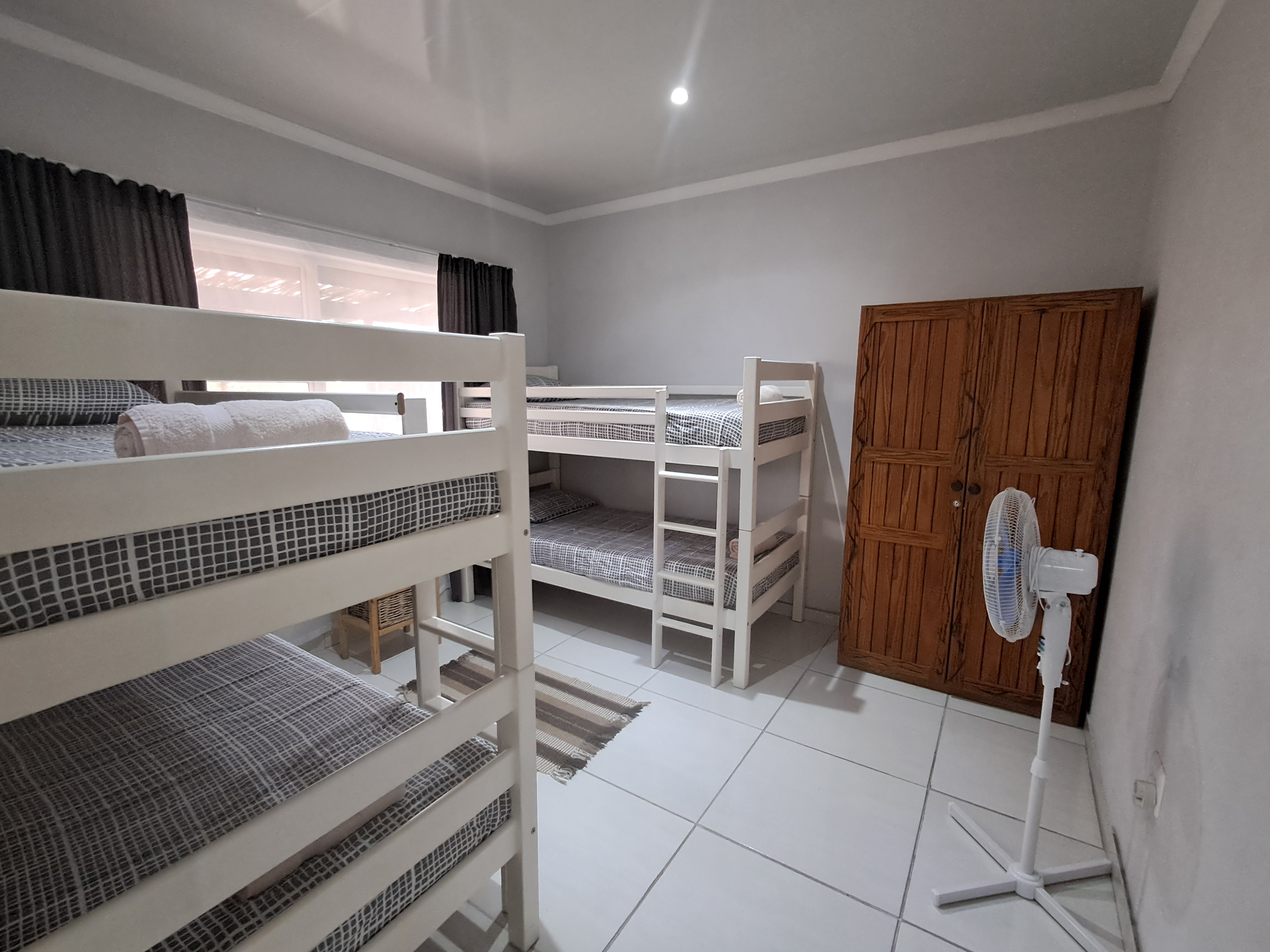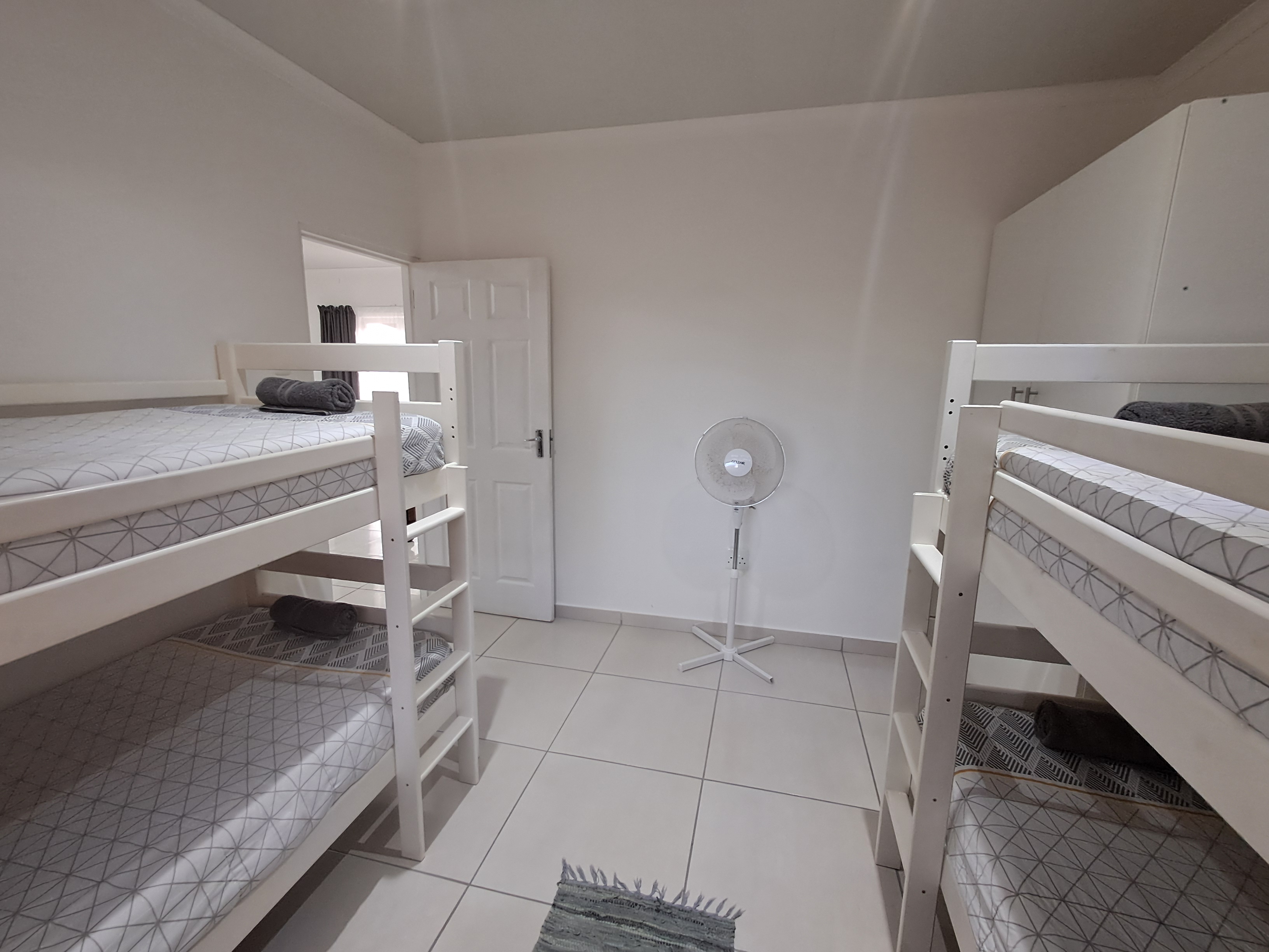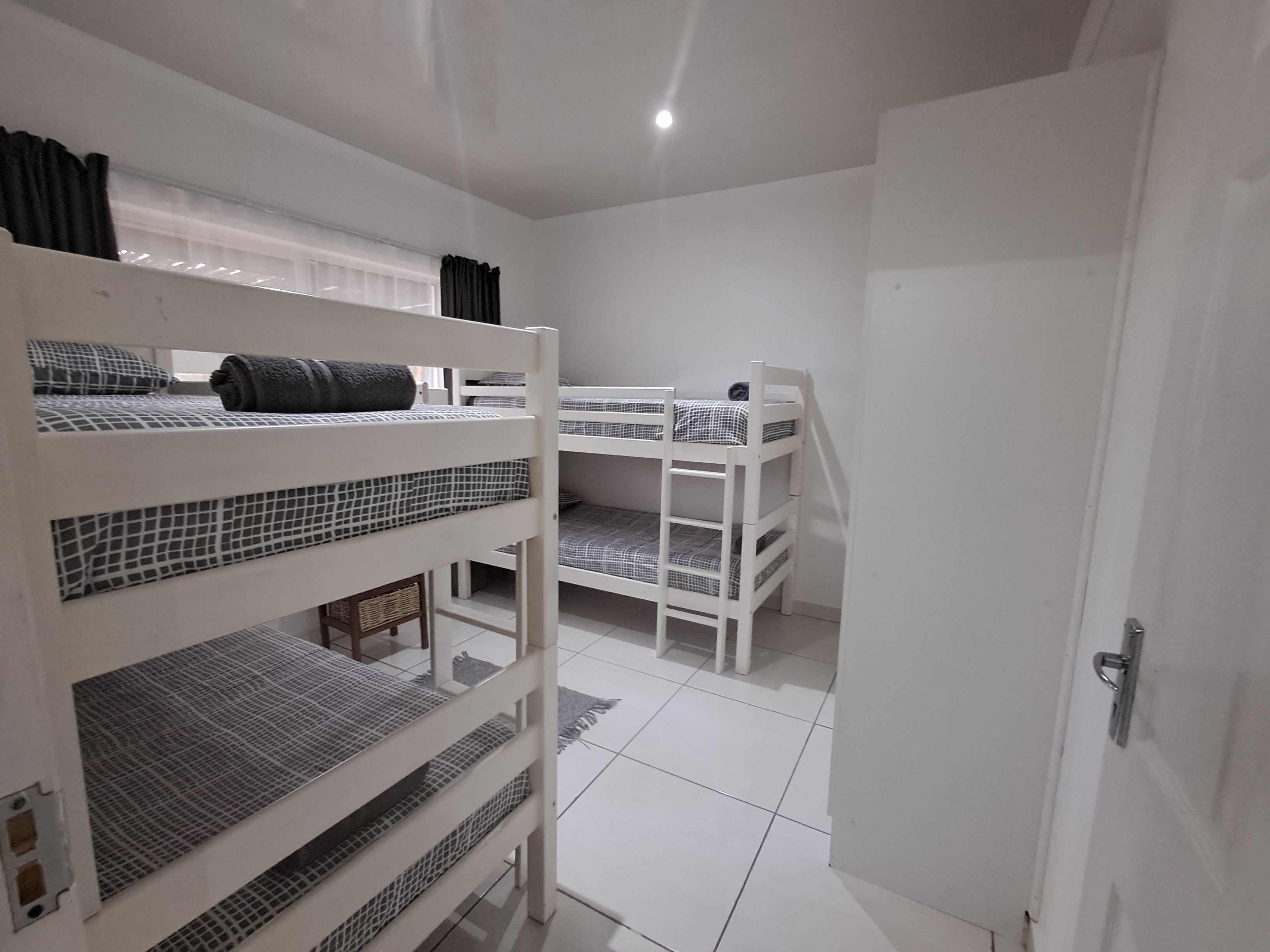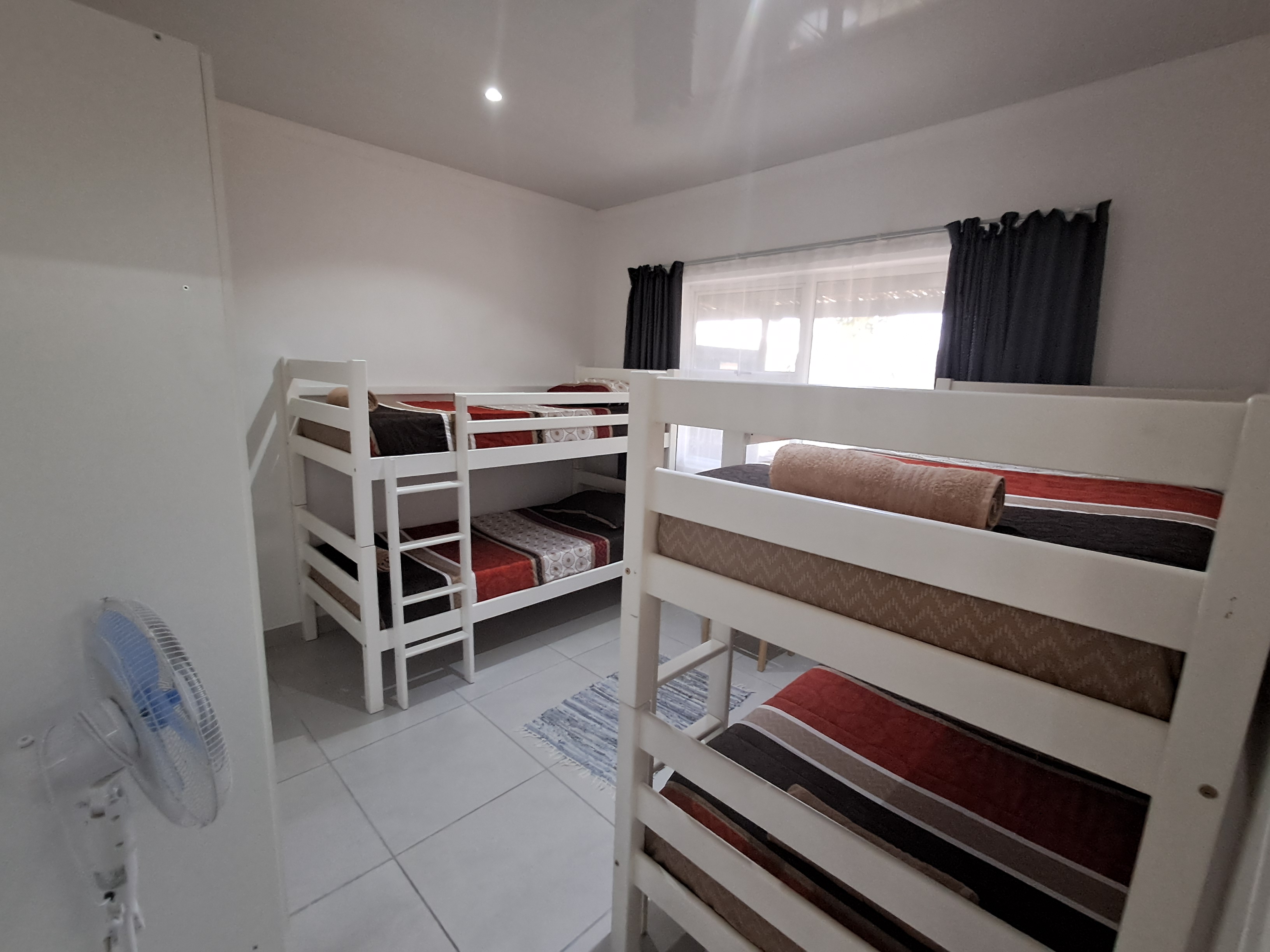 Each spacious unit features two bedrooms (one with a double bed, the other with two double bunks), a modern bathroom with a shower, toilet, basin and extractor fan, with an open-plan kitchen and lounge area that seamlessly extends to a private outdoor braai and wooden table set.