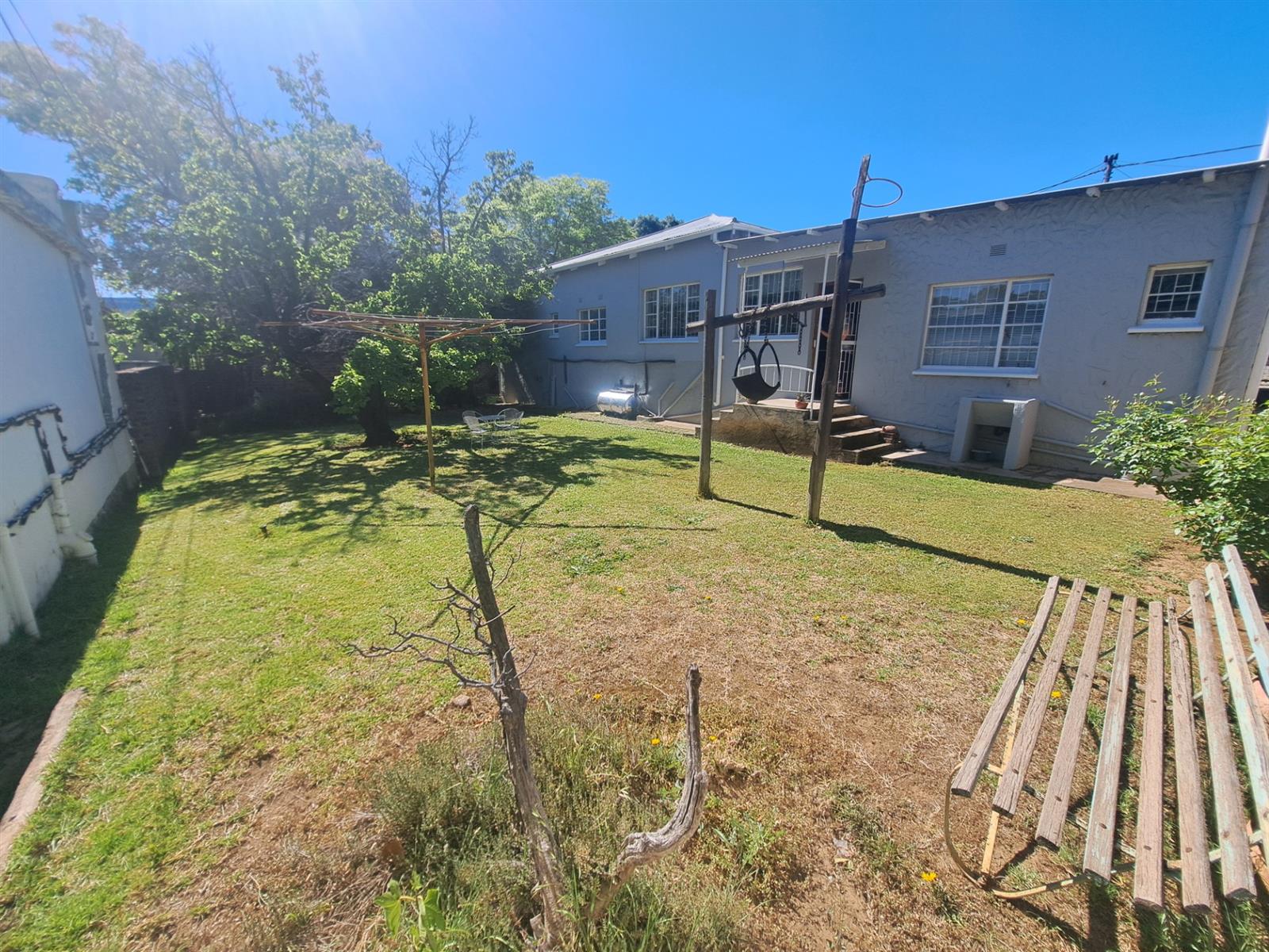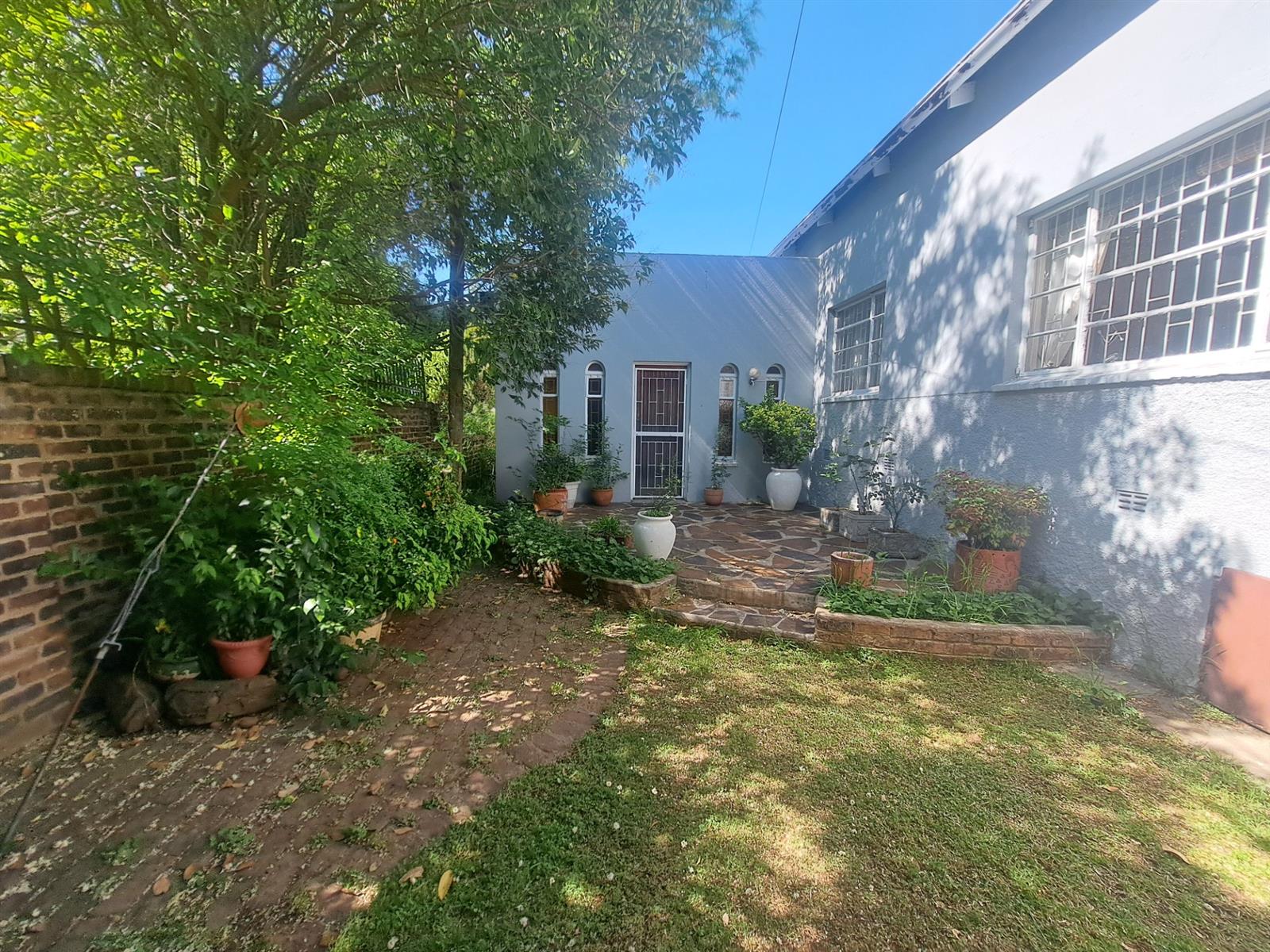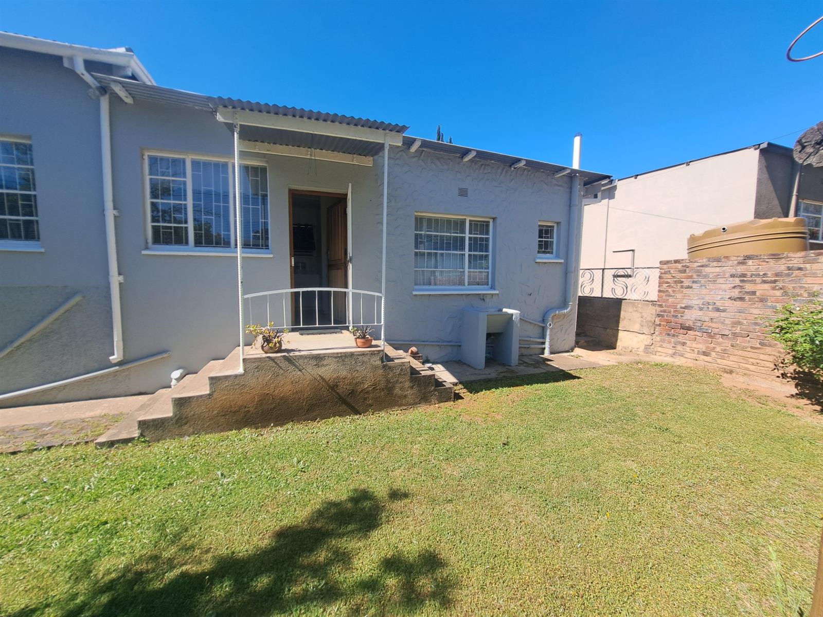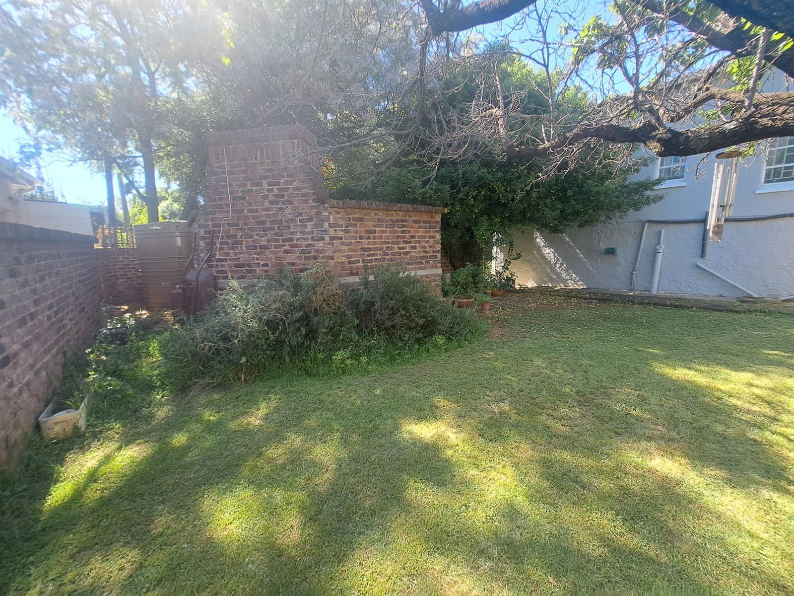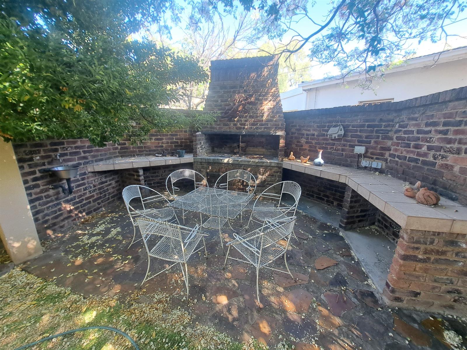 The inviting outdoor area boasts a built-in braai under a shady tree, perfect for relaxed family gatherings. A very practical 5,000-liter water tank with a pressure pump and manual irrigation system adds convenience and cost-effectiveness.