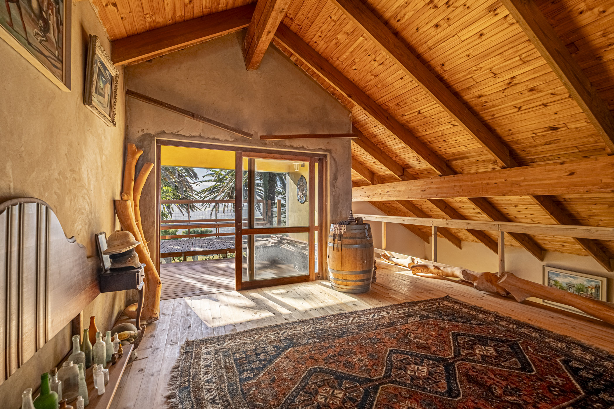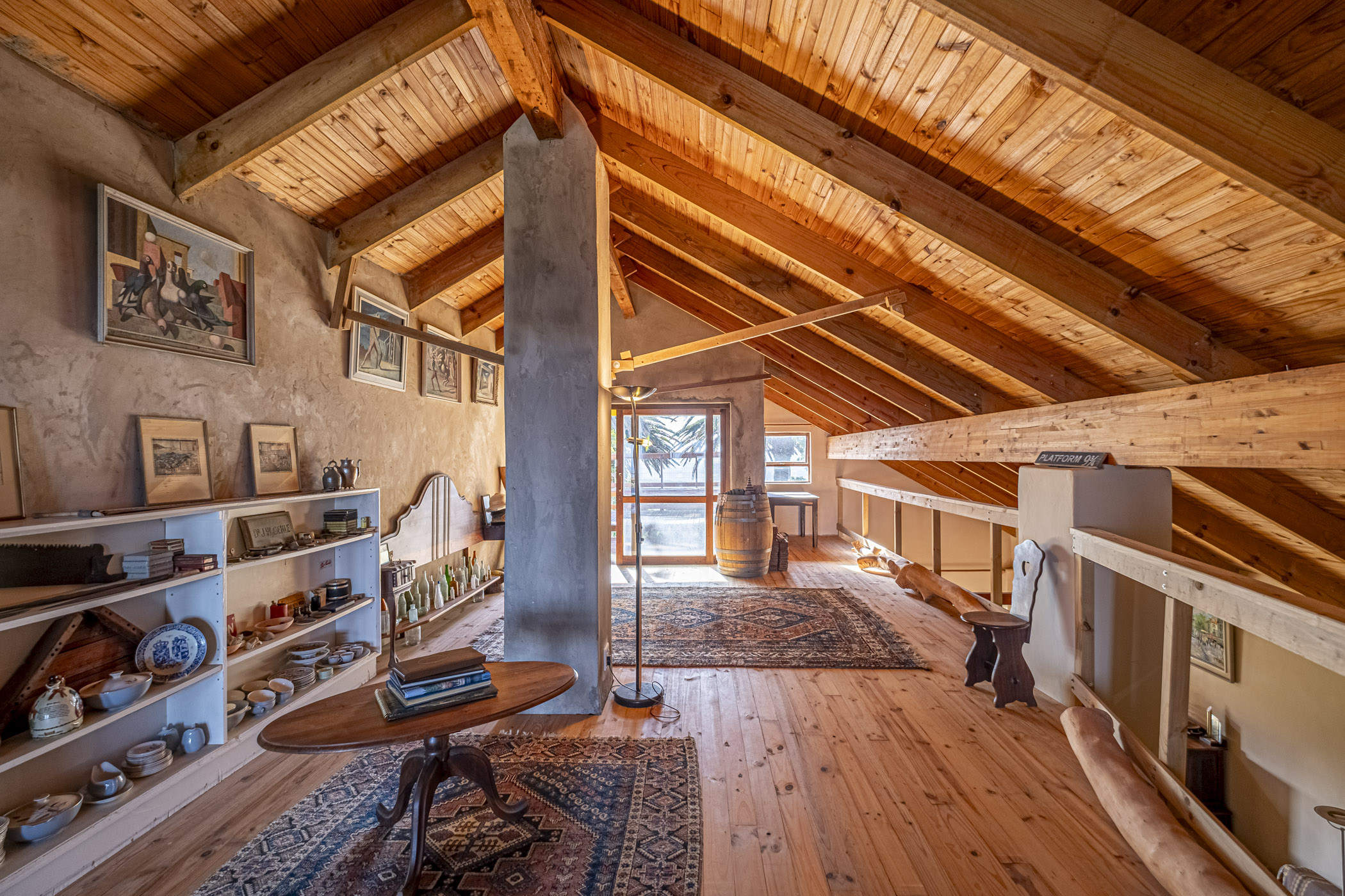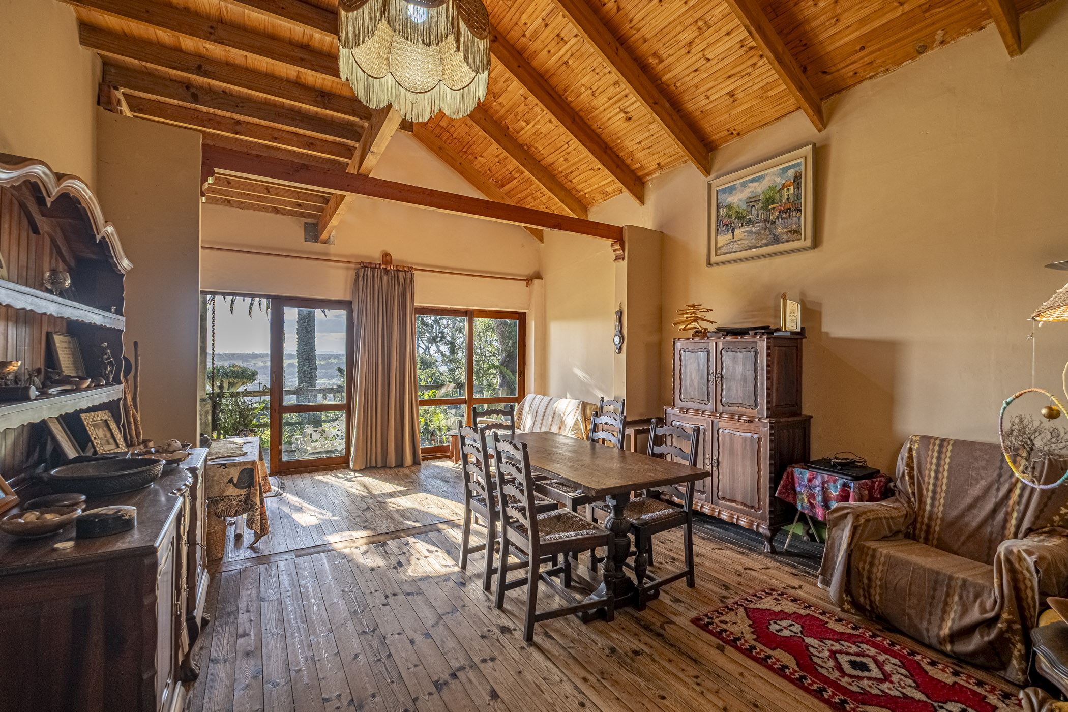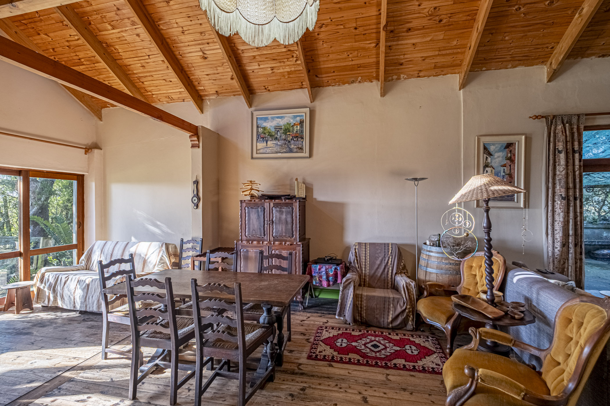 Originally built in 1912 as a stockman’s cottage on Buffelsfontein Farm, and lovingly expanded in 1946 with reclaimed English timber, the home is a rich tapestry of heritage and heart. The current owners, who have cherished this property since 1980, completed a sensitive renovation, adding a mezzanine level and a new roof while preserving the original charm. The result is a home of high ceilings, warm acoustics, and large timber decks that open out to sweeping views of mountain, forest, lake, and sea—where even whales can sometimes be spotted, and the distant roar of the ocean heard.