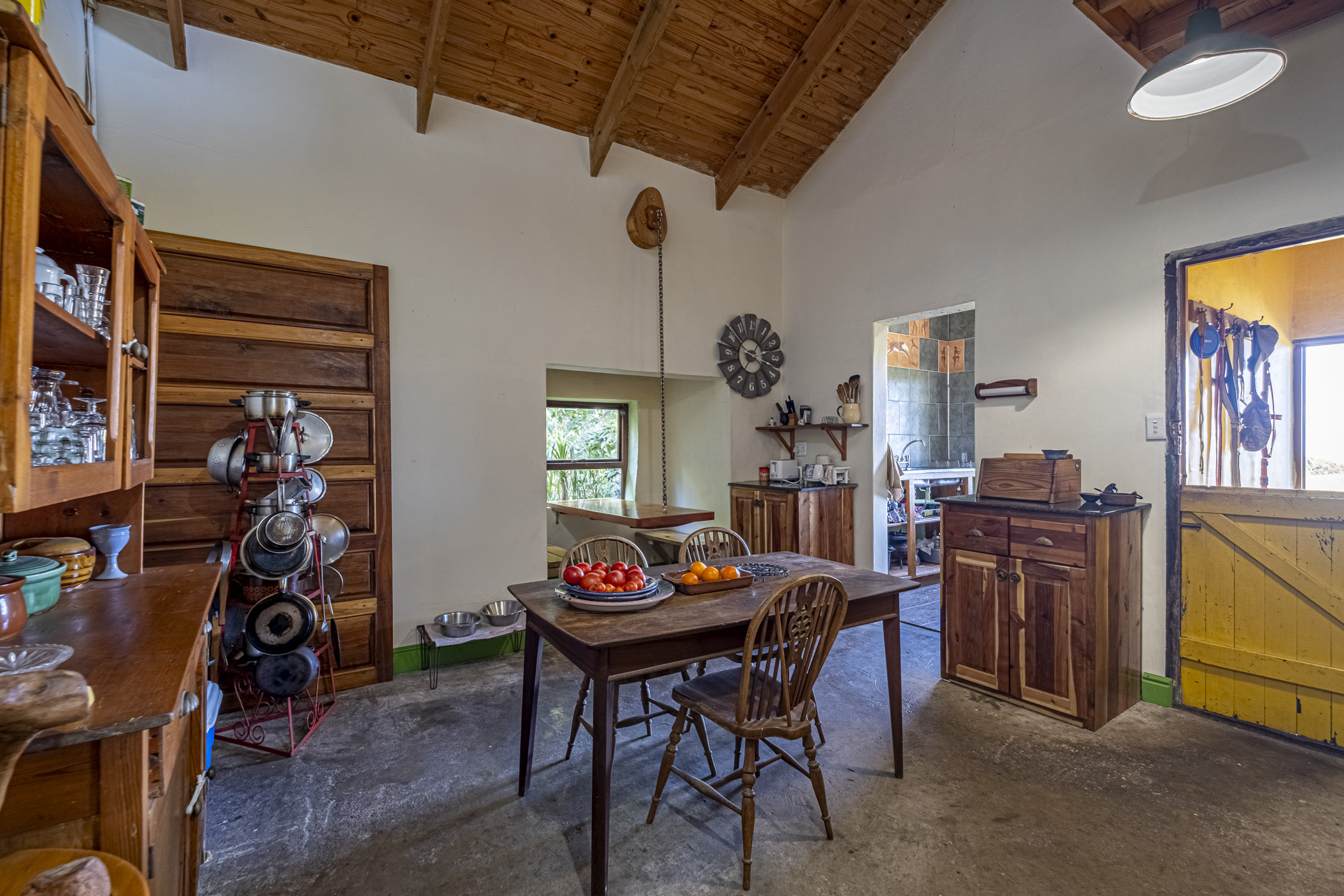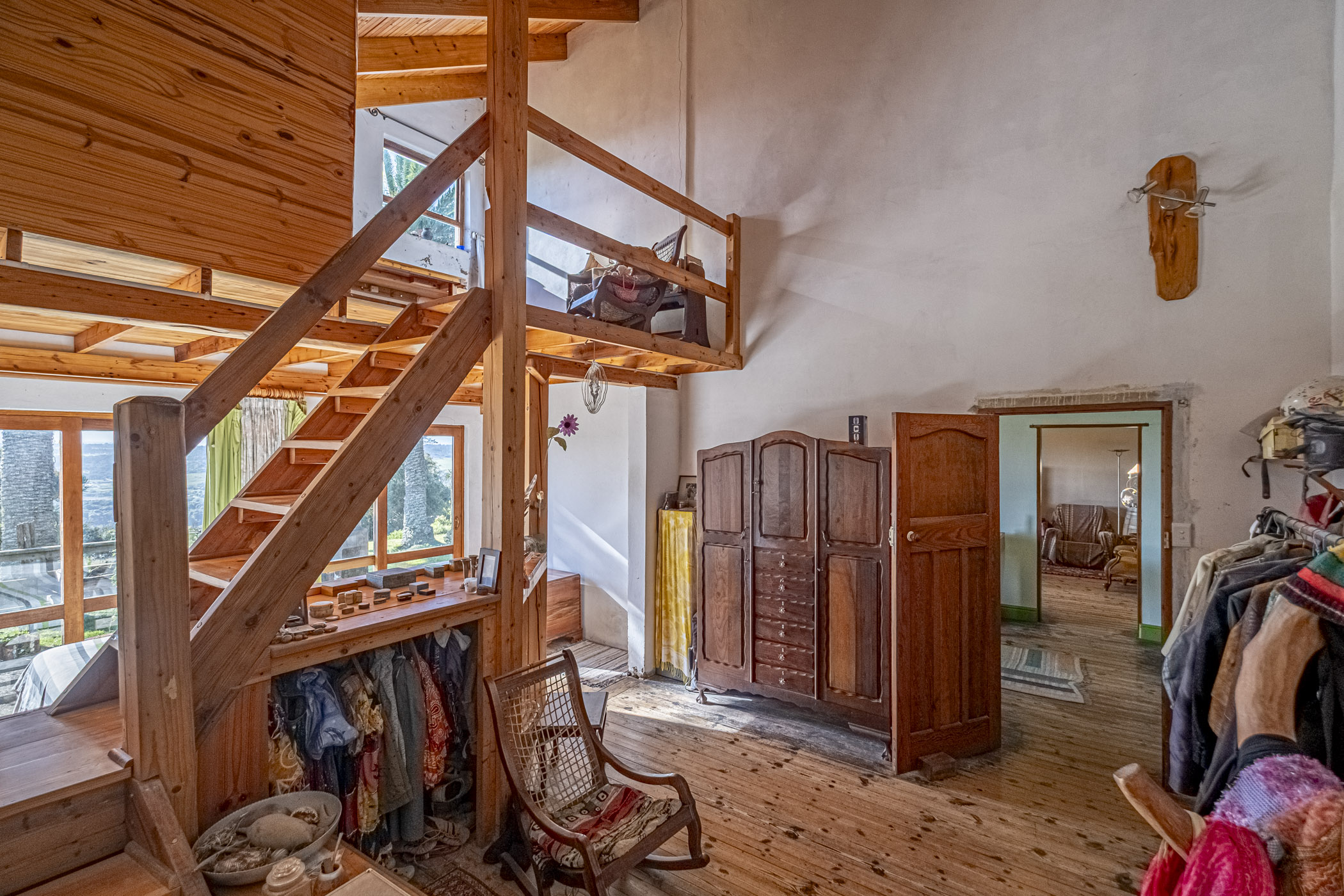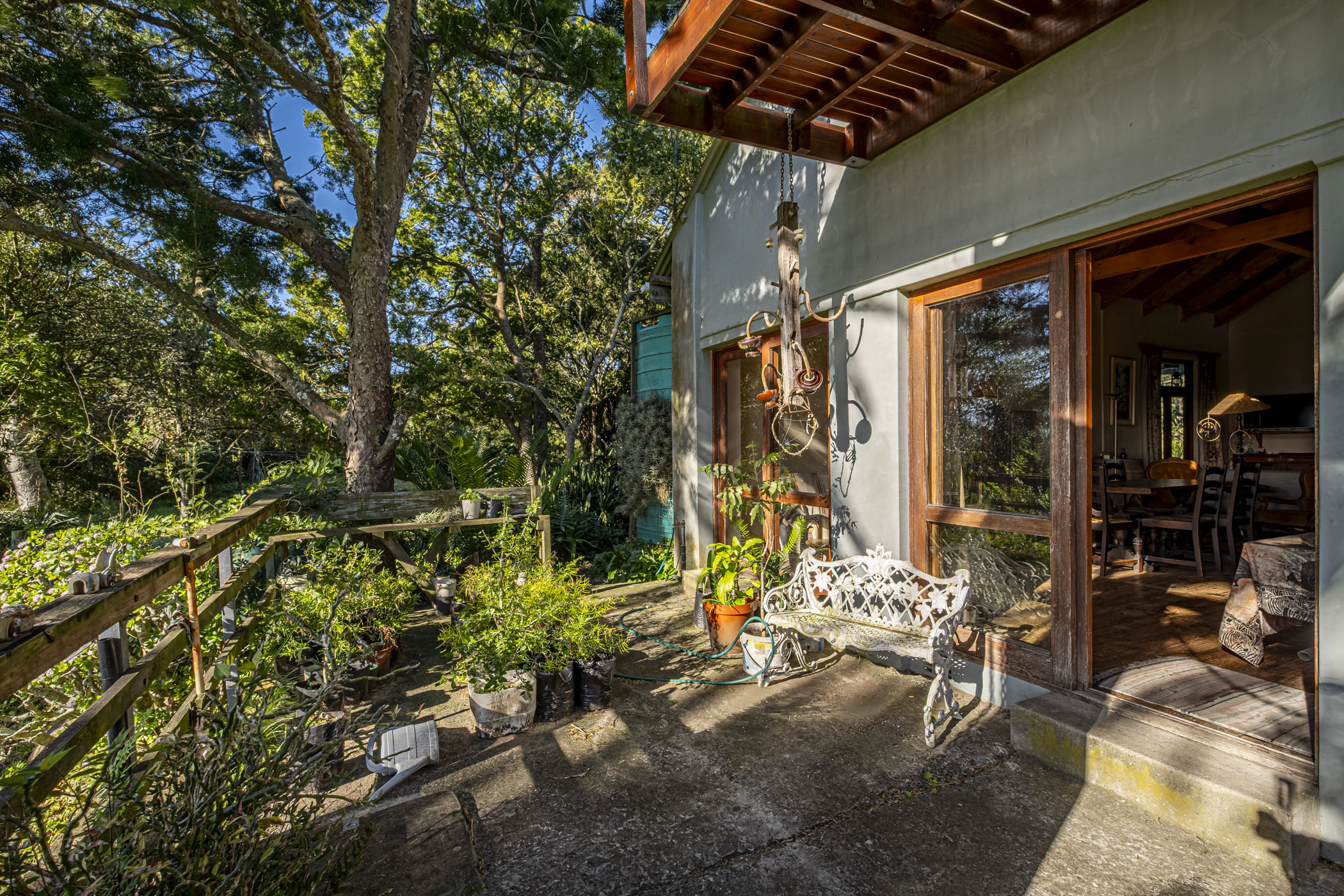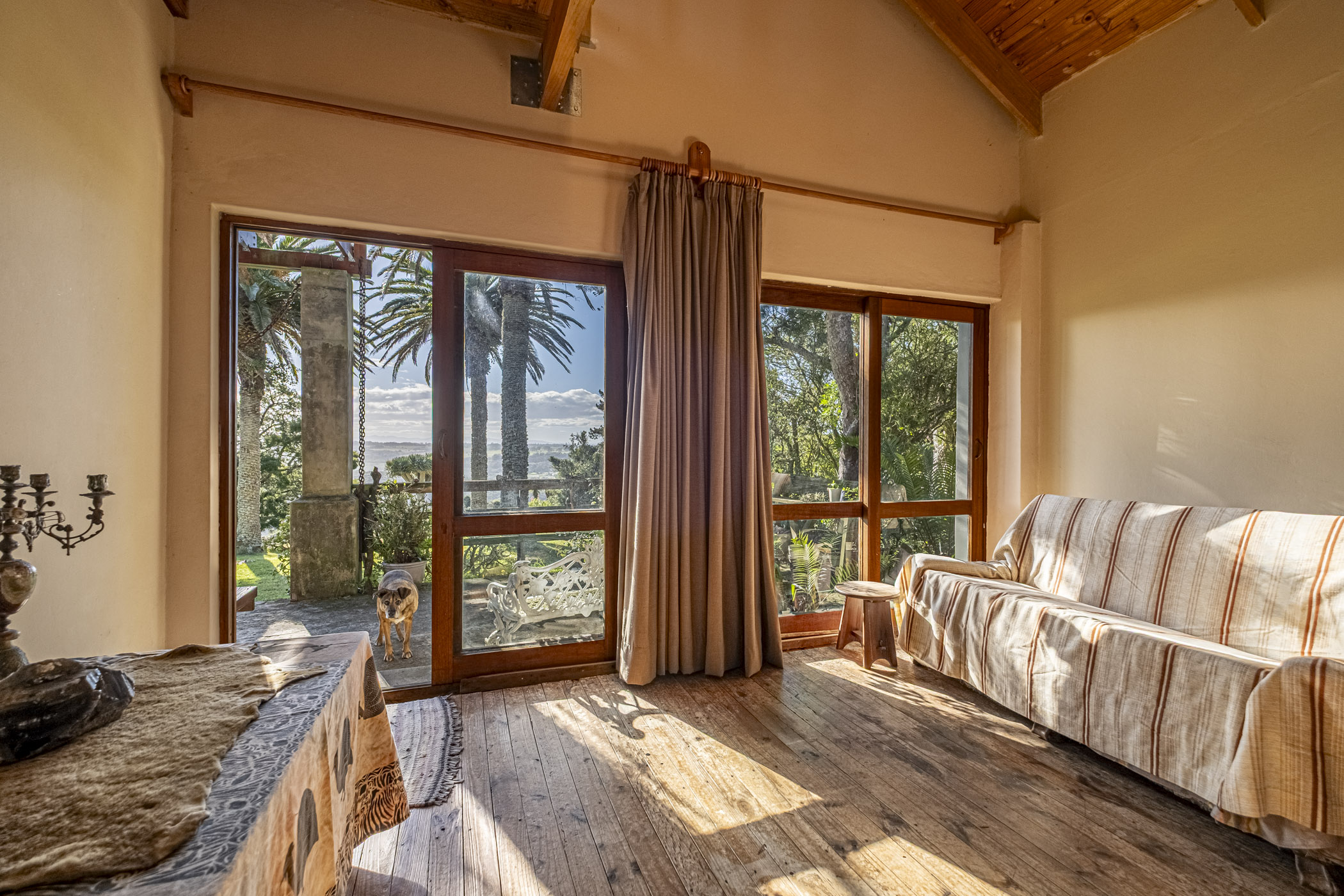 Originally built in 1912 as a stockman’s cottage on Buffelsfontein Farm, and lovingly expanded in 1946 with reclaimed English timber, the home is a rich tapestry of heritage and heart. The current owners, who have cherished this property since 1980, completed a sensitive renovation, adding a mezzanine level and a new roof while preserving the original charm. The result is a home of high ceilings, warm acoustics, and large timber decks that open out to sweeping views of mountain, forest, lake, and sea—where even whales can sometimes be spotted, and the distant roar of the ocean heard.