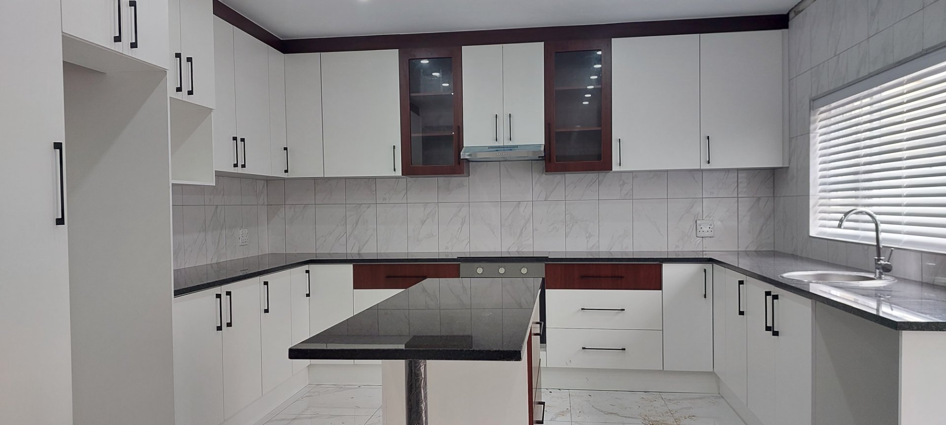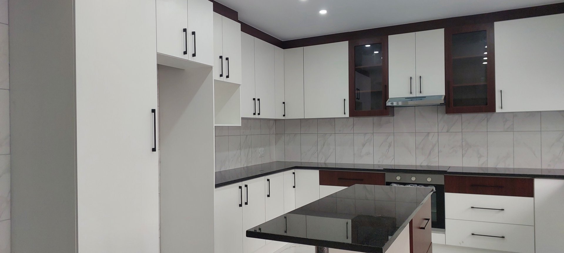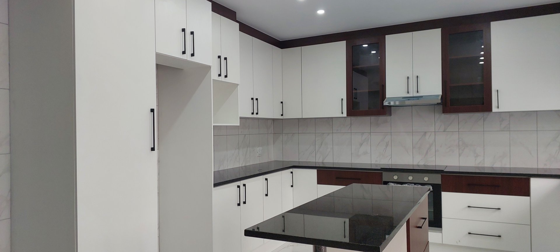 Modern kitchen with ample built in cupboards, undercounter stove, oven, extractor fan, plus a scullery