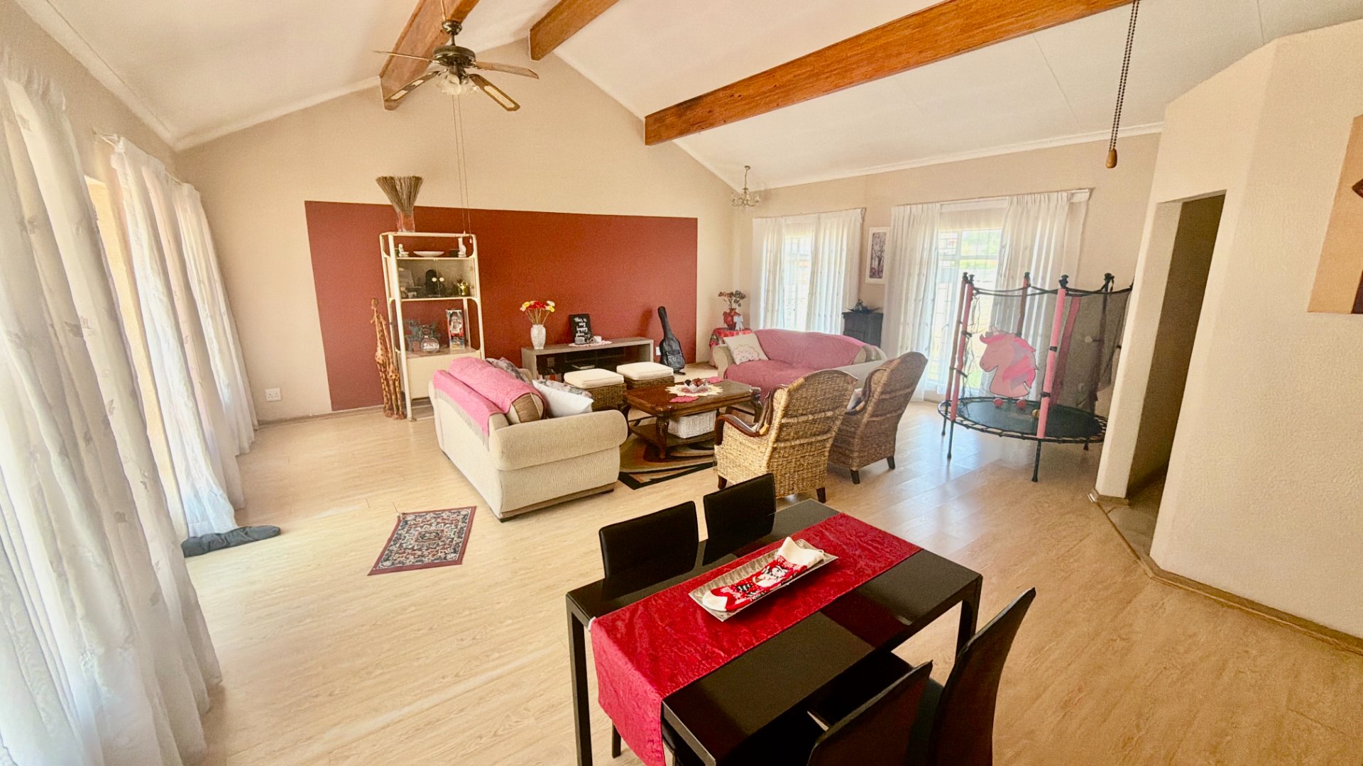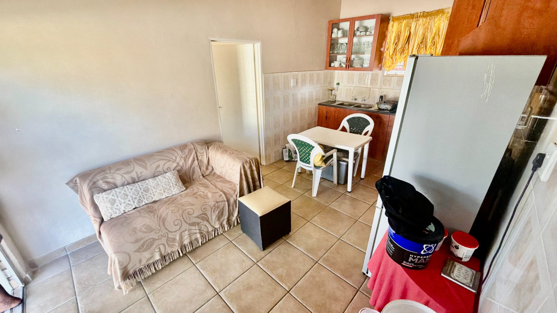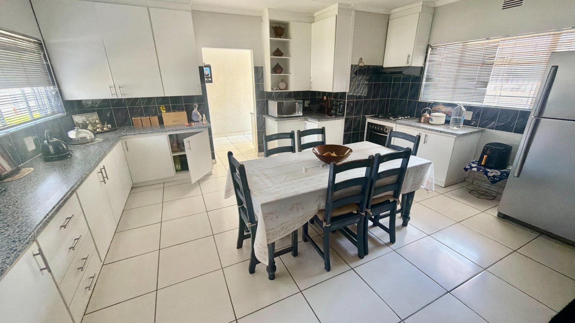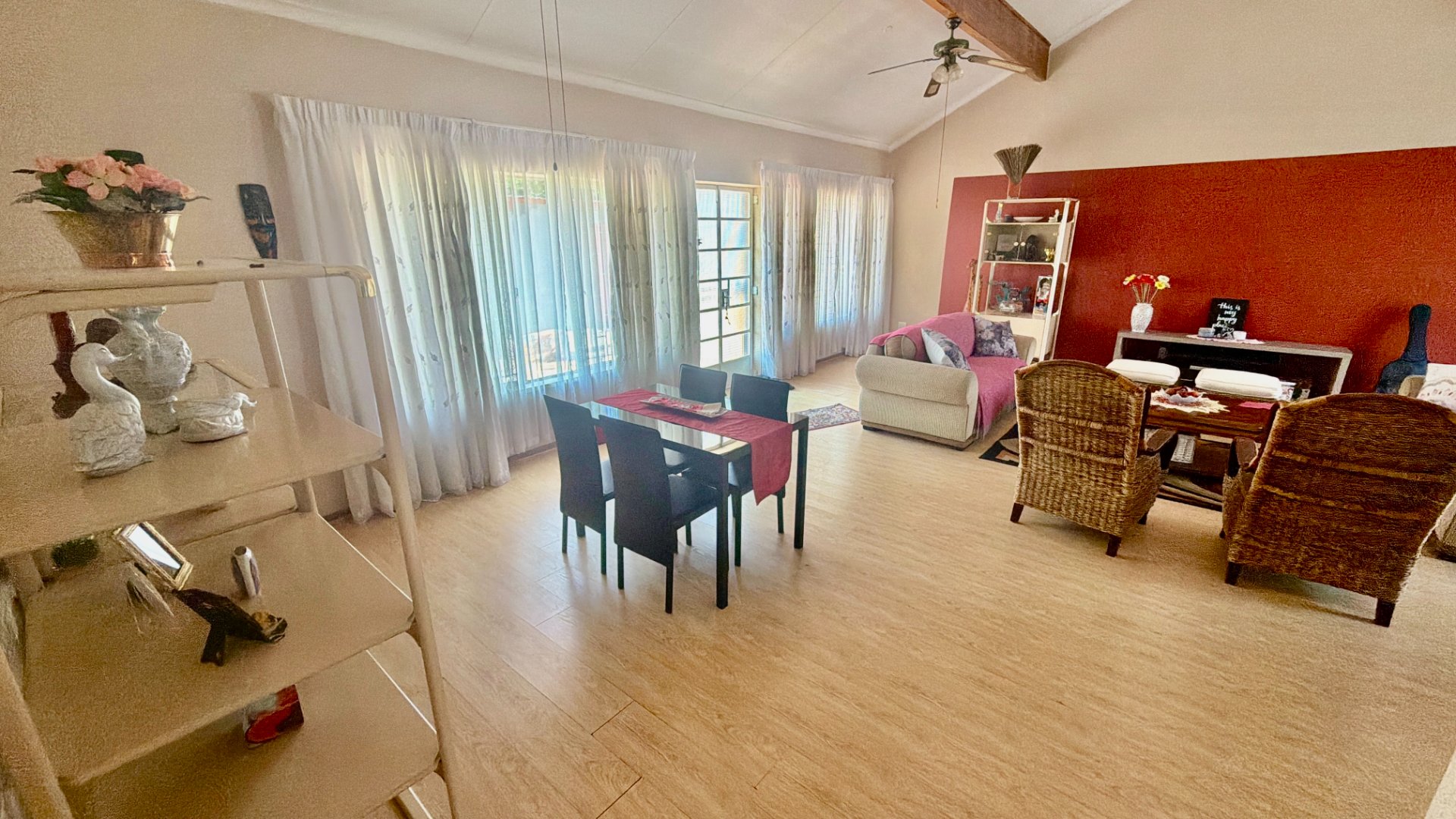 The main house features three spacious bedrooms, all fitted with laminated flooring and built-in cupboards. There are two neat bathrooms and a very spacious open-plan kitchen and dining area, flowing seamlessly into an equally spacious living room. The home is neatly painted and exceptionally well looked after, creating a warm and welcoming atmosphere throughout.