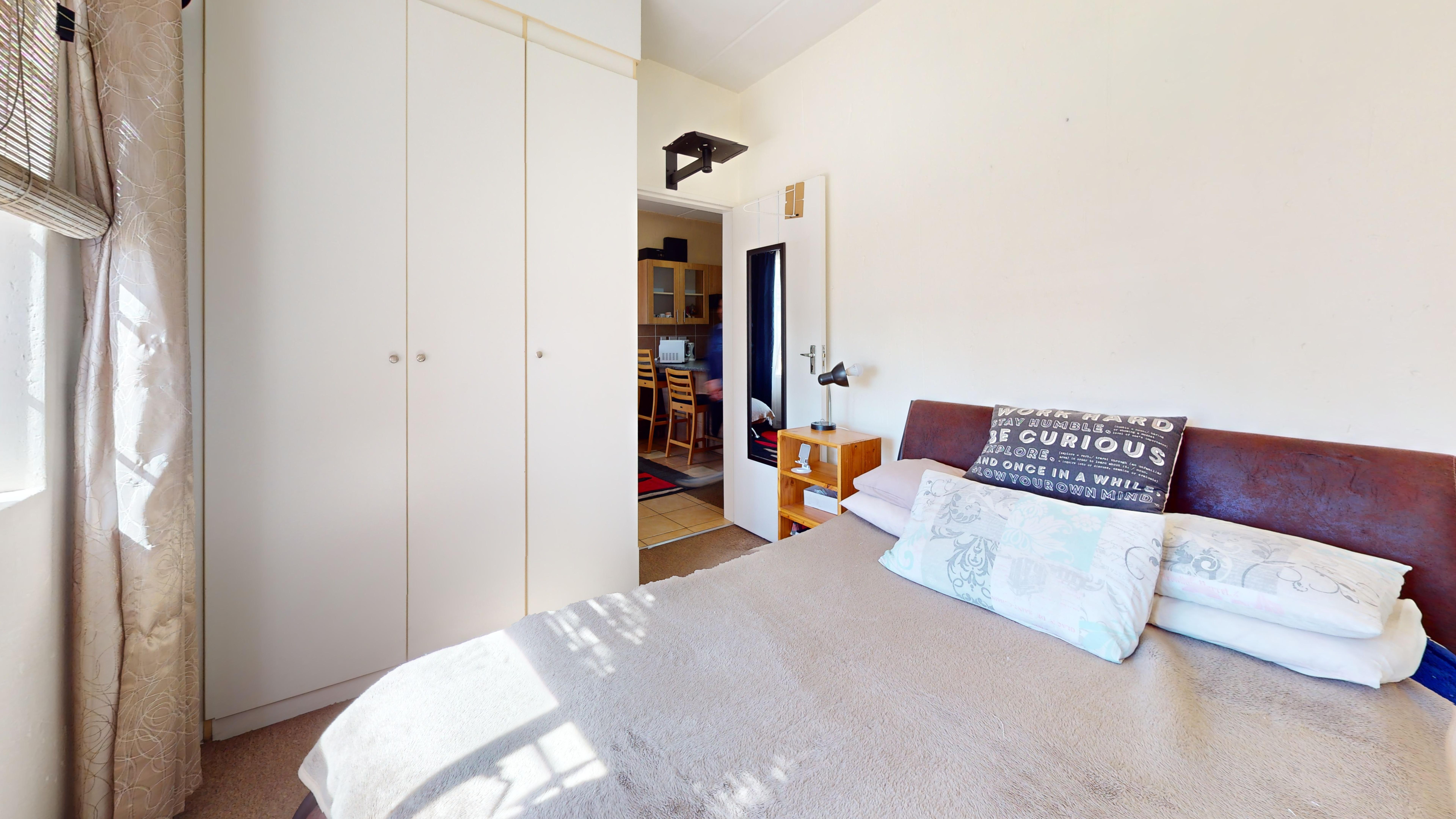 The generous main bedroom easily accommodates a double bed and includes built-in cupboards.