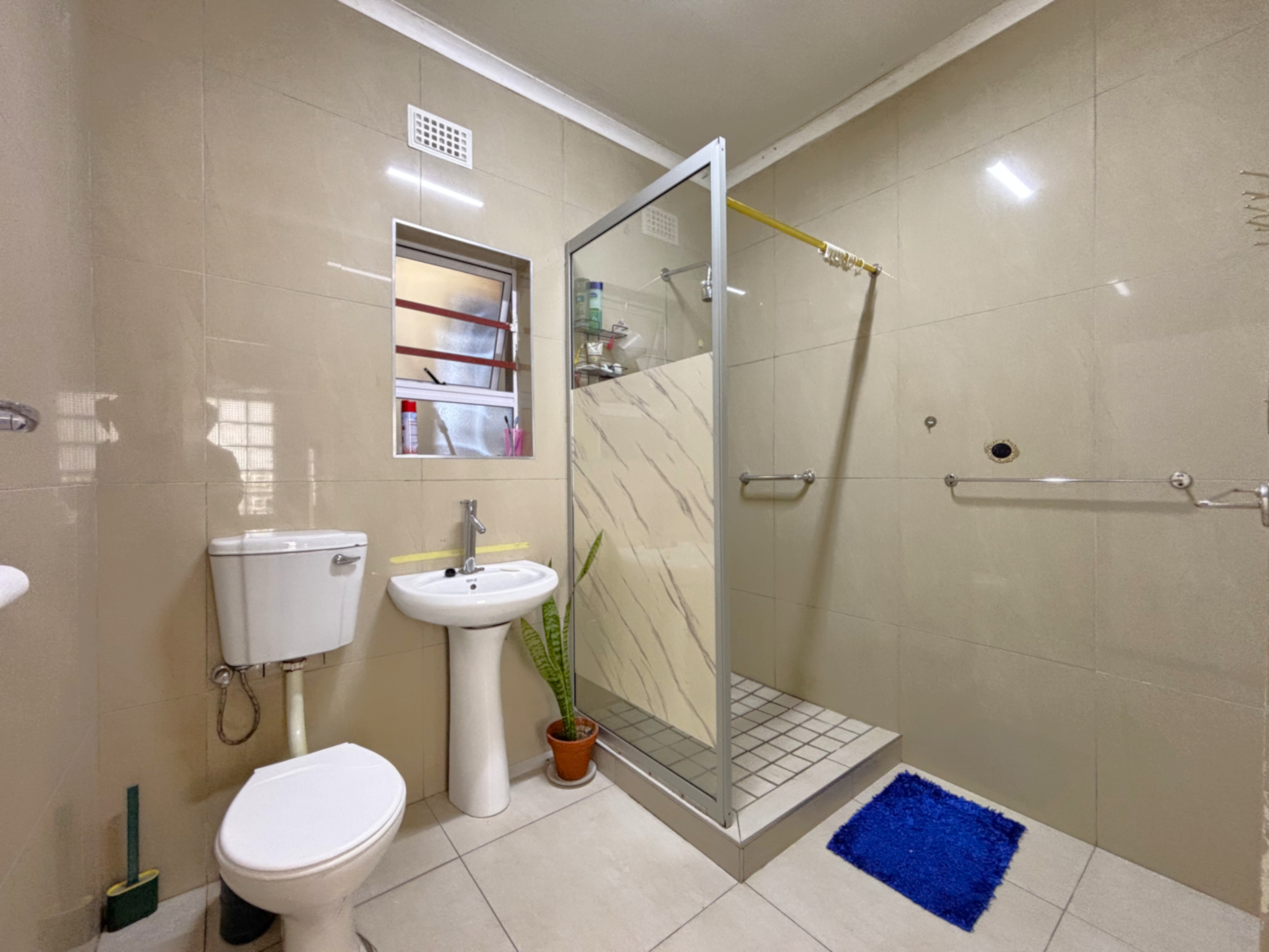 The bathroom is neatly tiled and finished with a modern touch, featuring a shower, basin, and toilet.