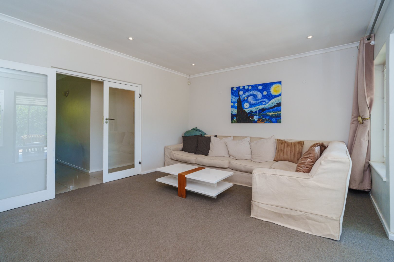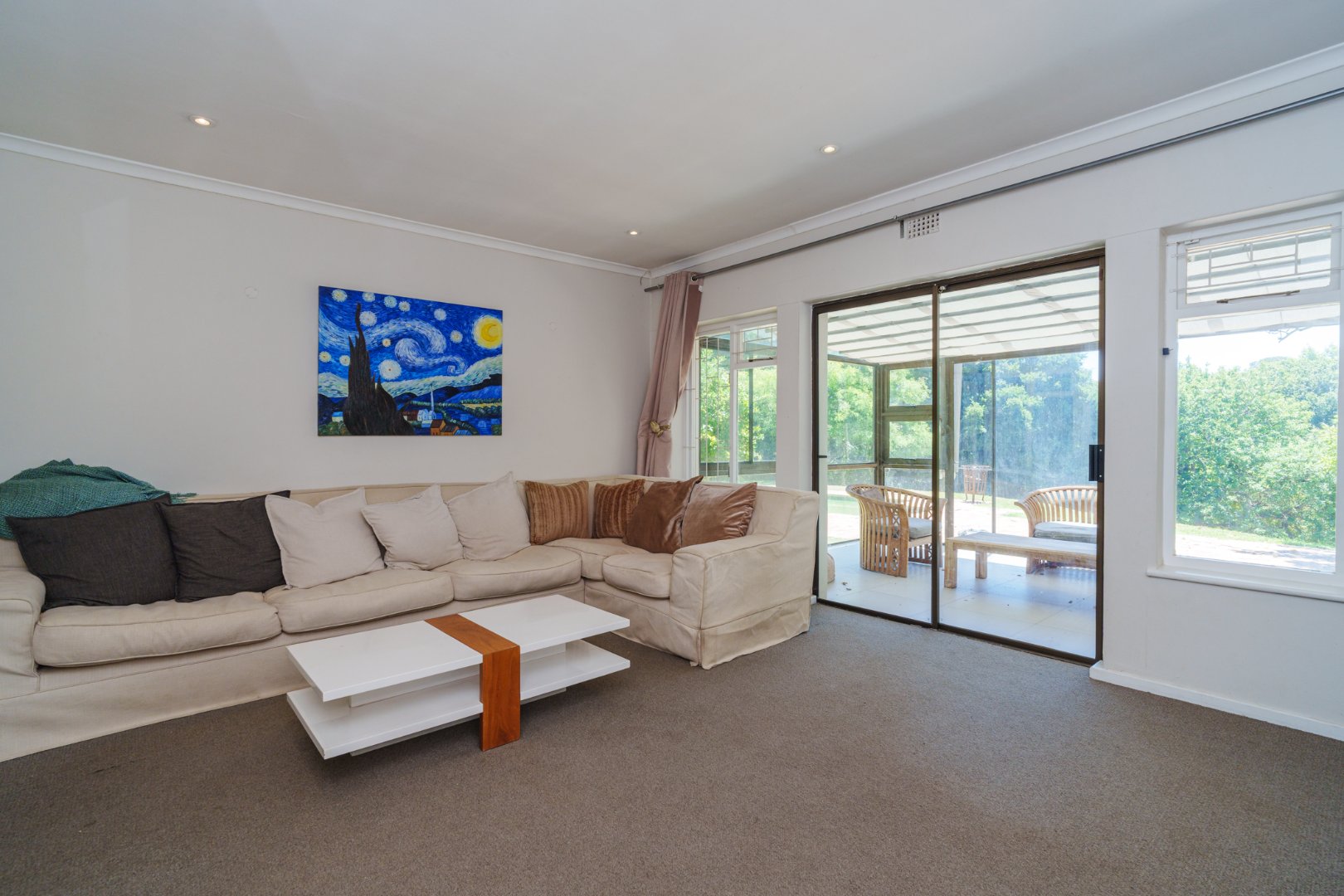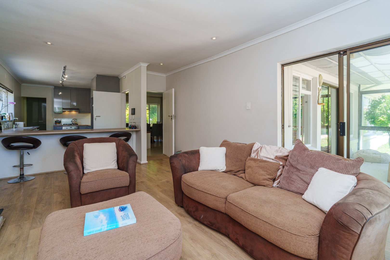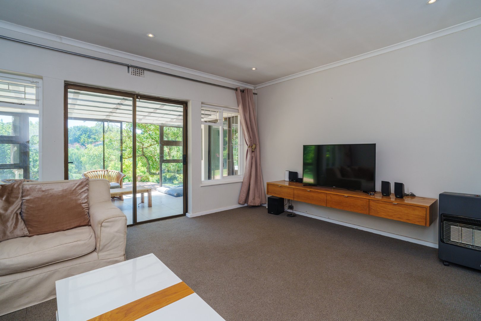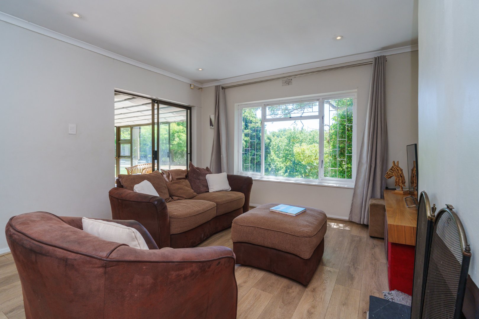 A newly designed open-plan kitchen, complete with scullery, flows effortlessly into a TV lounge warmed by a wood-burning fireplace — from here, large sliding doors lead into a luminous sunroom, inviting in the outdoors and the afternoon light.