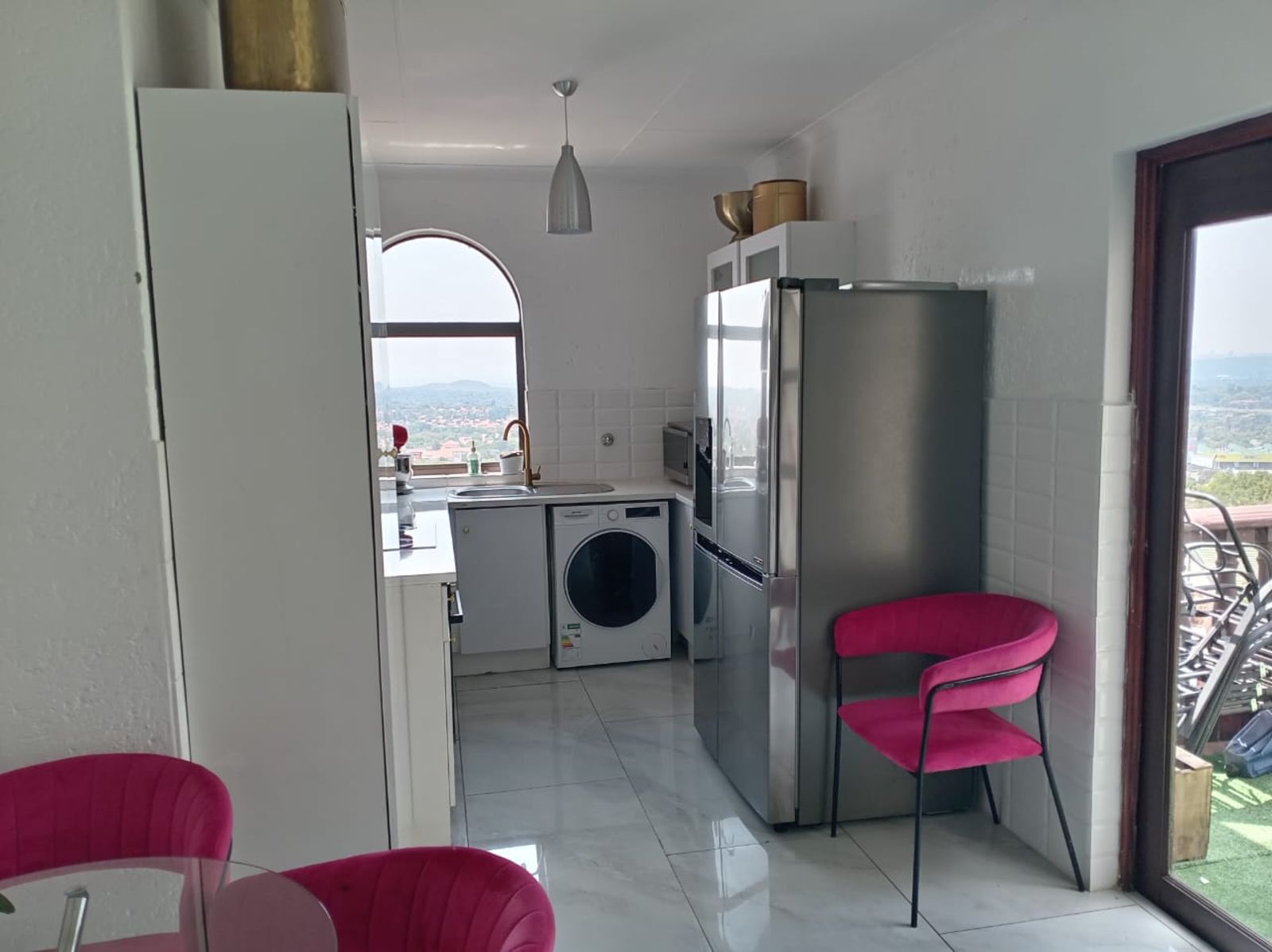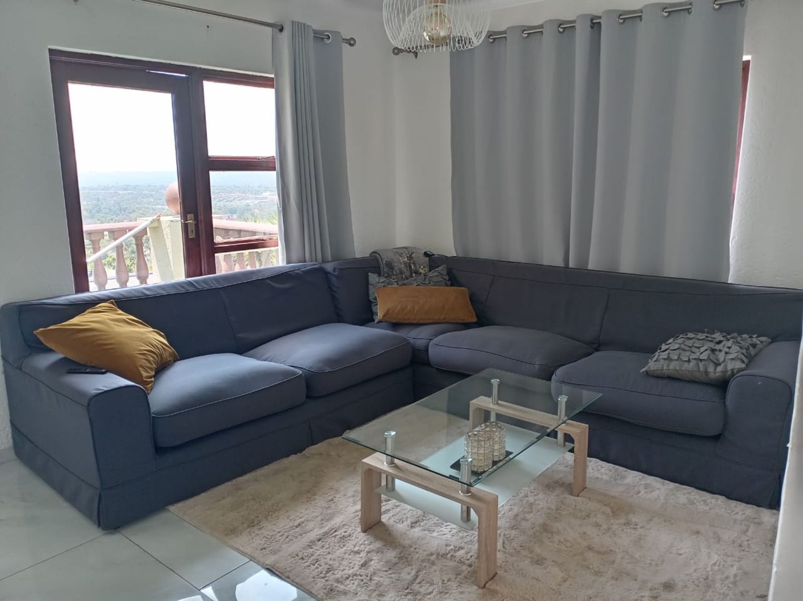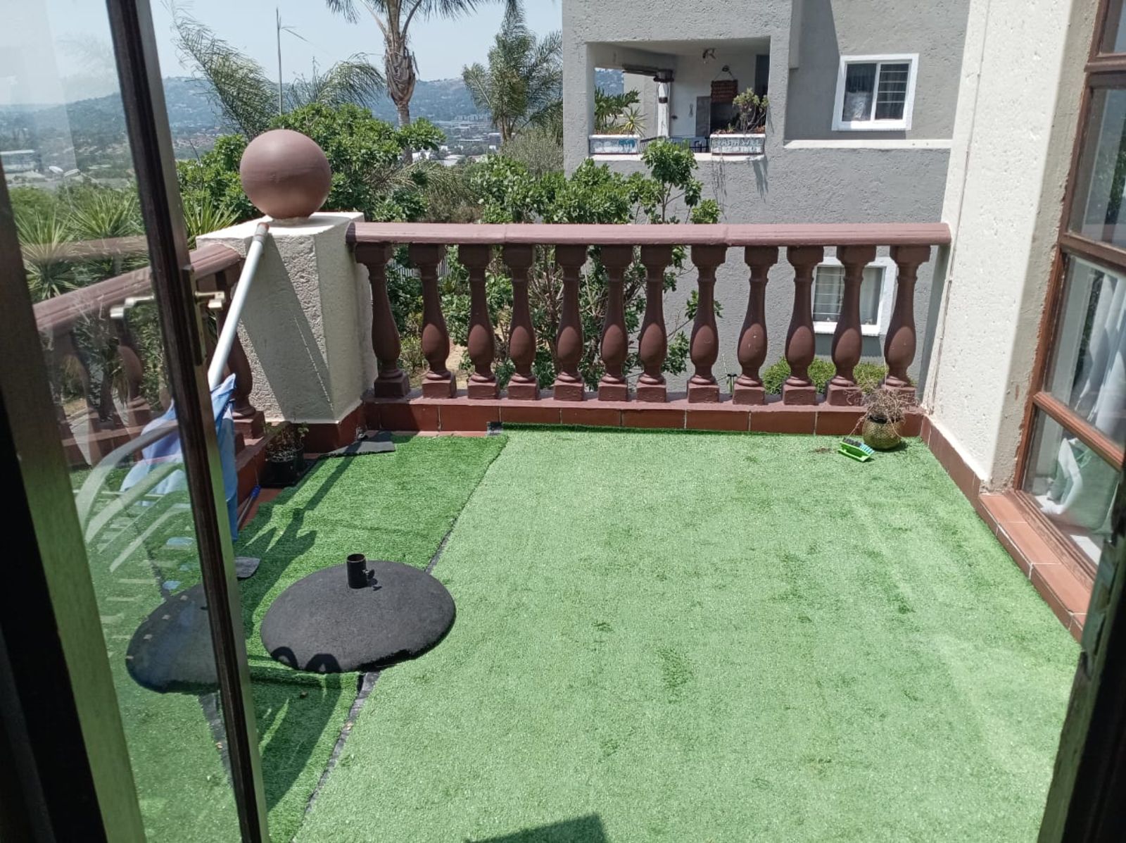 Spacious living area with high-gloss ceramic tiles, leading onto a balcony with astro turf and stunning views — perfect for morning coffee or evening sunsets