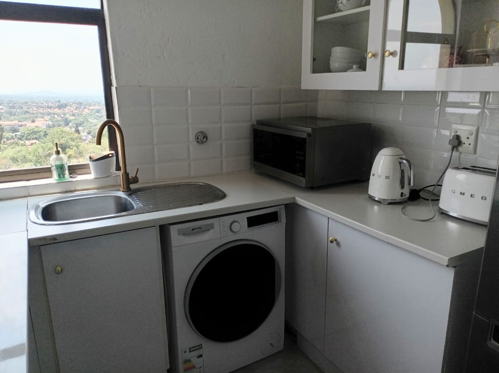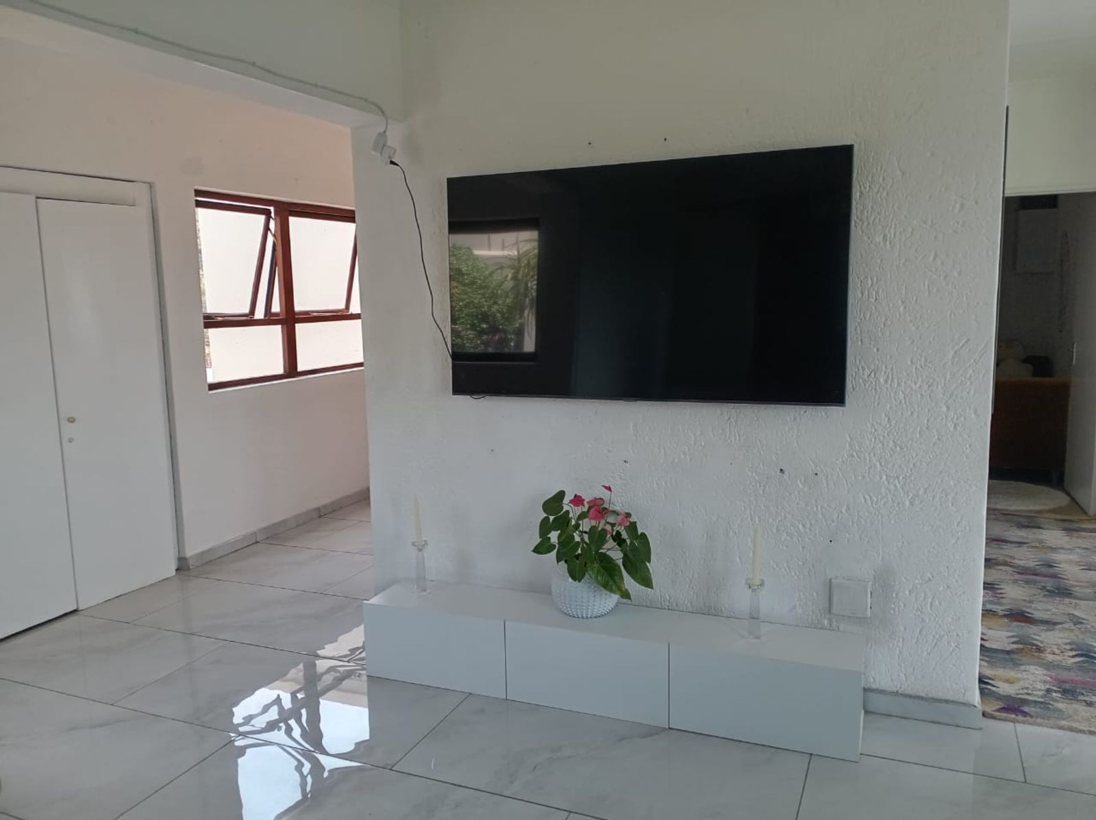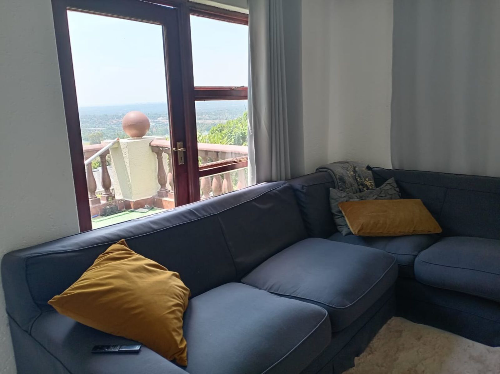 Spacious living area with high-gloss ceramic tiles, leading onto a balcony with astro turf and stunning views — perfect for morning coffee or evening sunsets