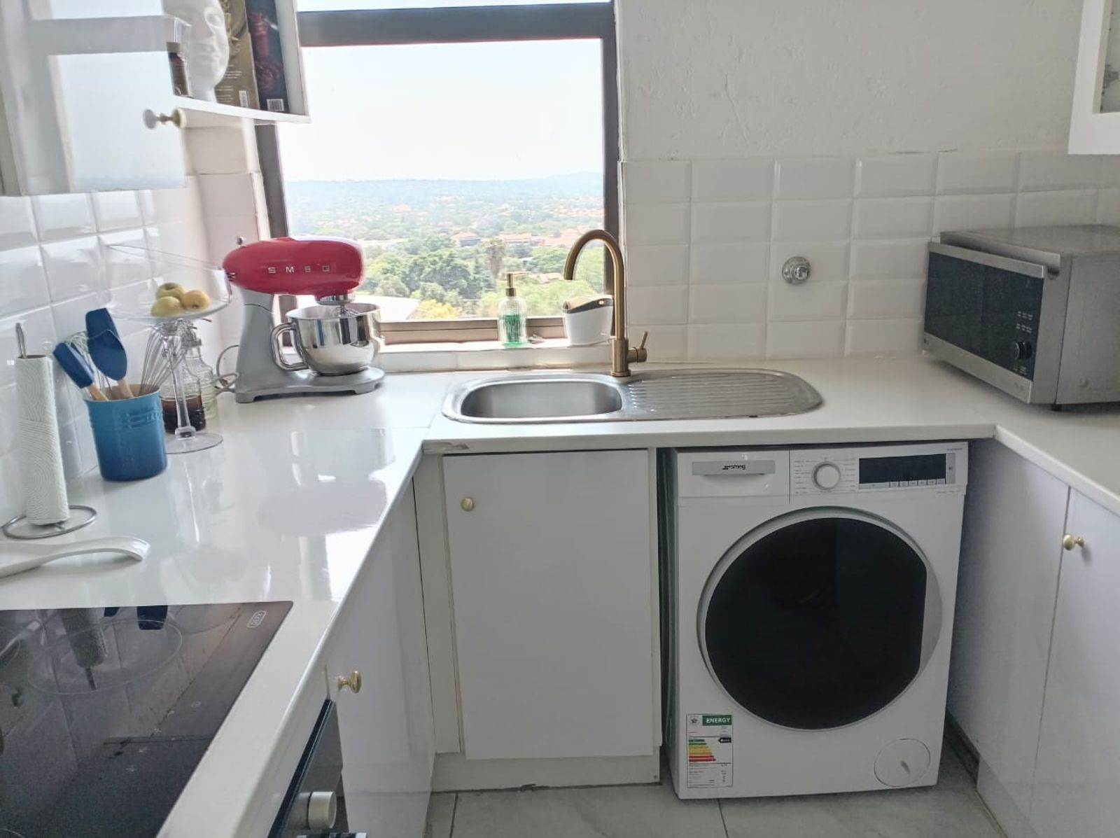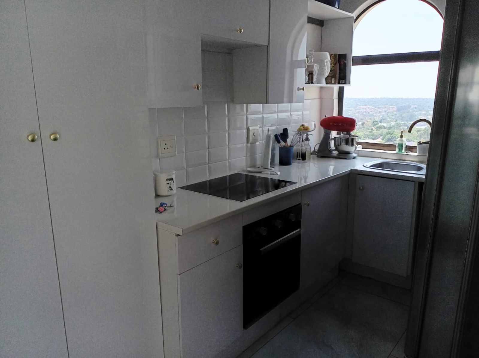 Stylish open-plan kitchen featuring glossy cabinetry, glass-top stove, and appliance connection