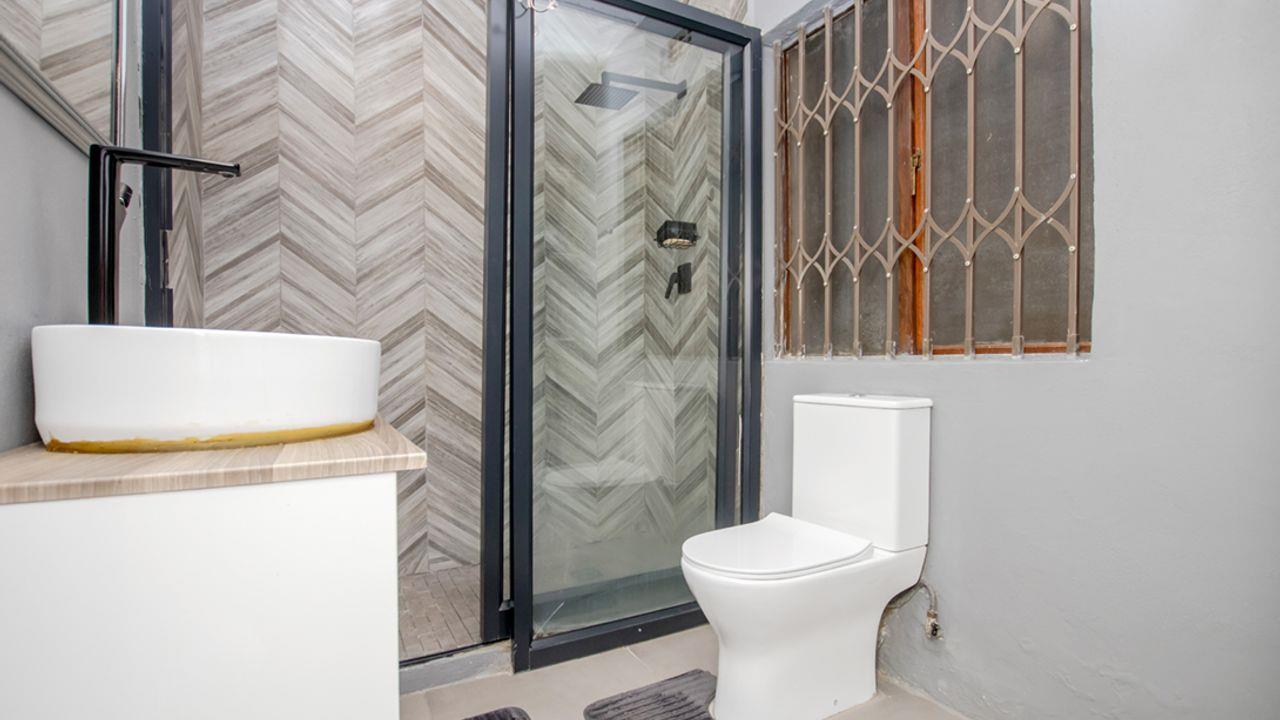 Indulge in the great bathroom, featuring a luxurious shower, basin, and toilet, where every detail has been meticulously crafted for comfort and convenience.