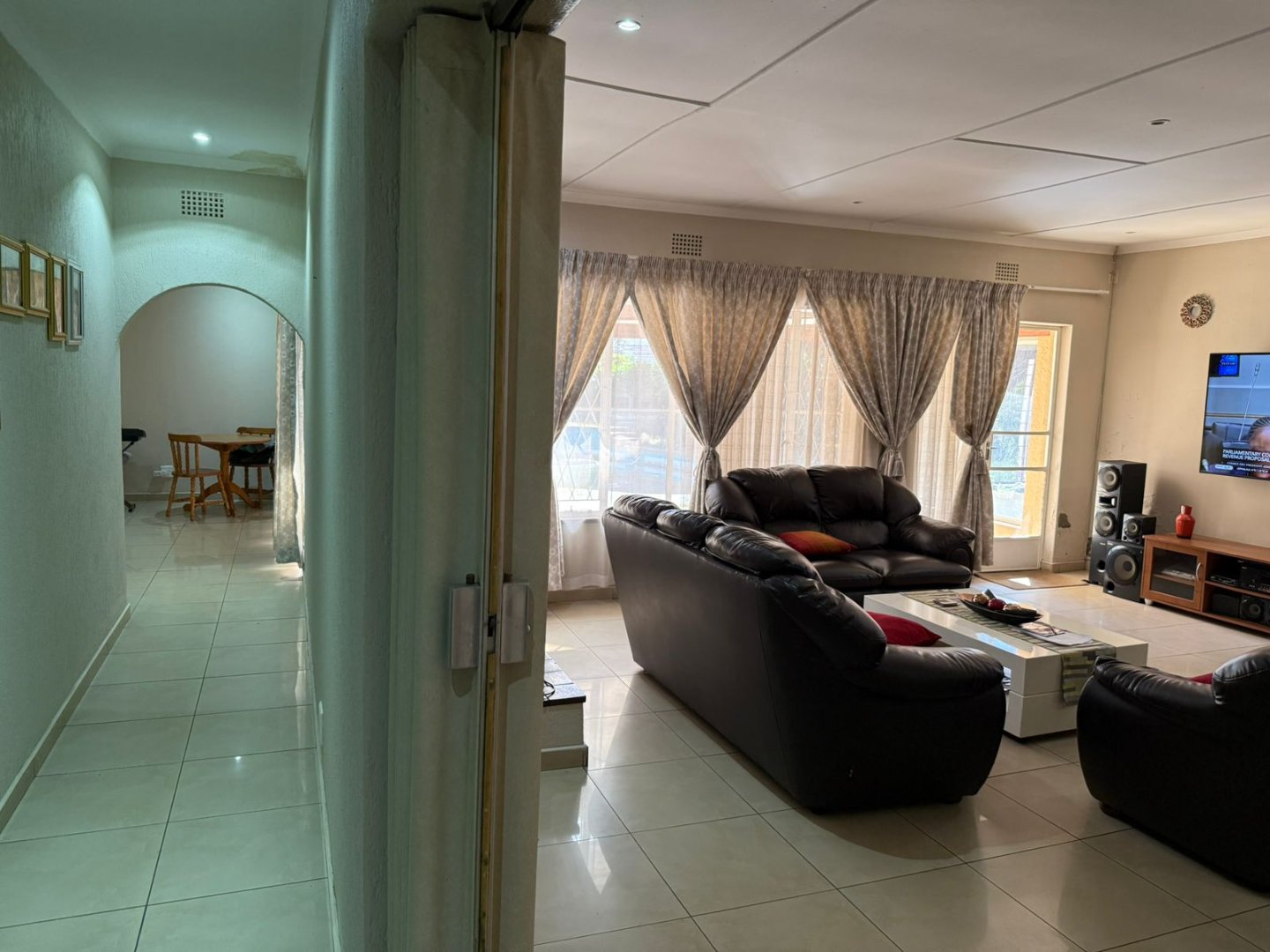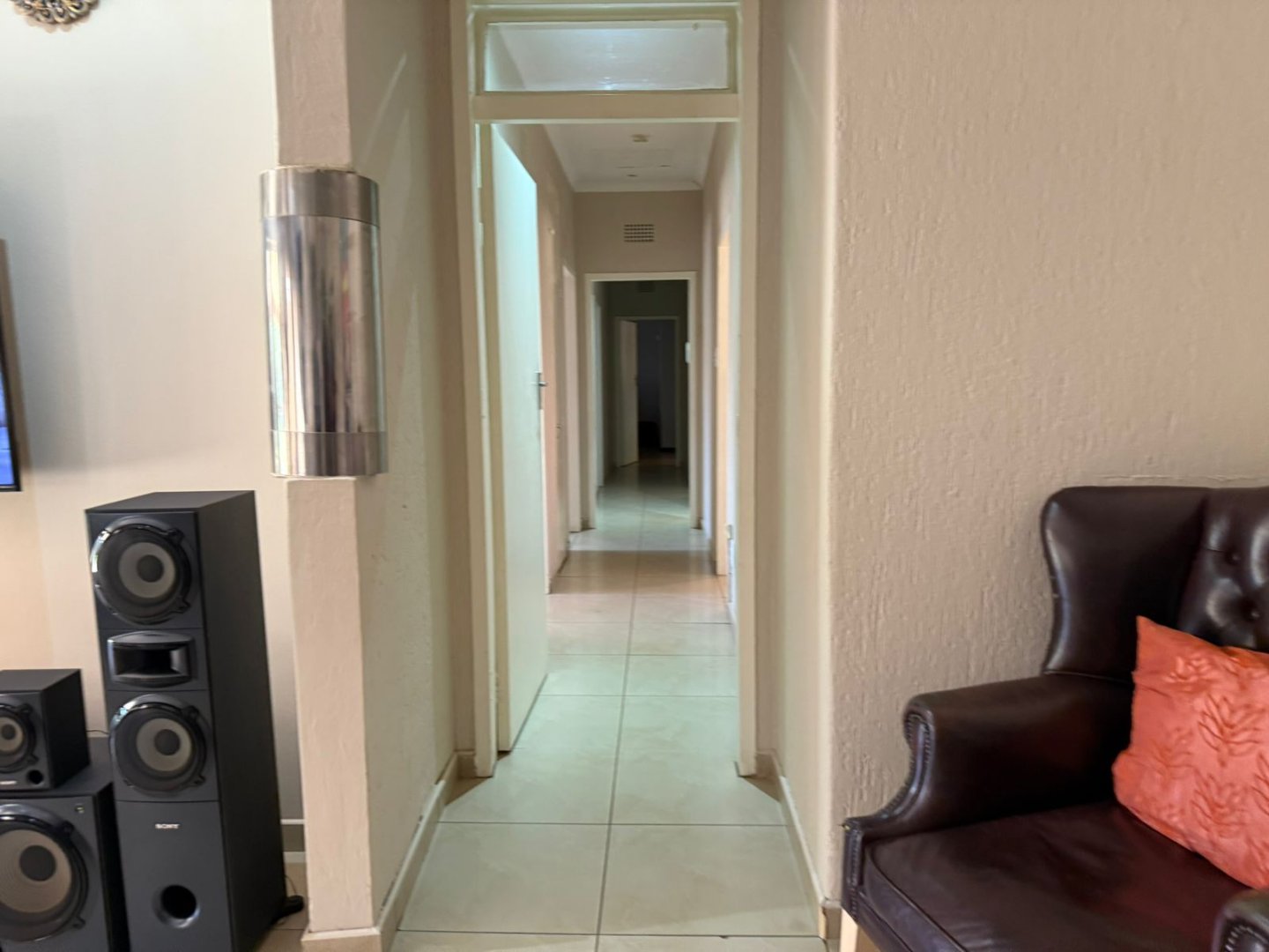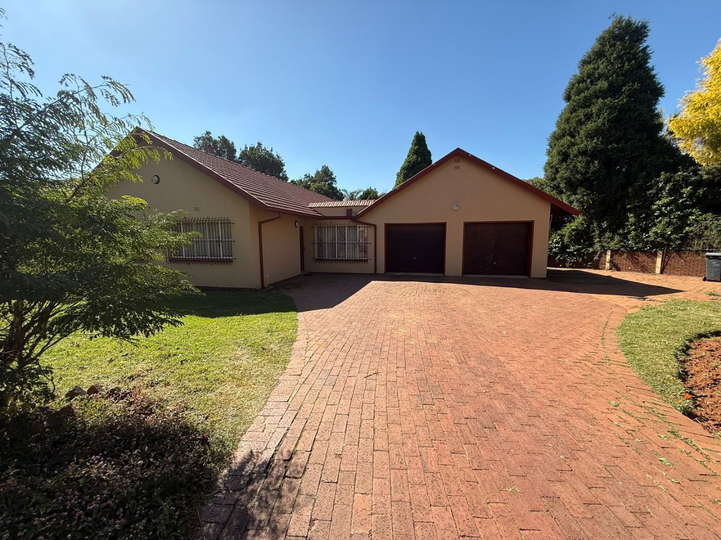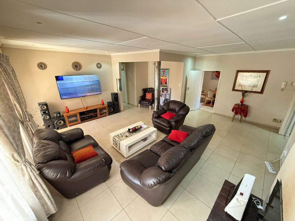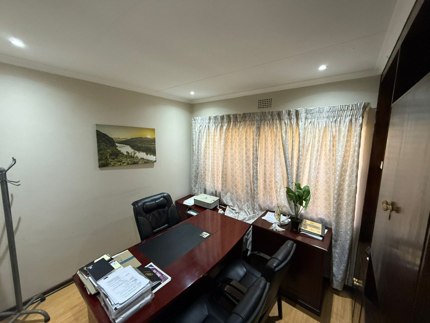 A spacious lounge and separate dining room, kitchen with scullery and independent laundry room, four well-proportioned bedrooms with laminated flooring and built-in cupboards, two full bathrooms including a main en suite with its own private lounge retreat, plus a roomy study with fitted shelving and cupboards—perfect for a home office.